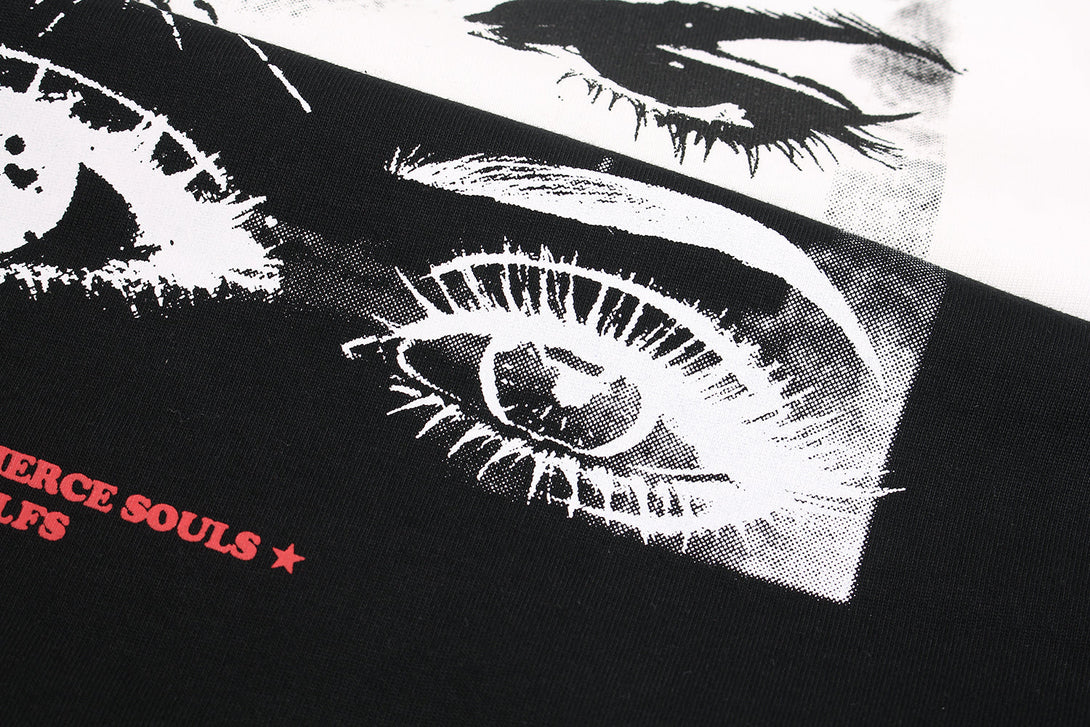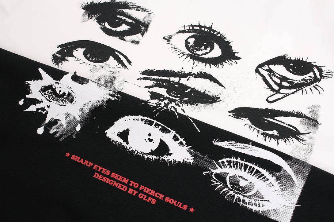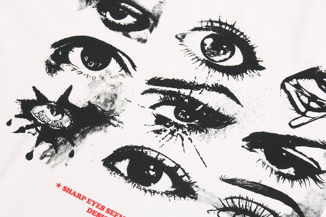 The thoughtfully arranged eye motifs create a piece that functions as wearable art - each glance reveals new details and interpretations, making this tee a conversation starter that reflects the wearer's appreciation for creative expression and artistic depth.