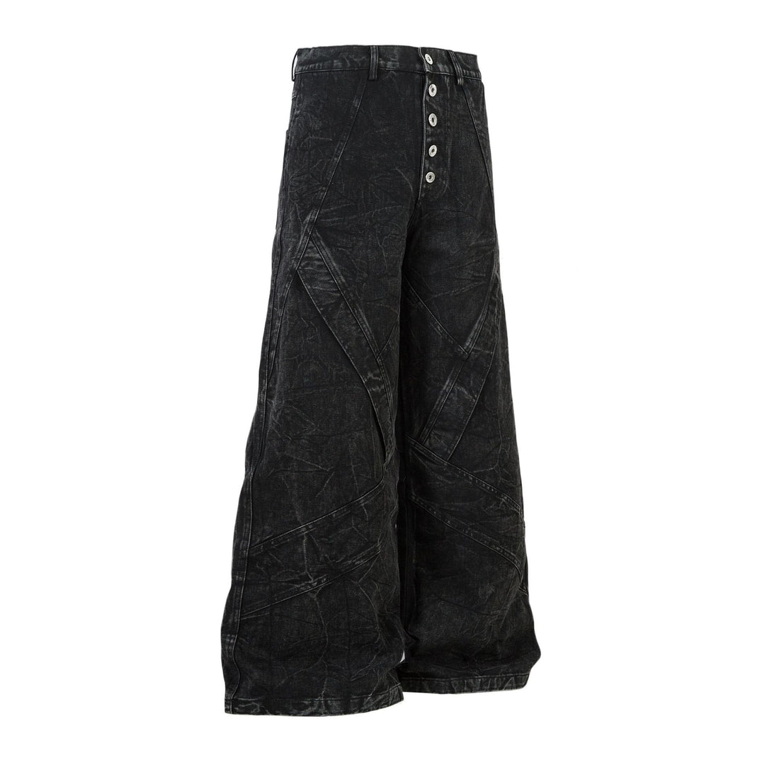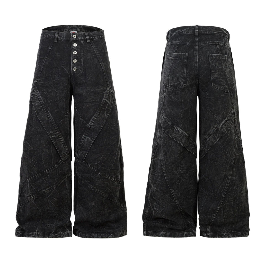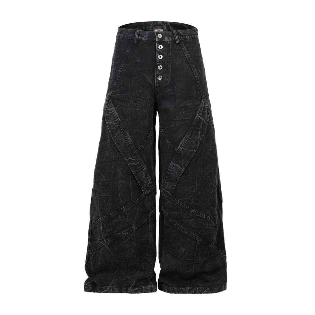 Architecture in motion. Black-washed cotton denim with precision geometric seaming that speaks to those who understand the difference between authentic and artificial.