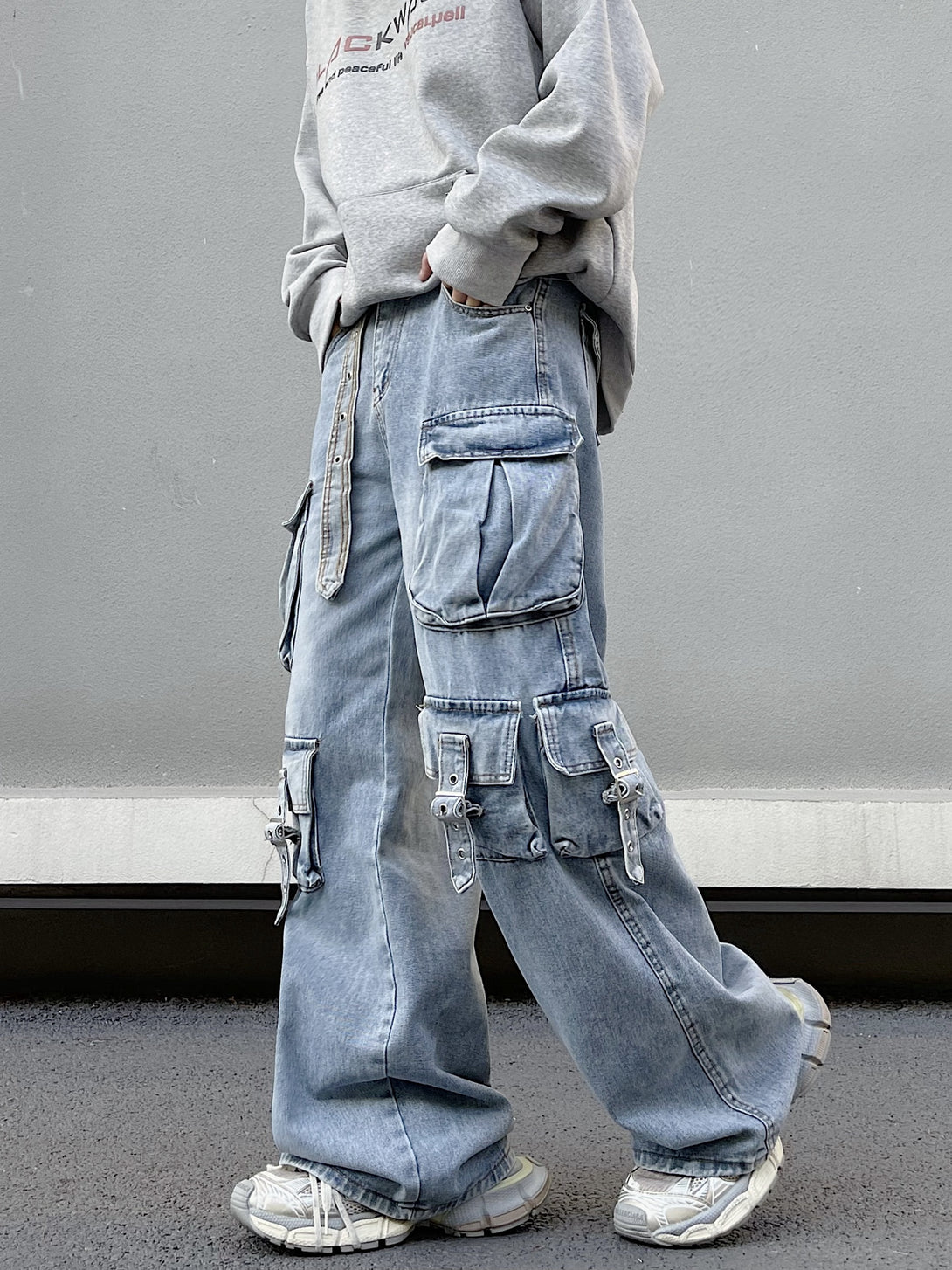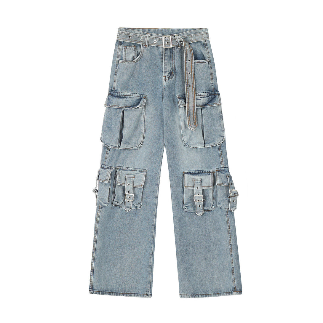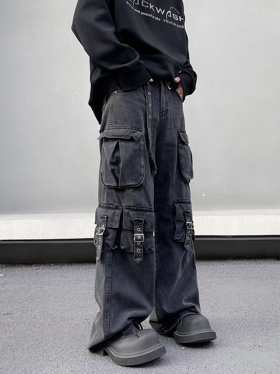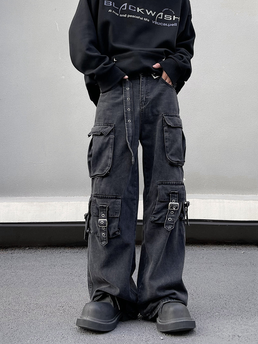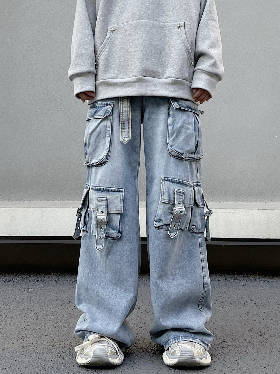 Buckle Cargo Denim Pants - Wide Leg Streetwear Trousers