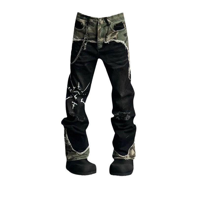 Contrasting denim panels collide in rebellious patchwork construction, merging olive military wash with black distressed denim. The straight-leg silhouette delivers edgy street presence while chain hardware and graphic details add authentic punk character.