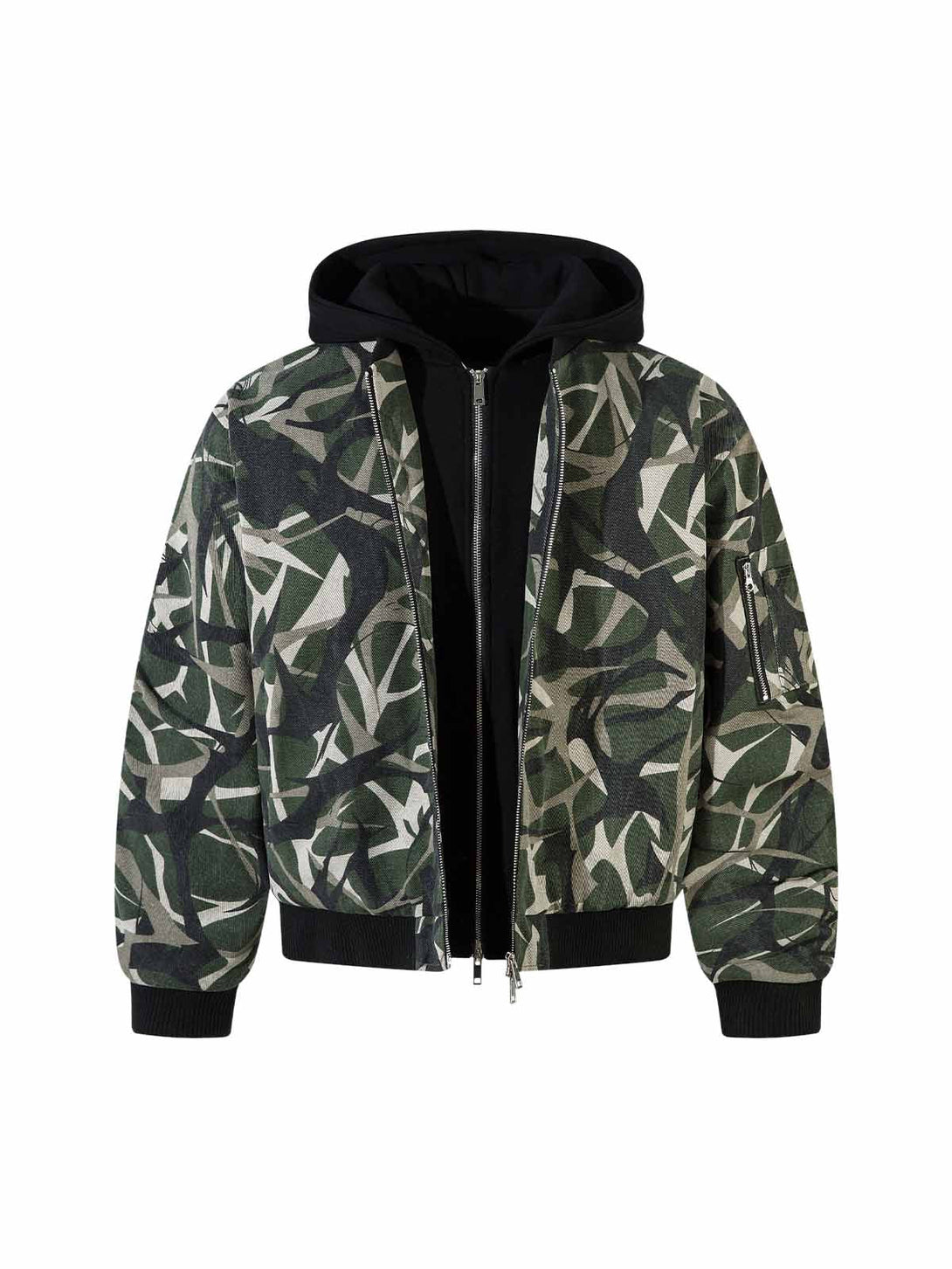 Our heavyweight hooded bomber is built from 100% cotton canvas with tree branch camouflage printing designed for urban exploration and seasonal versatility. The water-resistant coating and windproof construction create reliable weather protection while maintaining breathable comfort, while the padded insulation and contrast hood lining ensure optimal warmth retention during active wear. Classic bomber silhouette with ribbed knit trim and dual-zip functionality provide adaptable styling that transitions seamlessly from outdoor adventures to city streets.