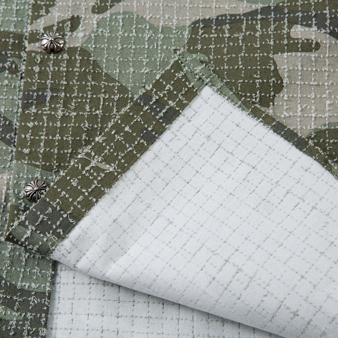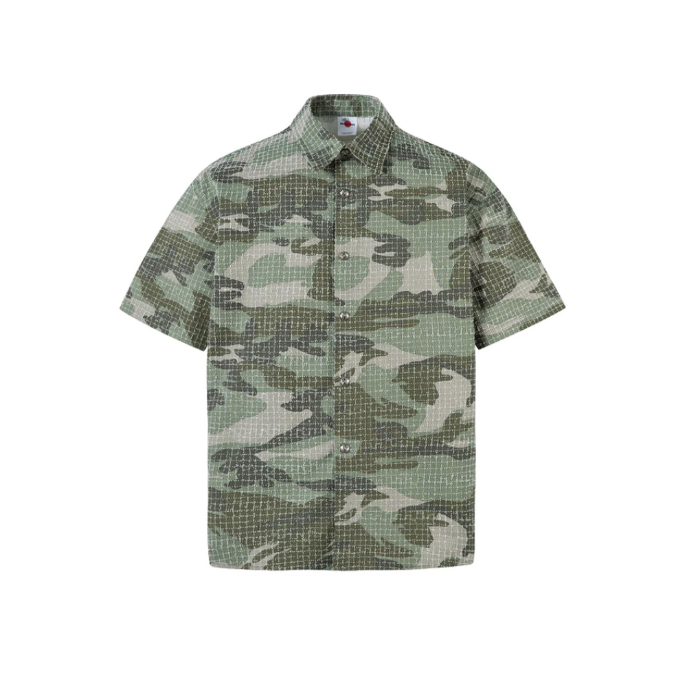 Camouflage Short Sleeve Shirt is built from premium cotton with grid-overlay camouflage designed to reimagine military aesthetics through contemporary design innovation. The regular-fit construction and classic turn-down collar create versatile proportions, while our cross-embossed metal buttons add symbolic weight and tactile luxury to traditional camo styling. Grid pattern overlay and meaningful hardware details create pieces that merge spiritual symbolism with elevated streetwear sophistication.