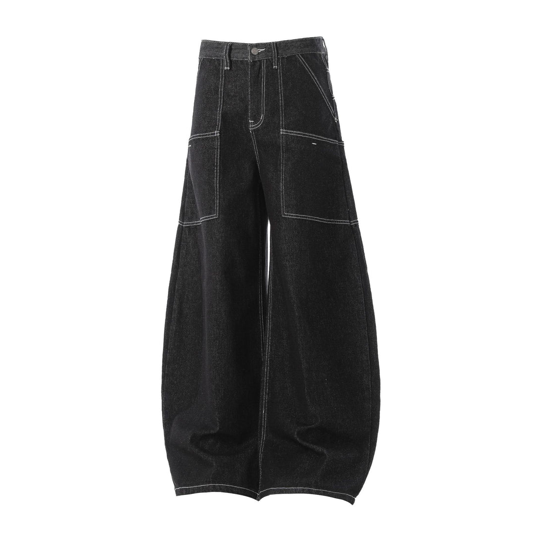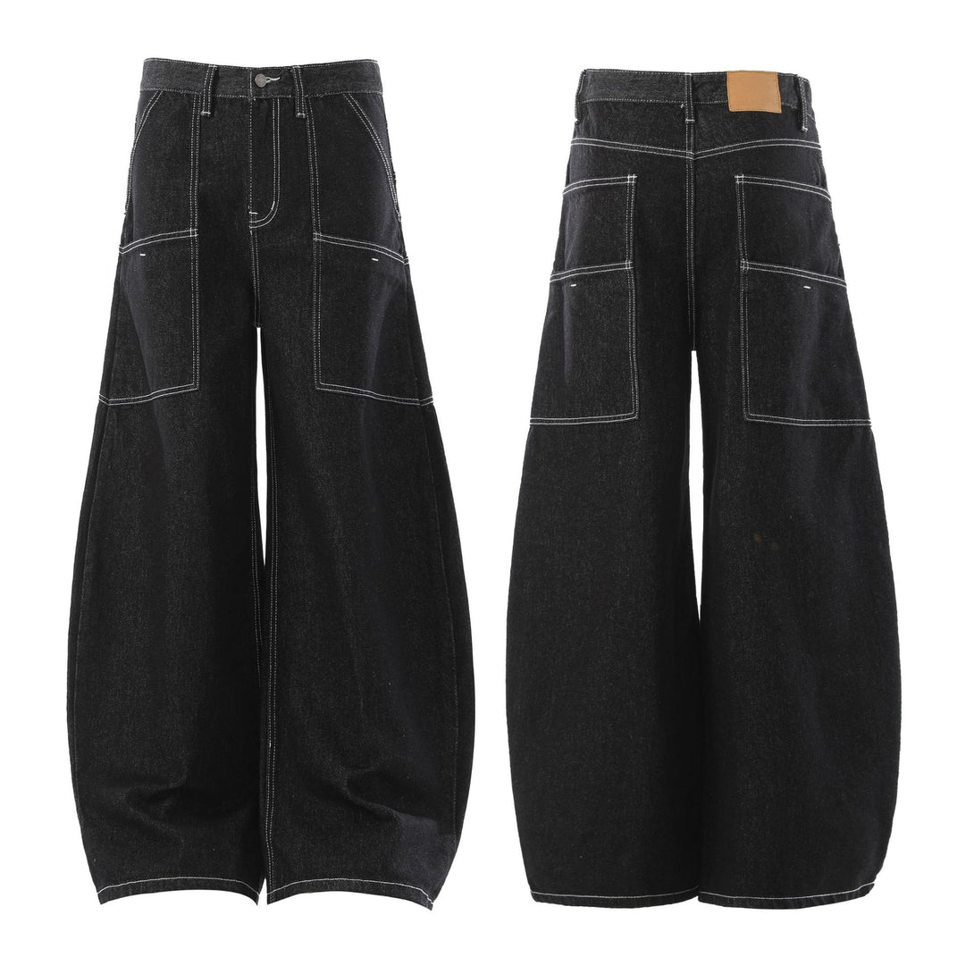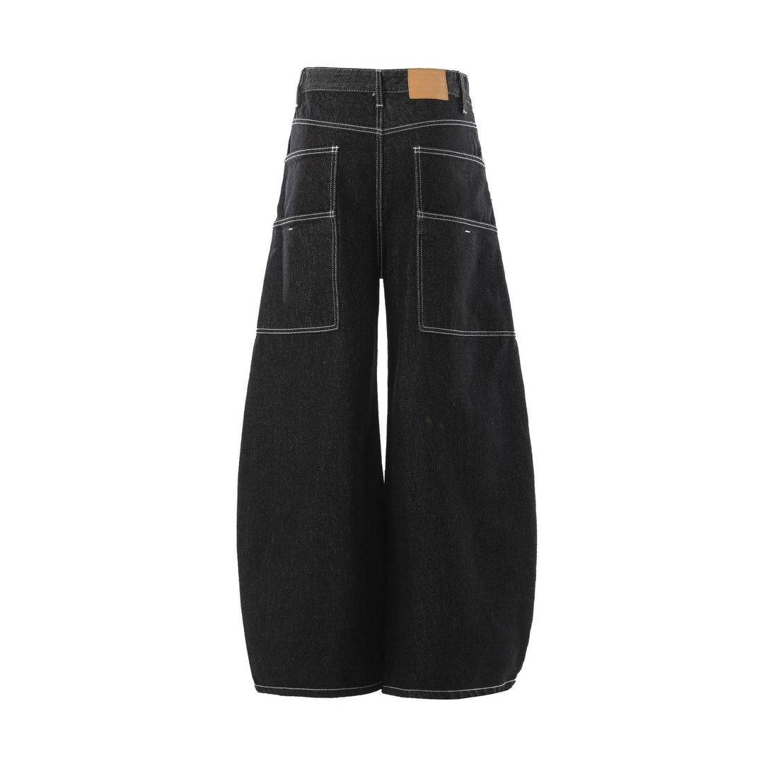 Oversized proportions meet technical precision in this deconstructed denim silhouette. Wide-leg construction tapers to gathered ankles, creating an avant-garde profile that challenges conventional fits. Strategic contrast stitching traces architectural seam lines throughout, transforming classic black denim into a statement of intentional design.