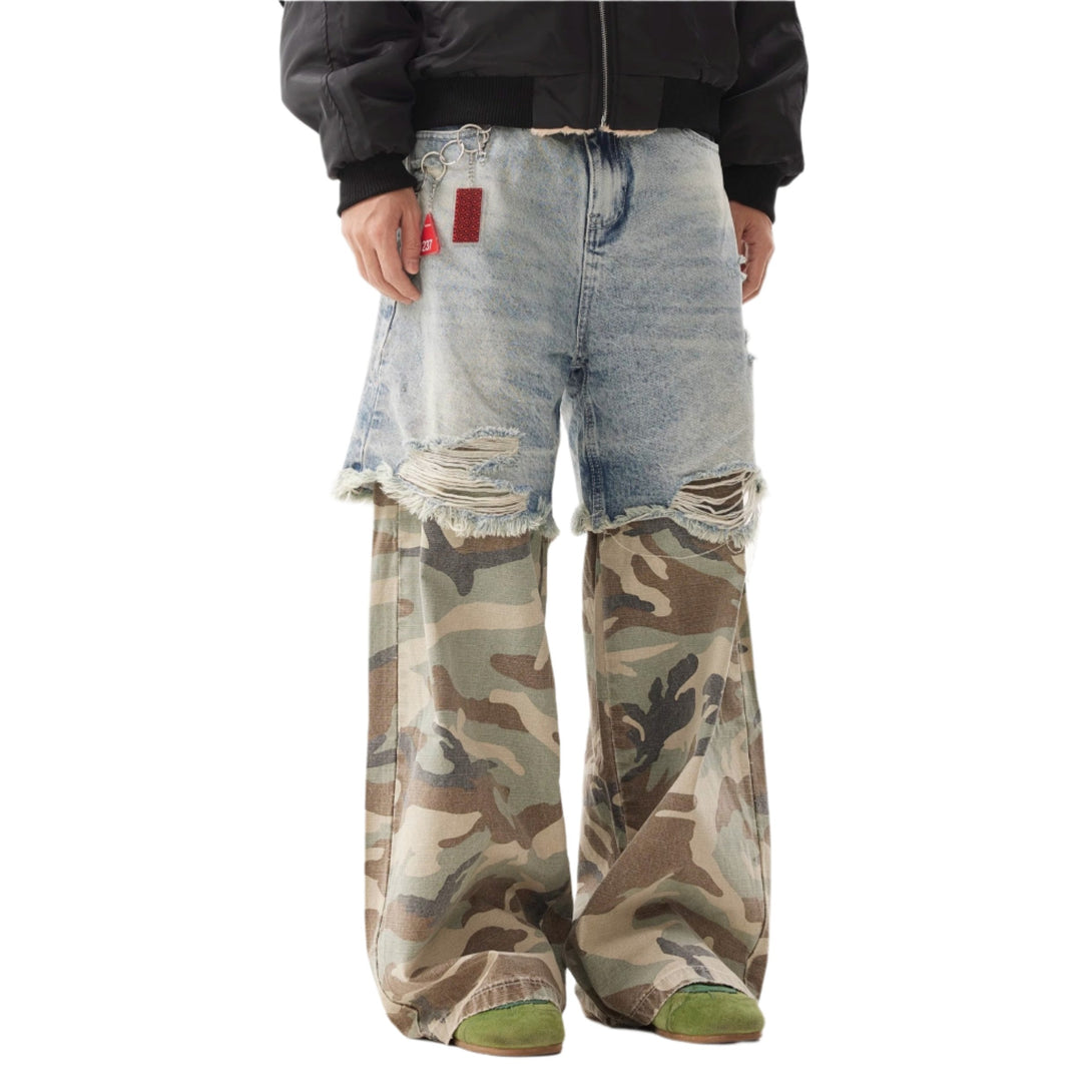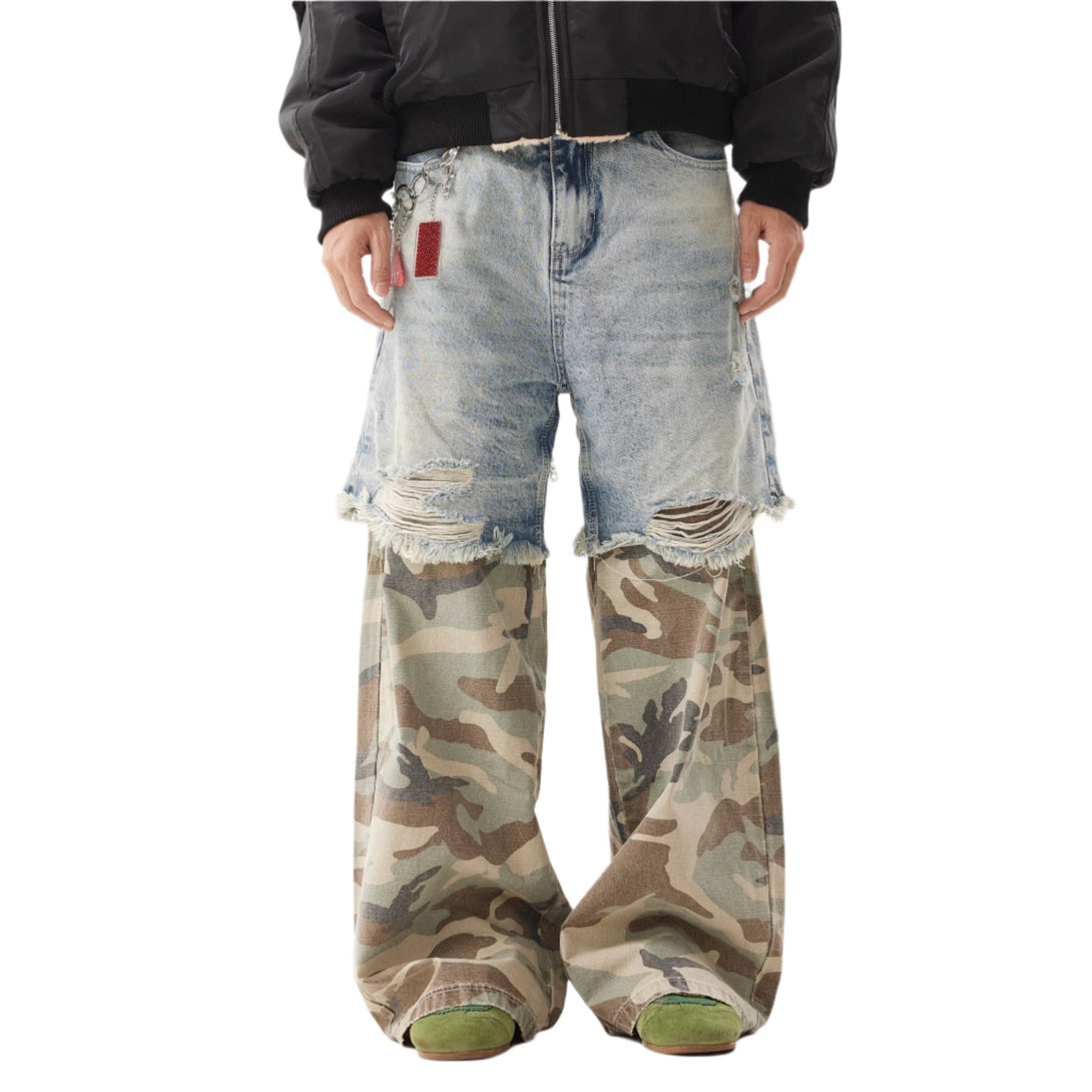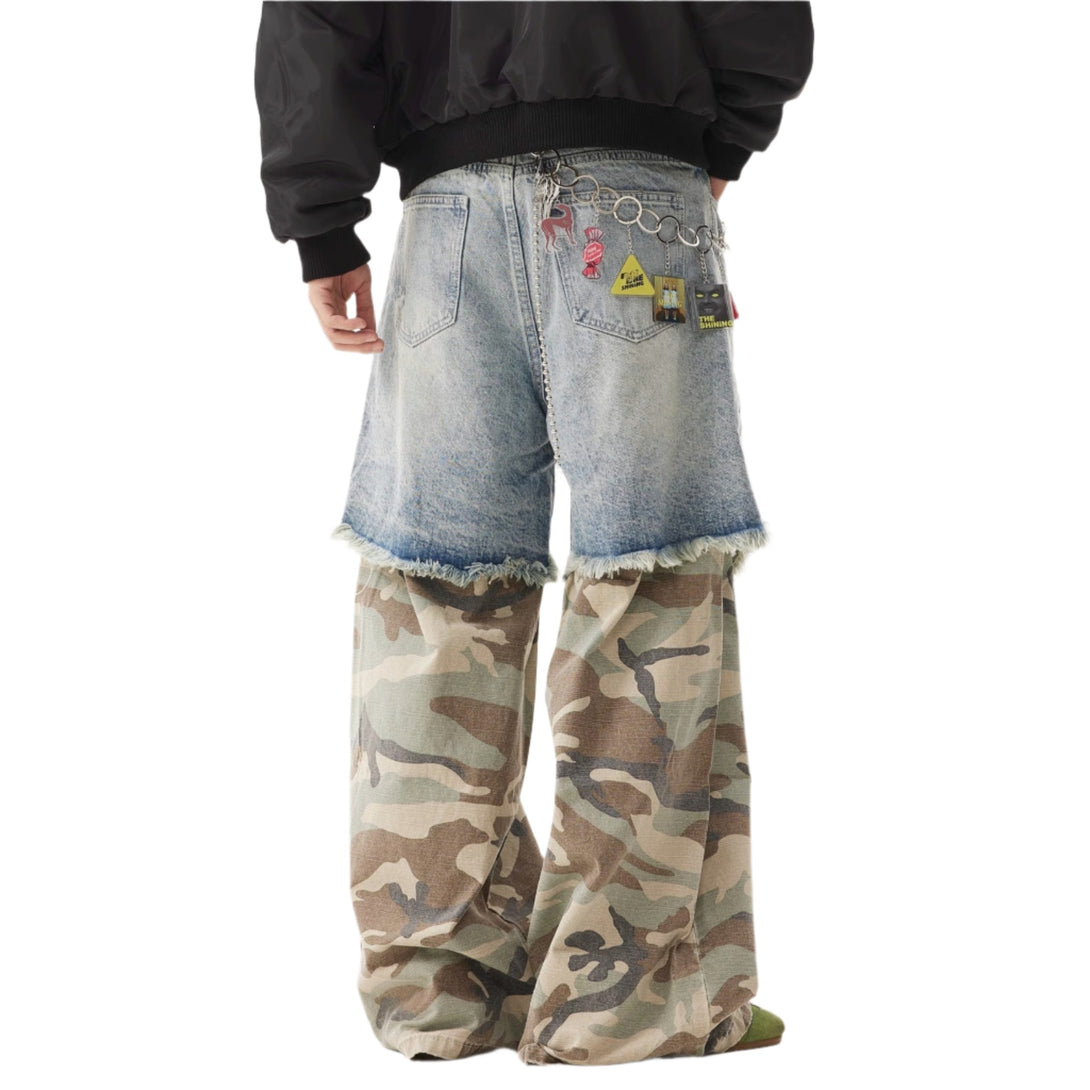 Revolutionary hybrid construction layers light-wash distressed denim shorts over military cargo pants in a dual-material design built for versatile daily expression. The innovative approach combines the character of vintage denim with tactical functionality, creating pieces that adapt from urban adventures to creative workspaces.