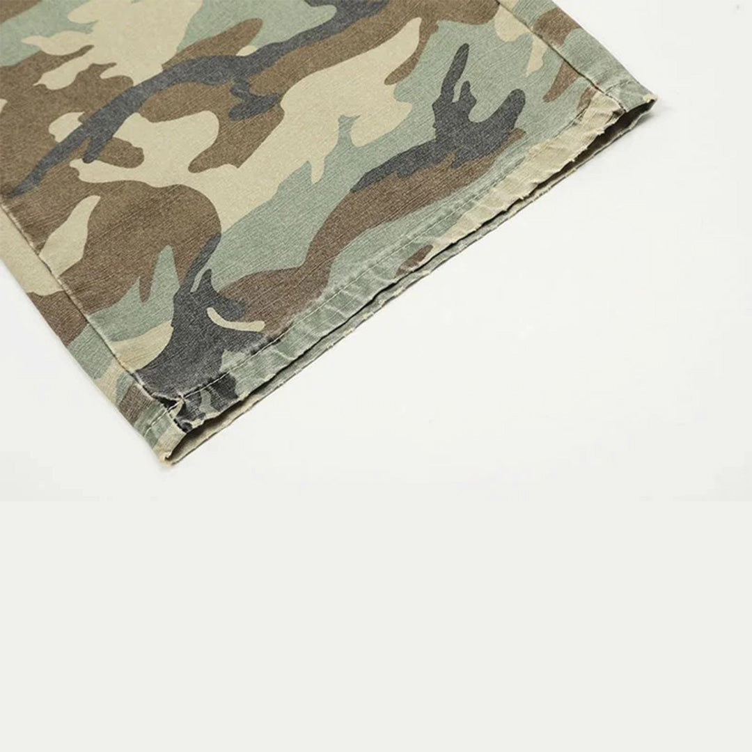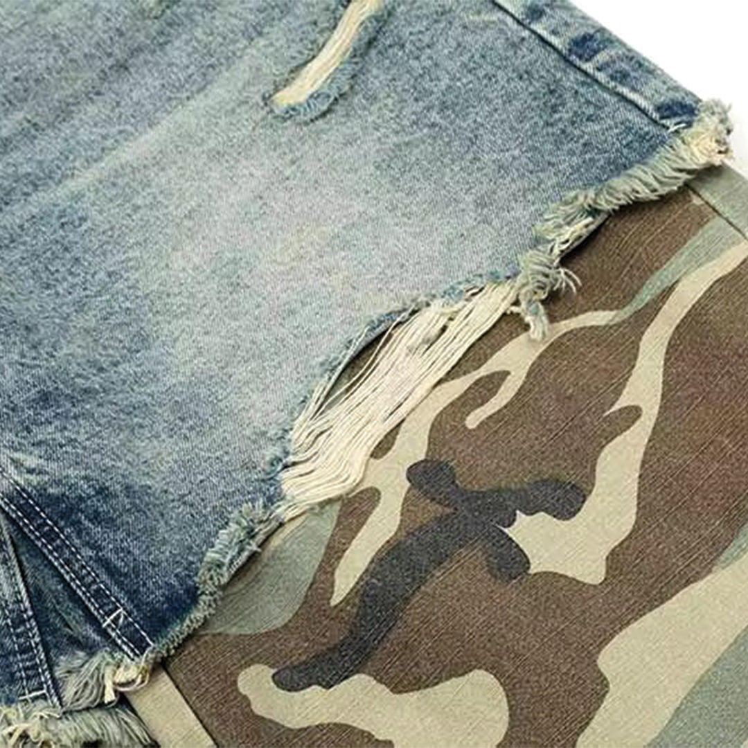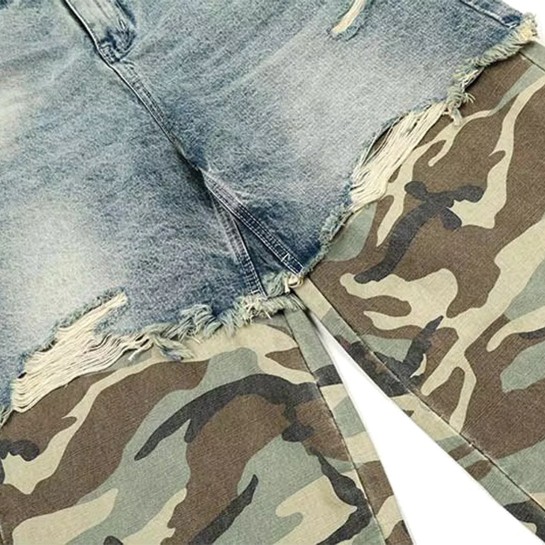 Revolutionary hybrid construction layers light-wash distressed denim shorts over military cargo pants in a dual-material design built for versatile daily expression. The innovative approach combines the character of vintage denim with tactical functionality, creating pieces that adapt from urban adventures to creative workspaces.