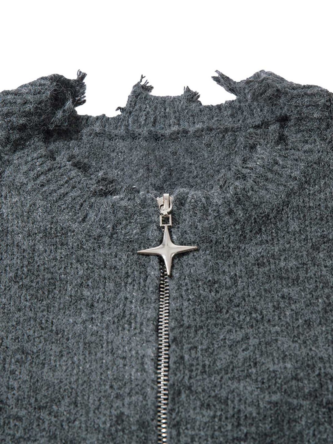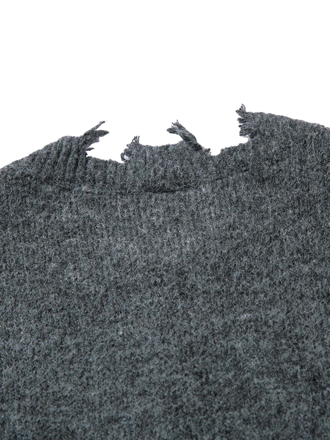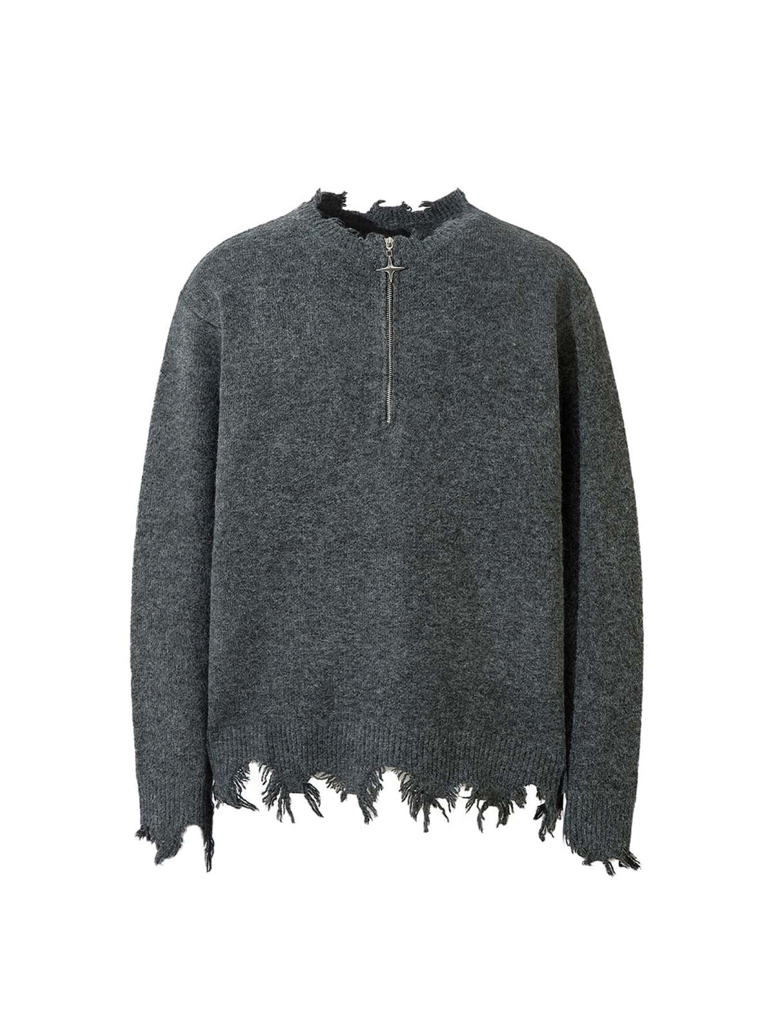 The distressed edges are hand-finished using specialized fraying techniques that create authentic wear patterns while maintaining structural integrity. Each frayed detail is carefully crafted to develop character over time without compromising the garment's longevity. The half-zip design provides instant style adjustments and layering flexibility.