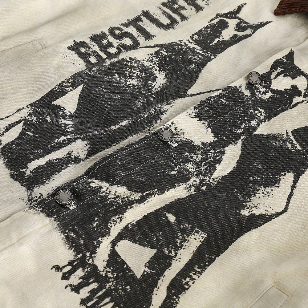 Canine loyalty meets workwear functionality in bold graphic storytelling, merging street art with utility construction. The relaxed silhouette delivers effortless comfort while contrast brown trim and dog print graphics add authentic character to everyday outerwear.