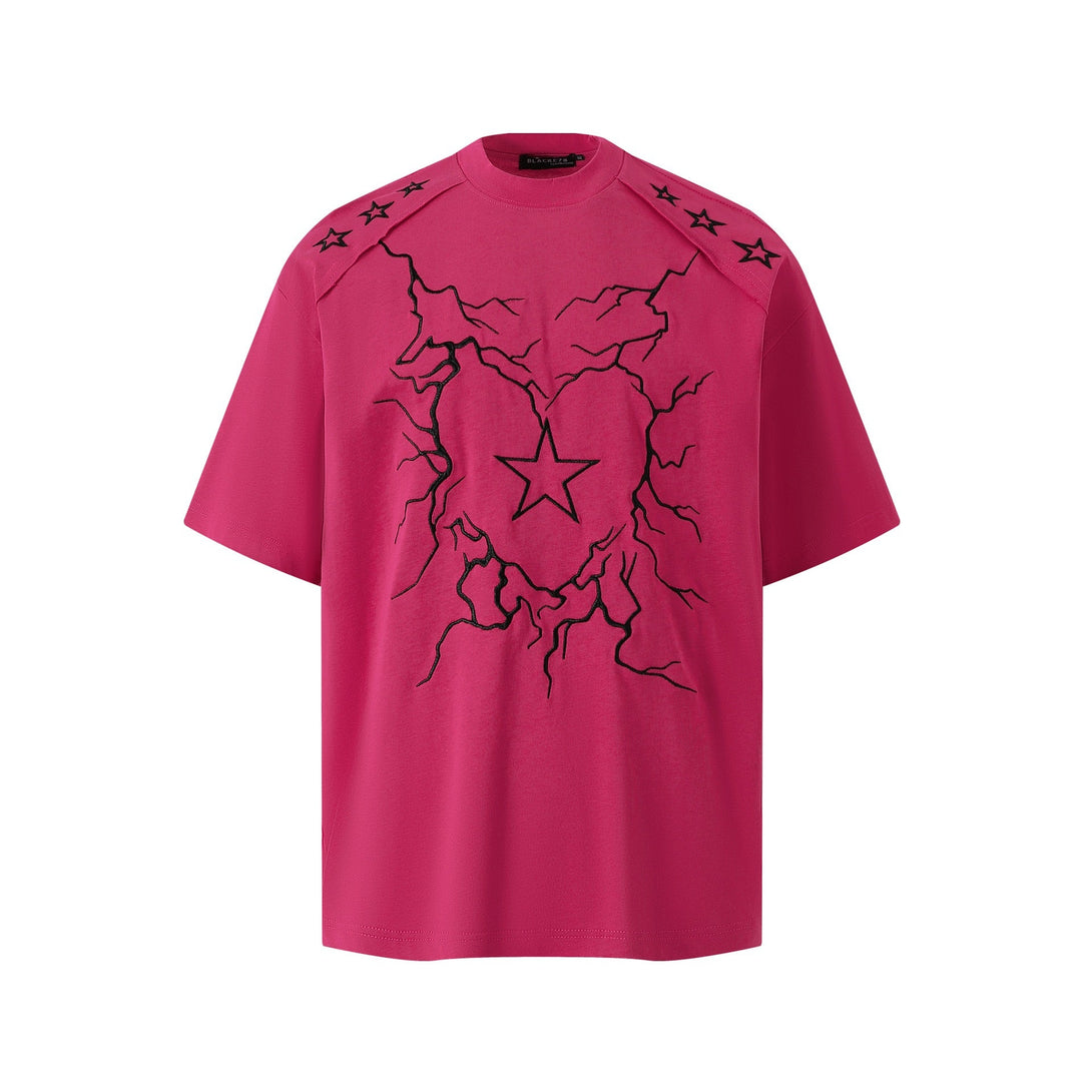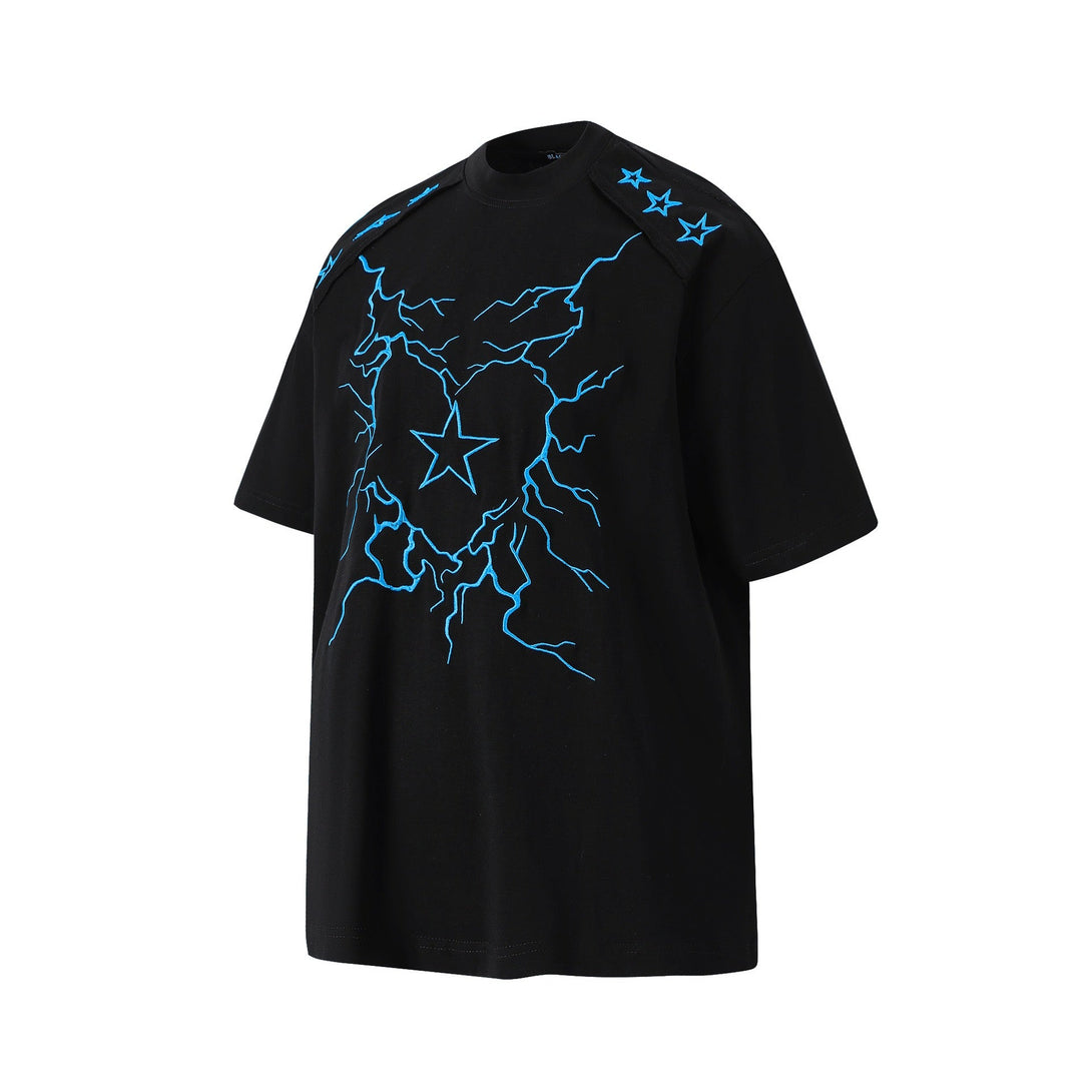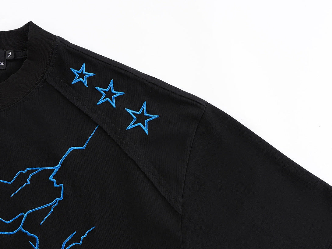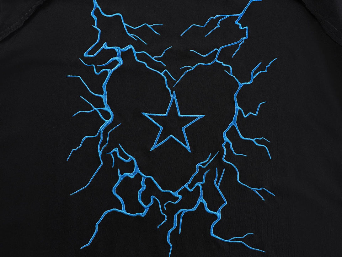 Our Electric Lightning Embroidered Tee is built with premium cotton knit and heavy-duty embroidery construction designed for those who channel raw energy into their personal style. The intricate lightning bolt network radiates from a central star motif, creating dynamic visual movement that captures the electric intensity of street culture, while the oversized silhouette adapts seamlessly for bold statement looks or layered streetwear expressions. Custom embroidery work and reinforced construction ensure this high-energy piece maintains its dimensional impact and structural integrity through countless electrifying adventures.