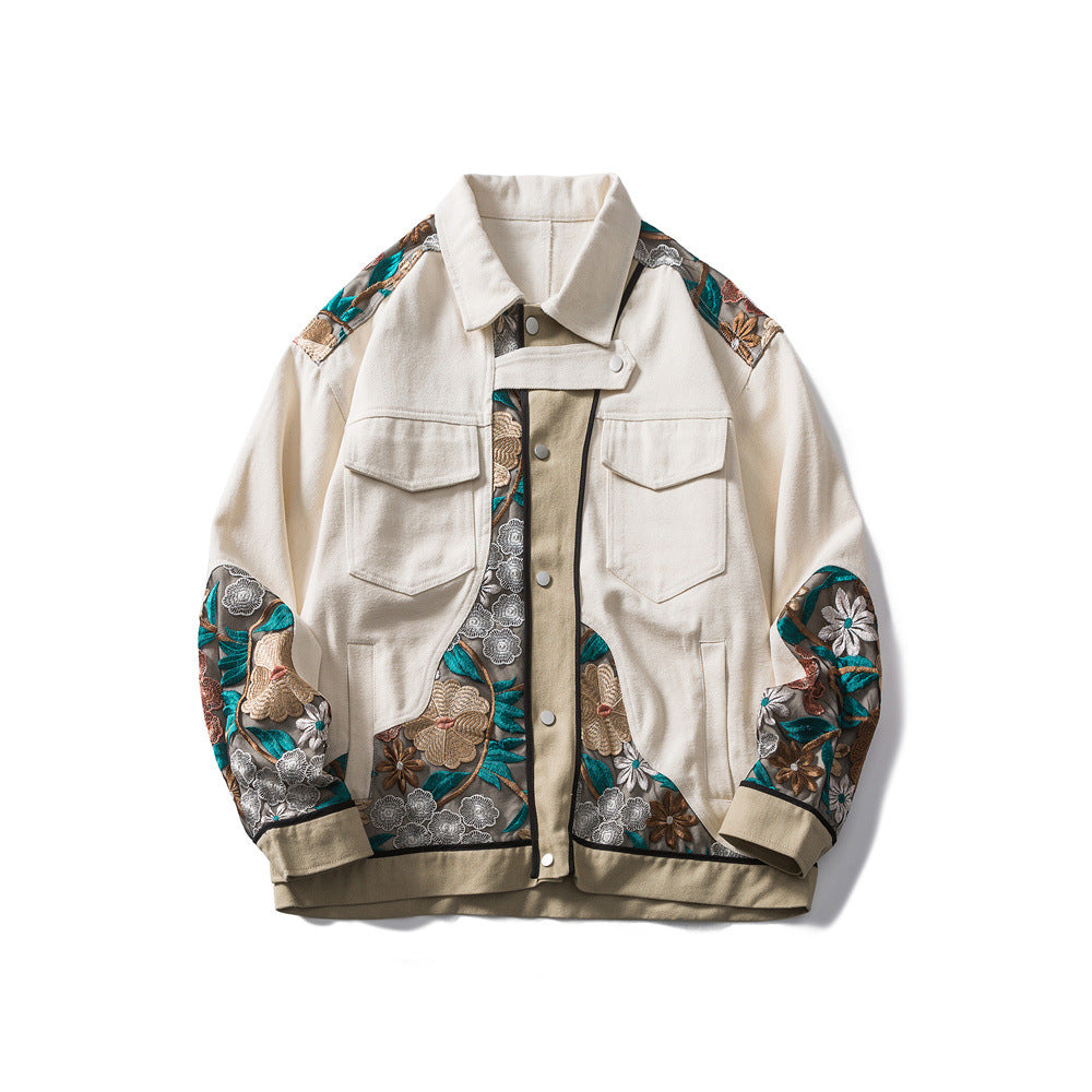 Product information: Embroidered Floral Patchwork Jacket - Khaki Cotton Work Jacket