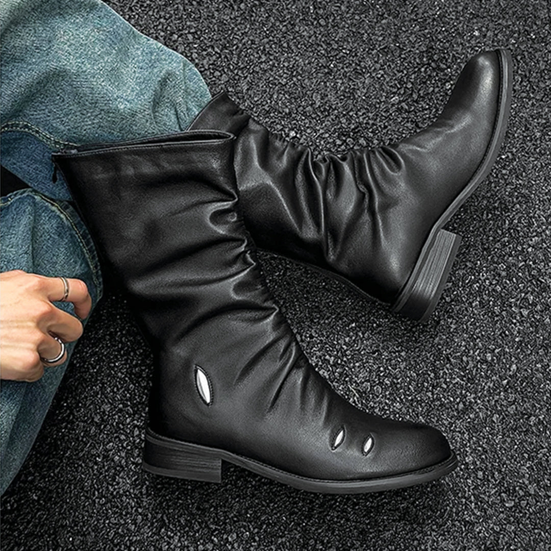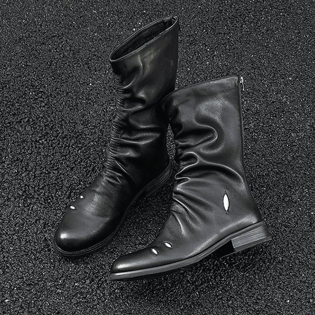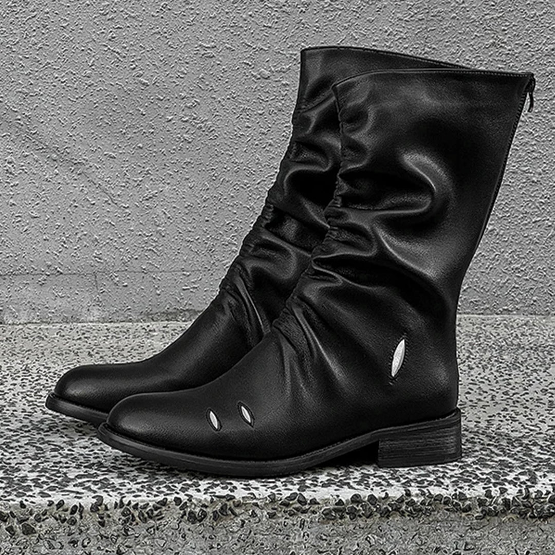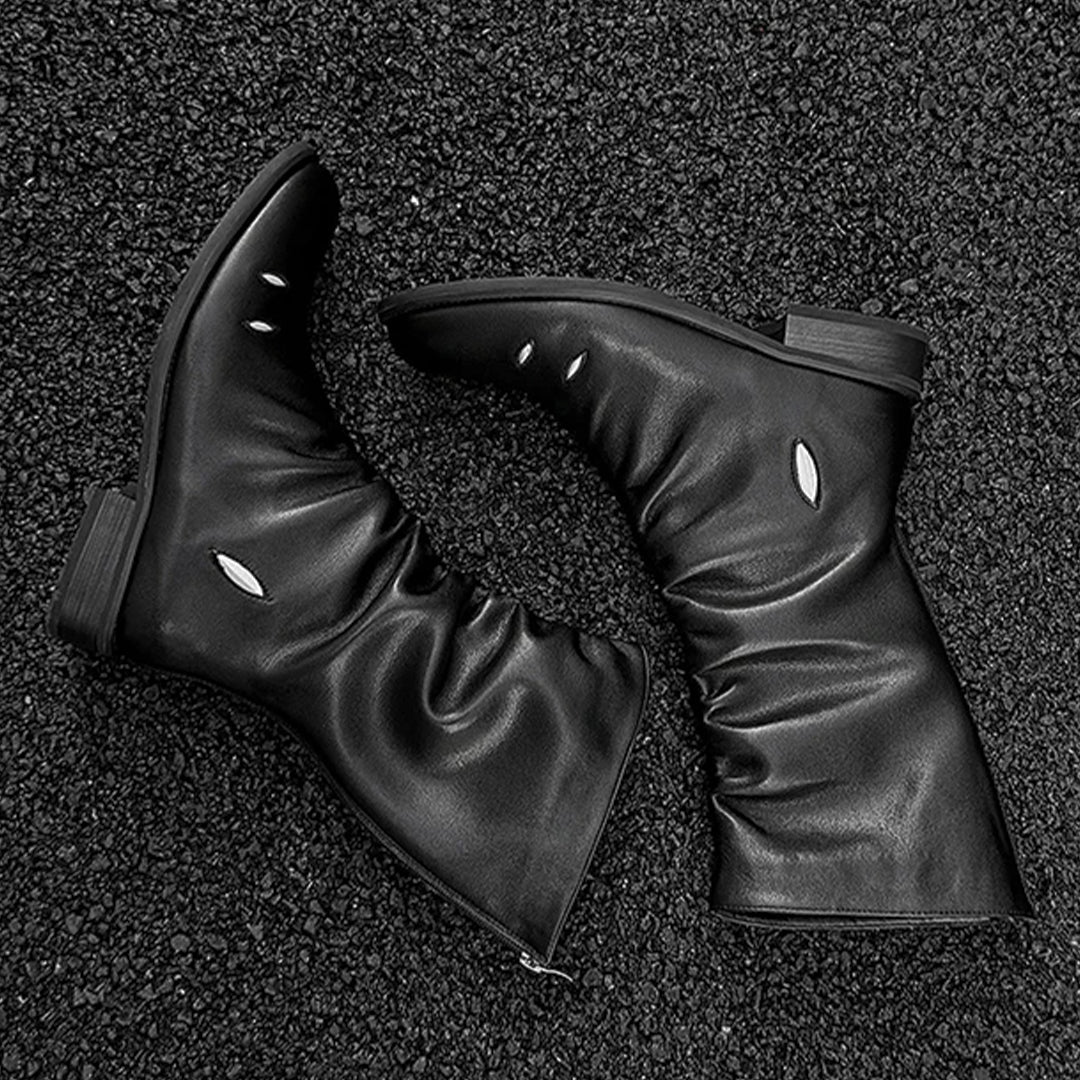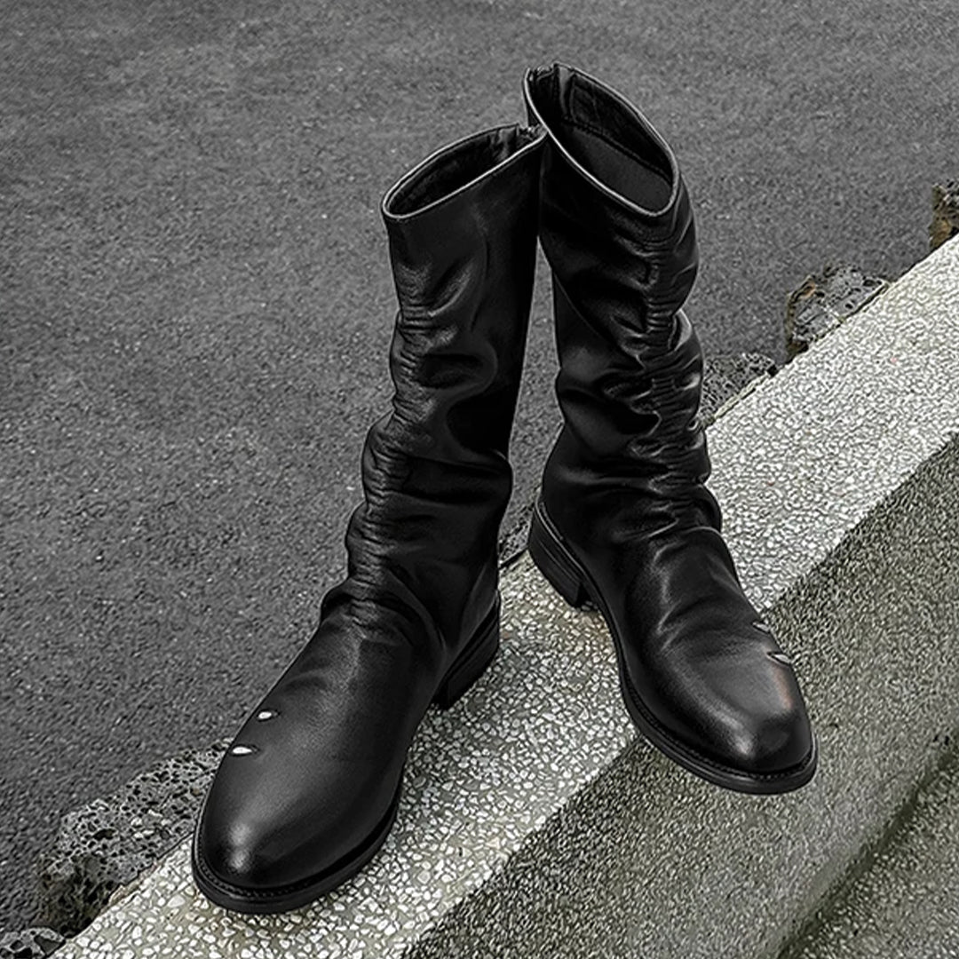 Strategic raised folds meet precision-placed reflective slits across genuine leather construction, merging refined subculture references with versatile daily sophistication. The gathered leather detailing delivers sculptural interest while pointed toe proportions and clean welt finishing transform classic calf boot aesthetics into statement pieces that bridge gallery openings and after-hours without compromise.