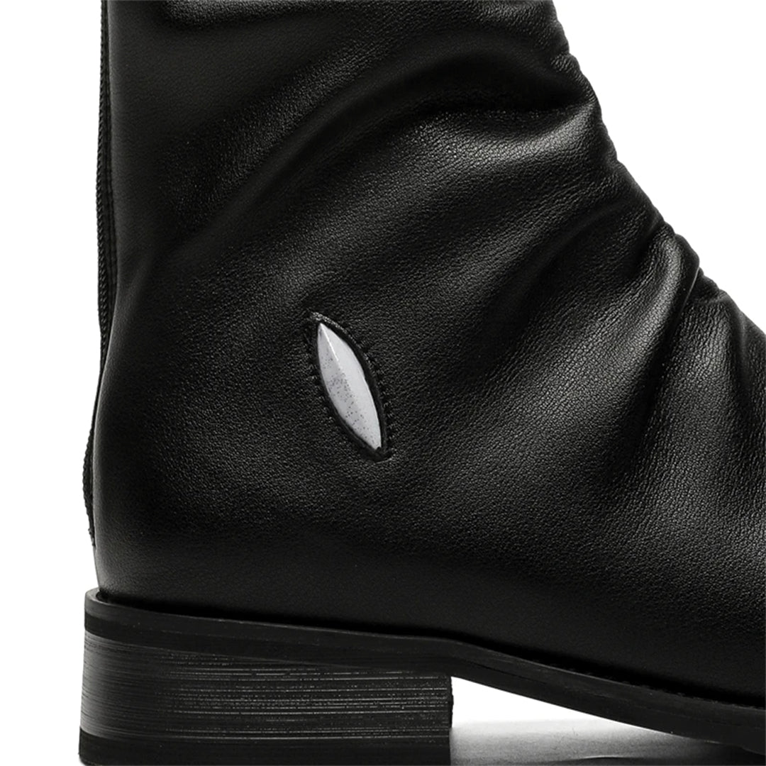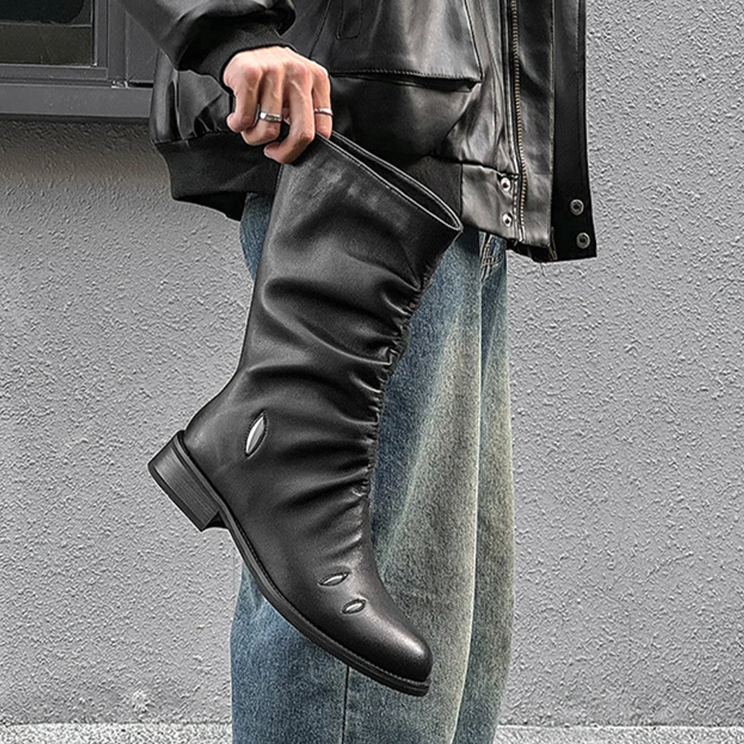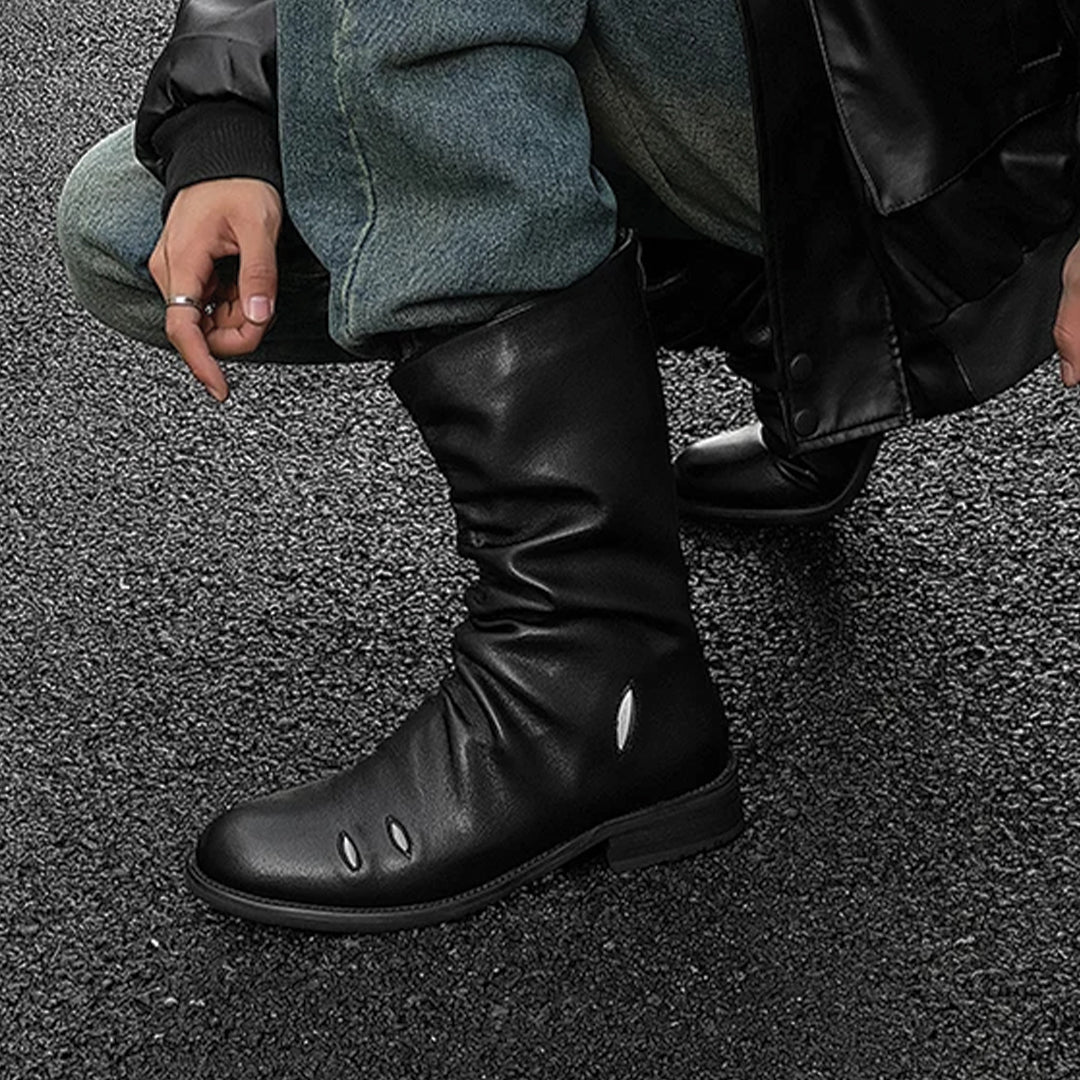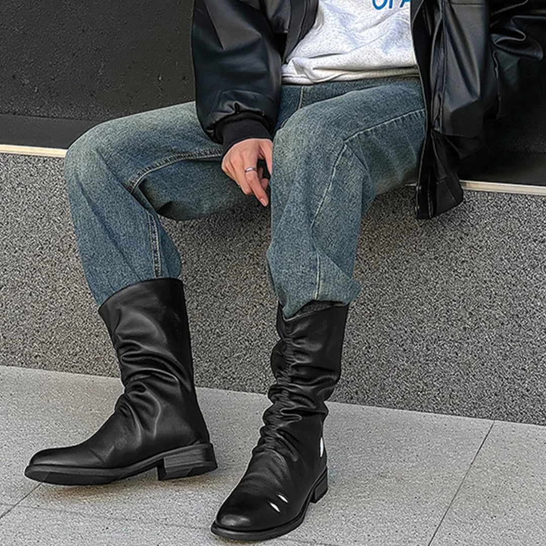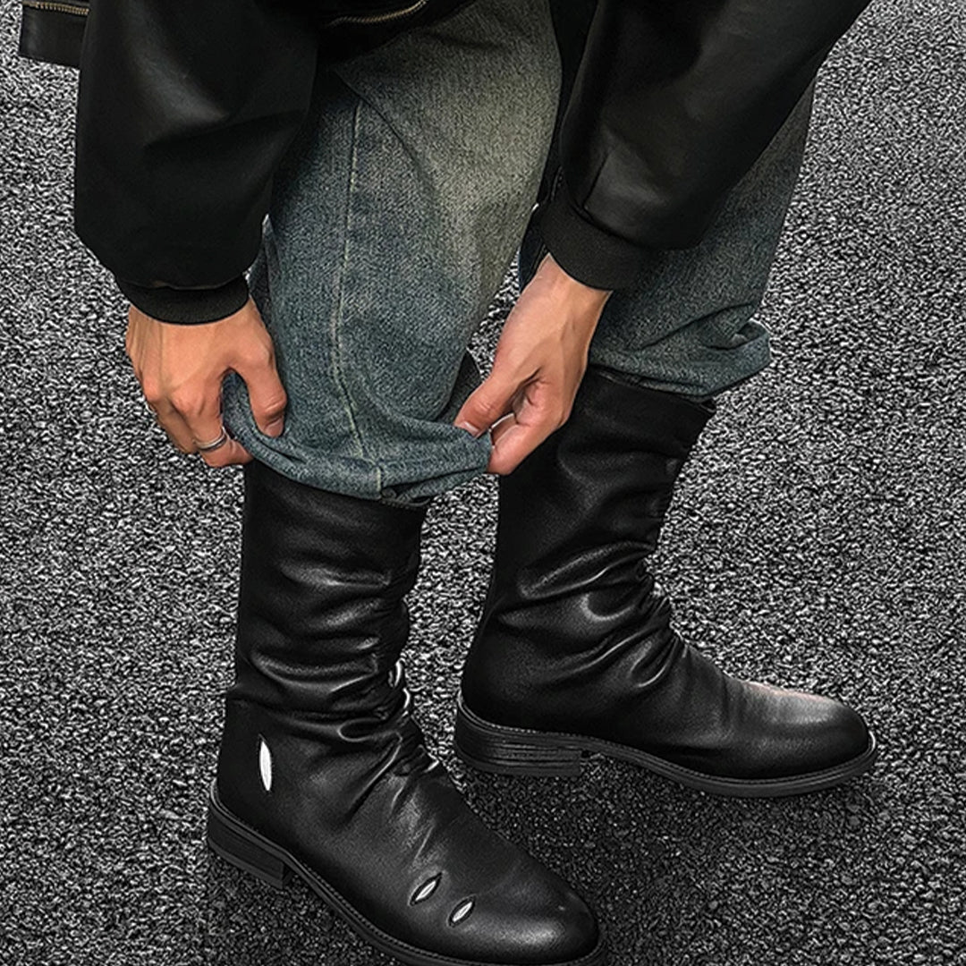 Strategic raised folds meet precision-placed reflective slits across genuine leather construction, merging refined subculture references with versatile daily sophistication. The gathered leather detailing delivers sculptural interest while pointed toe proportions and clean welt finishing transform classic calf boot aesthetics into statement pieces that bridge gallery openings and after-hours without compromise.