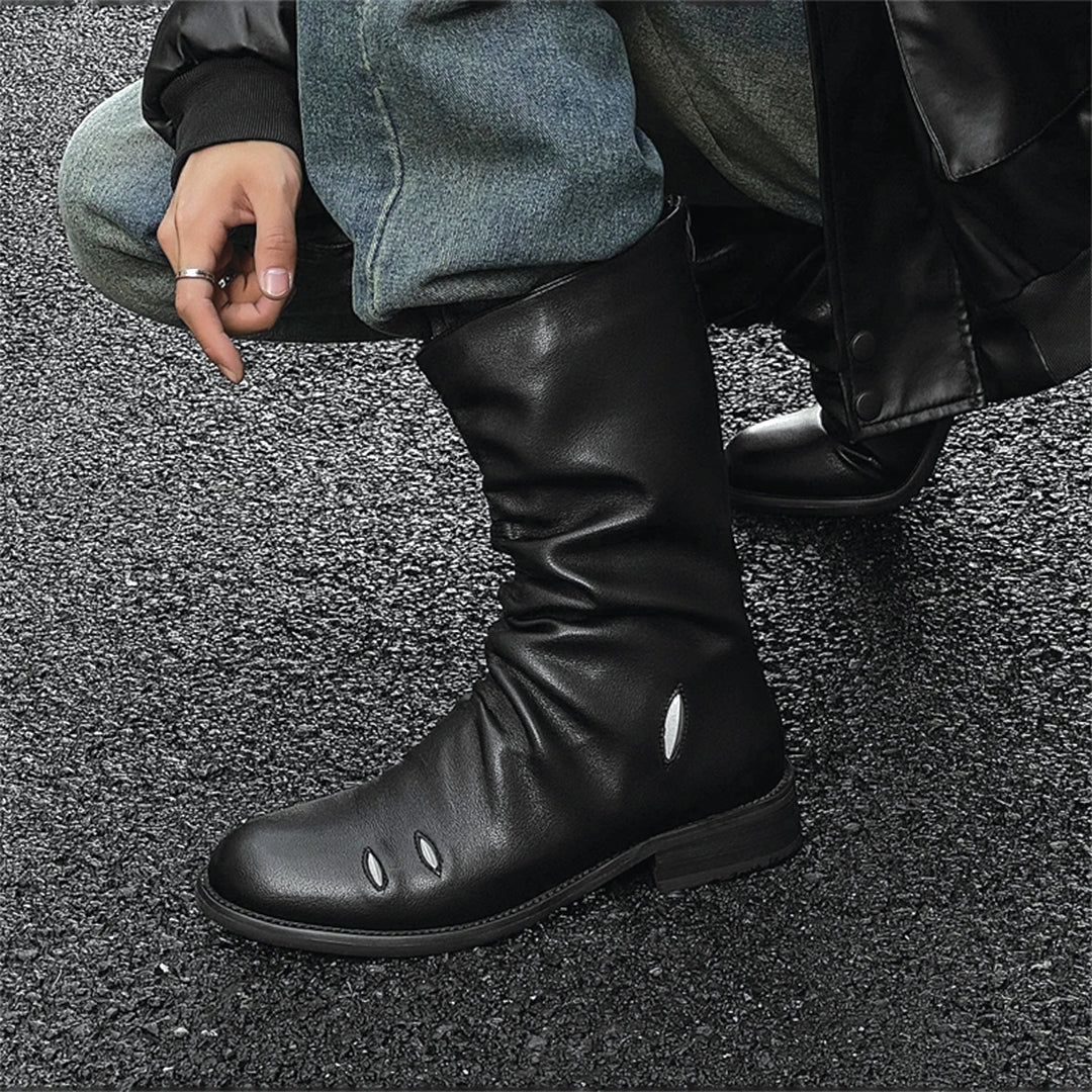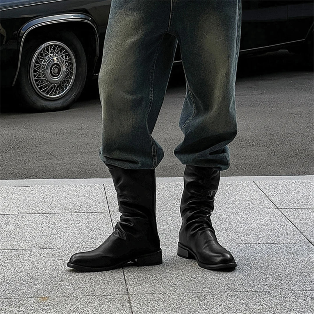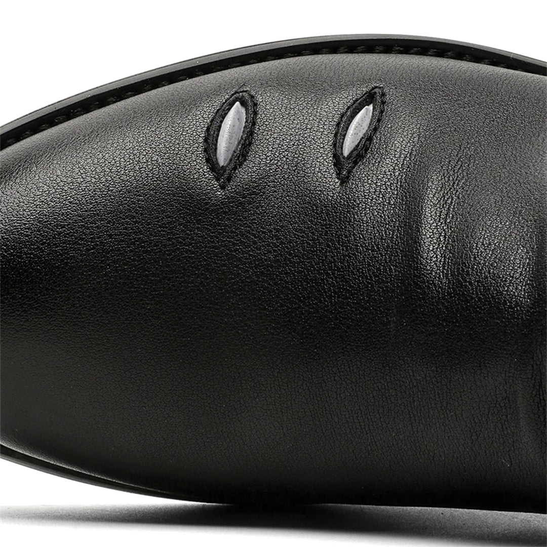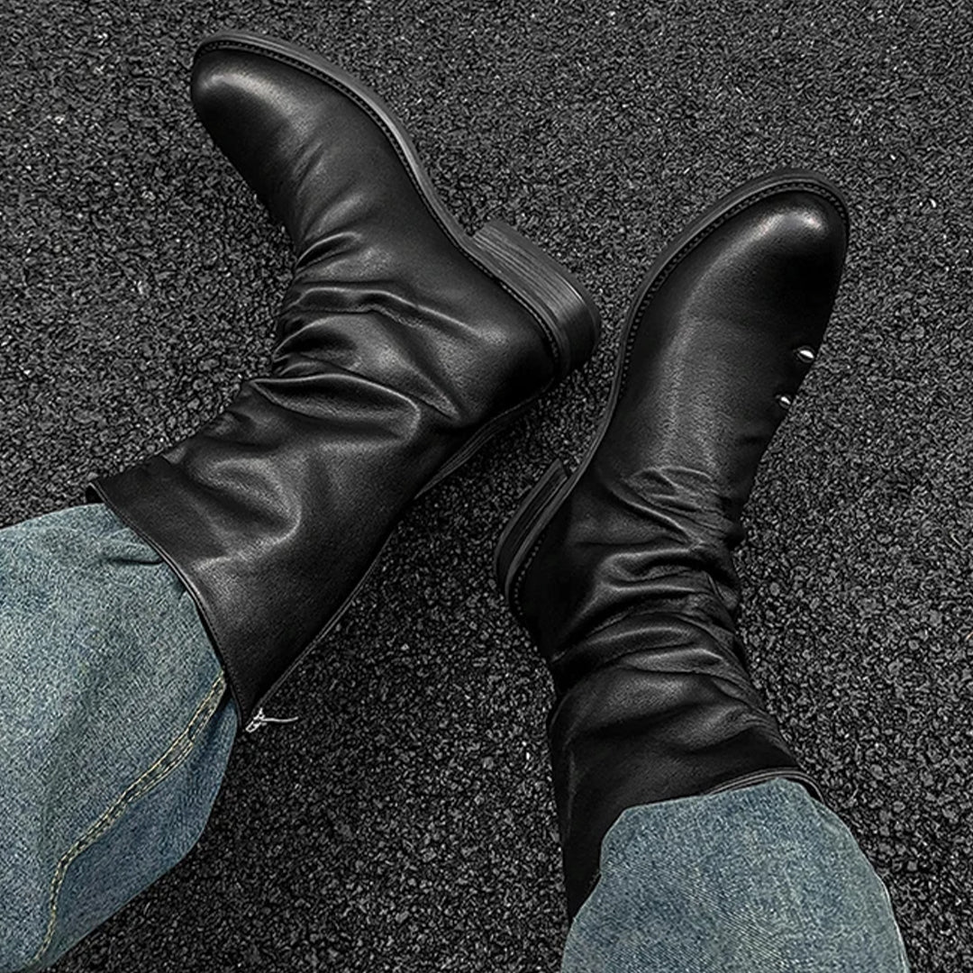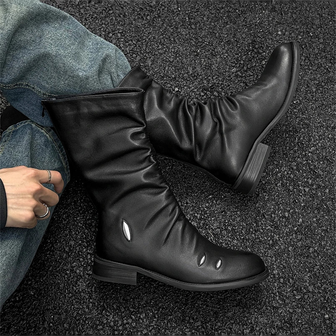 Strategic raised folds meet precision-placed reflective slits across genuine leather construction, merging refined subculture references with versatile daily sophistication. The gathered leather detailing delivers sculptural interest while pointed toe proportions and clean welt finishing transform classic calf boot aesthetics into statement pieces that bridge gallery openings and after-hours without compromise.