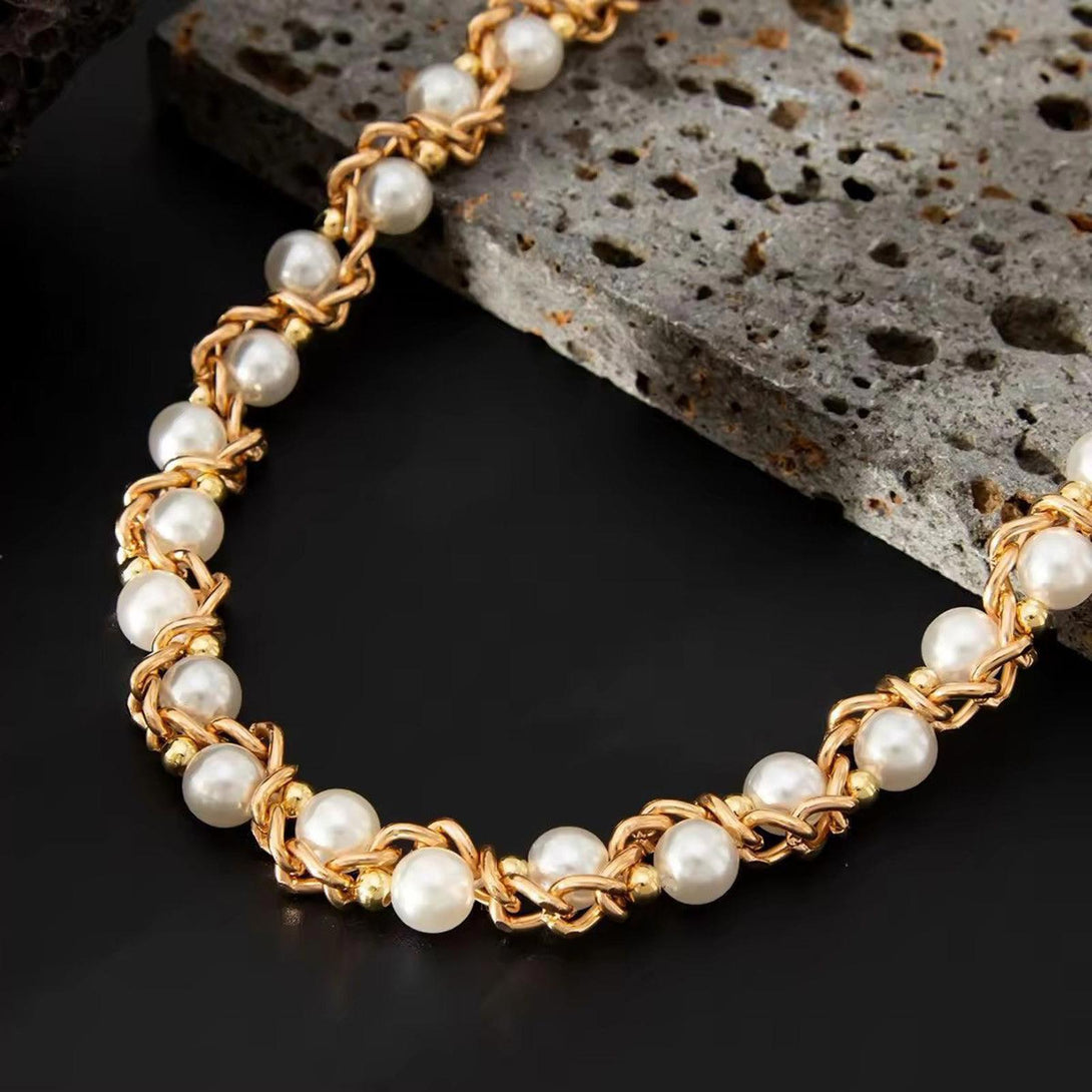 Precision-woven gold-tone links embrace lustrous pearl elements in seamless harmony. Each pearl positioned with intention, every twist calculated for impact.