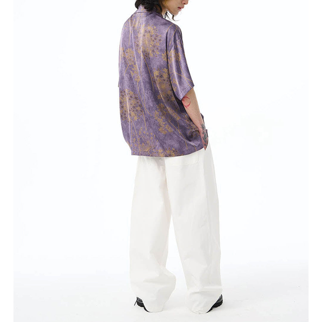 Our Golden Leaf Floral Print Short Sleeve Shirt is built from lightweight polyester with hand-painted dandelion florals designed to capture childhood wonder and botanical nostalgia. The relaxed construction and classic turn-down collar create comfortable proportions for effortless styling, while our tie-dye foundation technique creates a dreamy lavender canvas that feels both vintage and contemporary. Golden botanical details and soft color transitions create pieces that merge wildflower romance with modern comfort aesthetics.