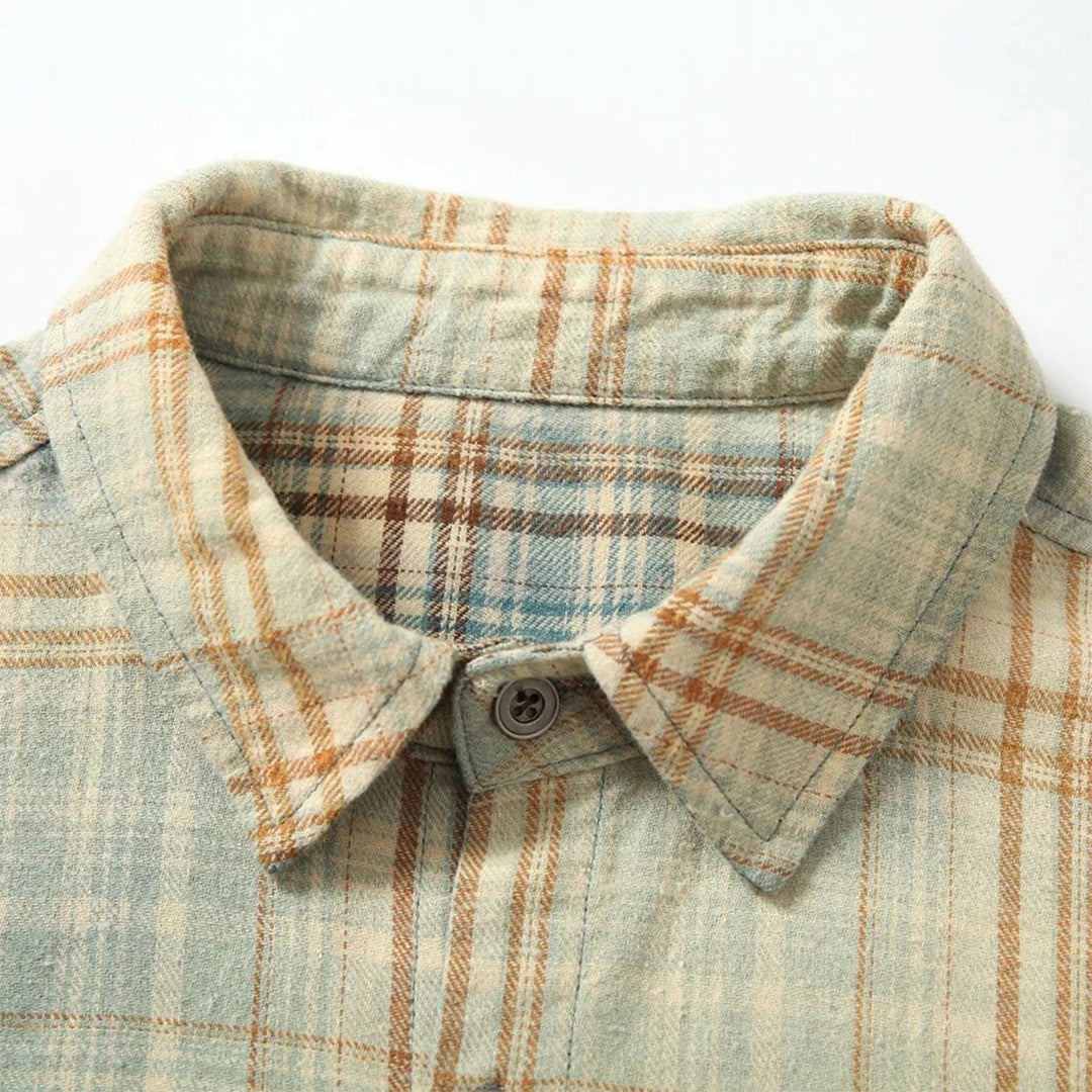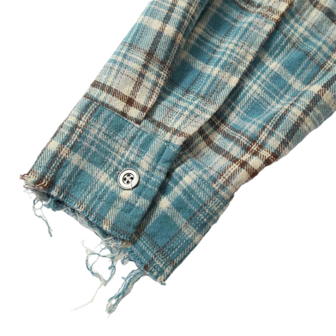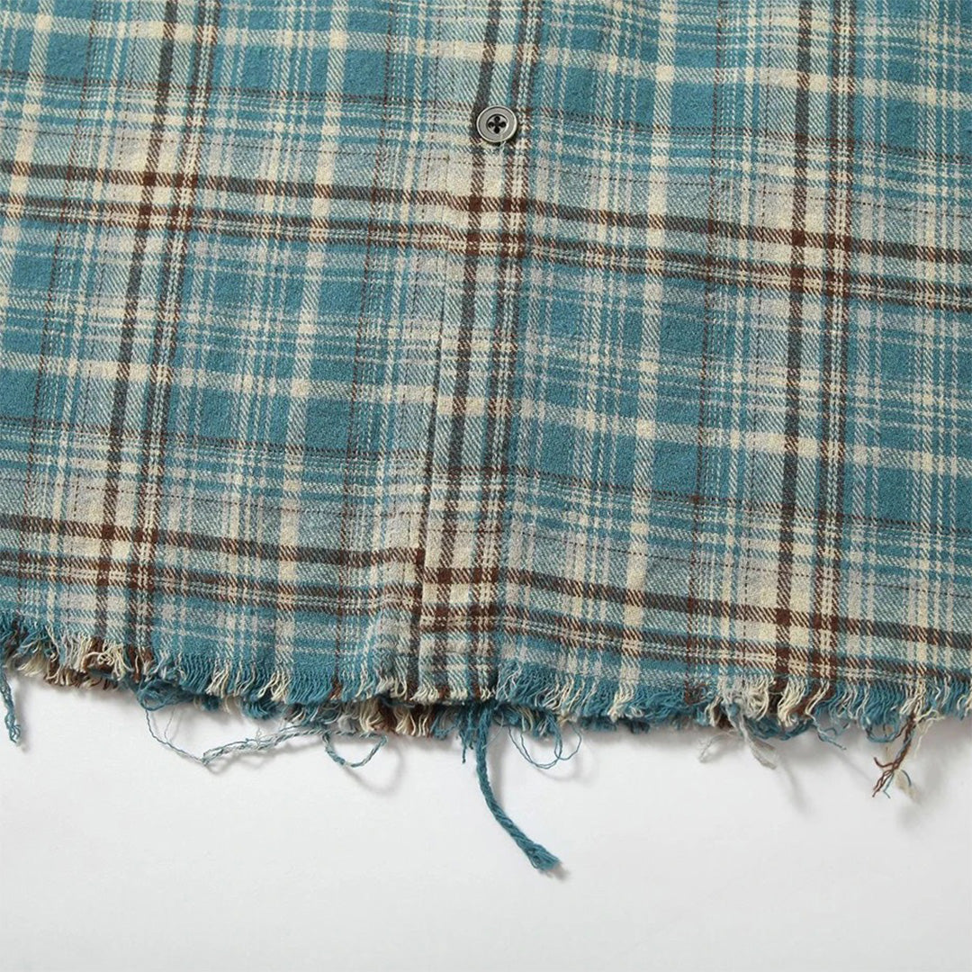 Our Gradient Plaid Workwear Shirt is built from premium cotton with hand-guided gradient dyeing designed to transform classic plaid patterns through contemporary color innovation. The relaxed construction and authentic workwear details create heritage proportions, while our artisanal dip-dye process creates a seamless transition from cream to teal that honors traditional textile techniques. Intentional distressing and rivet hardware create pieces that merge authentic workwear function with artistic color experimentation.