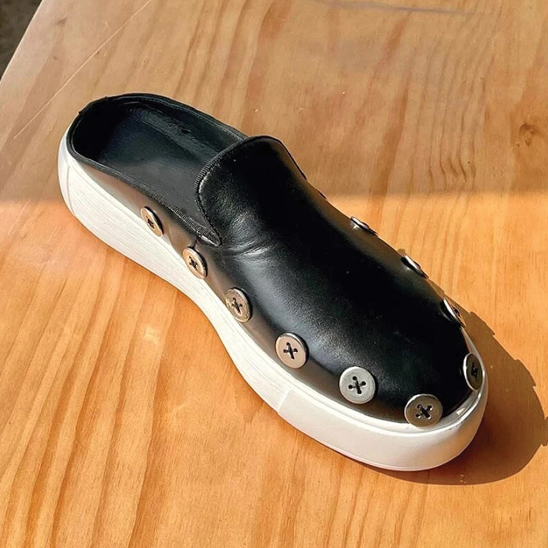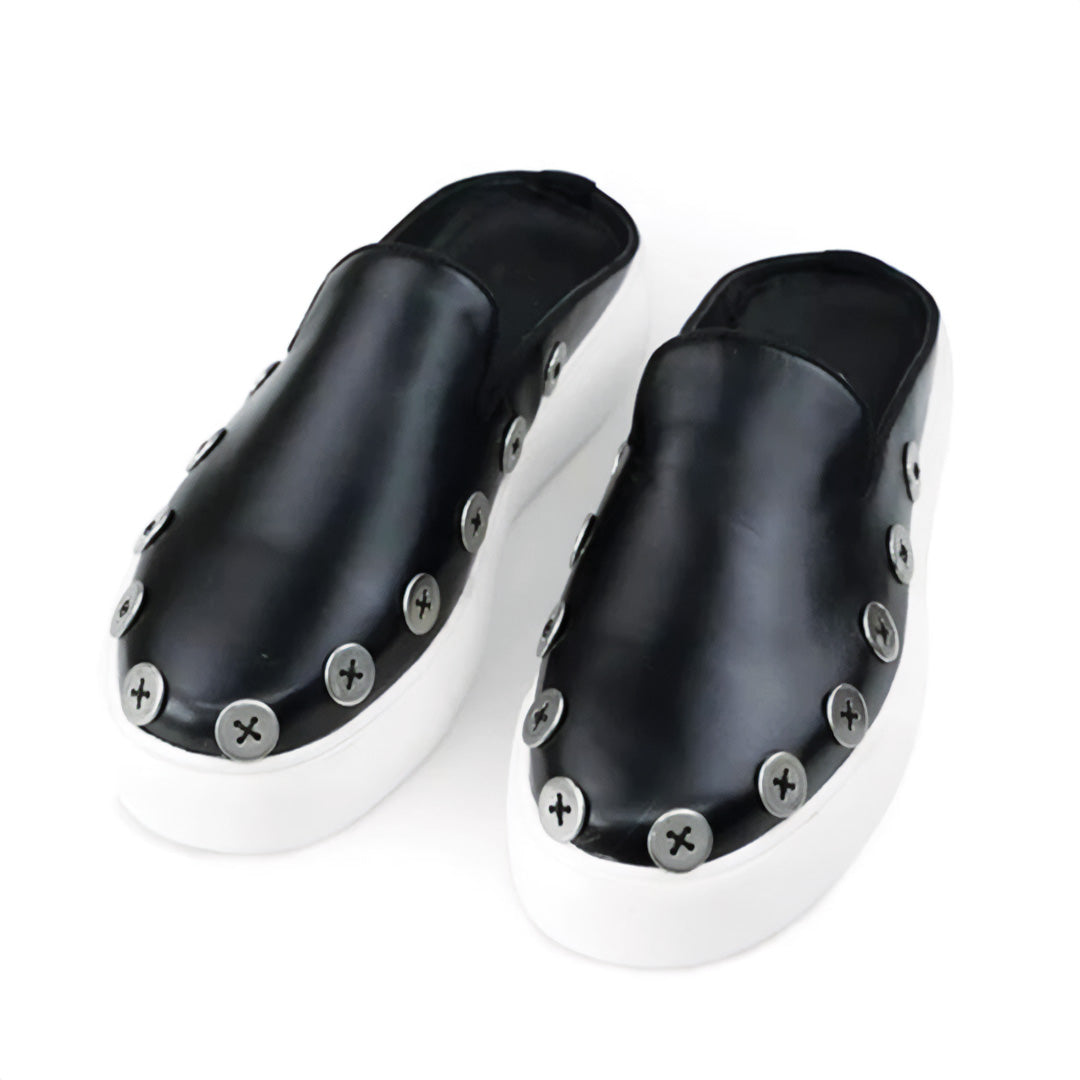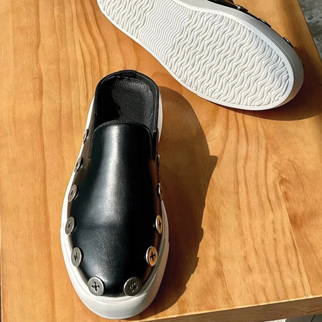 When details define the difference. Premium leather construction meets precision-engineered button hardware across slip-on silhouettes that refuse to compromise. Substantial platform foundations ground architectural upper design while metallic accents create visual rhythm without noise. These aren't mules that fade into backgrounds—they're statements for those who understand that true luxury lies in unexpected details executed flawlessly.