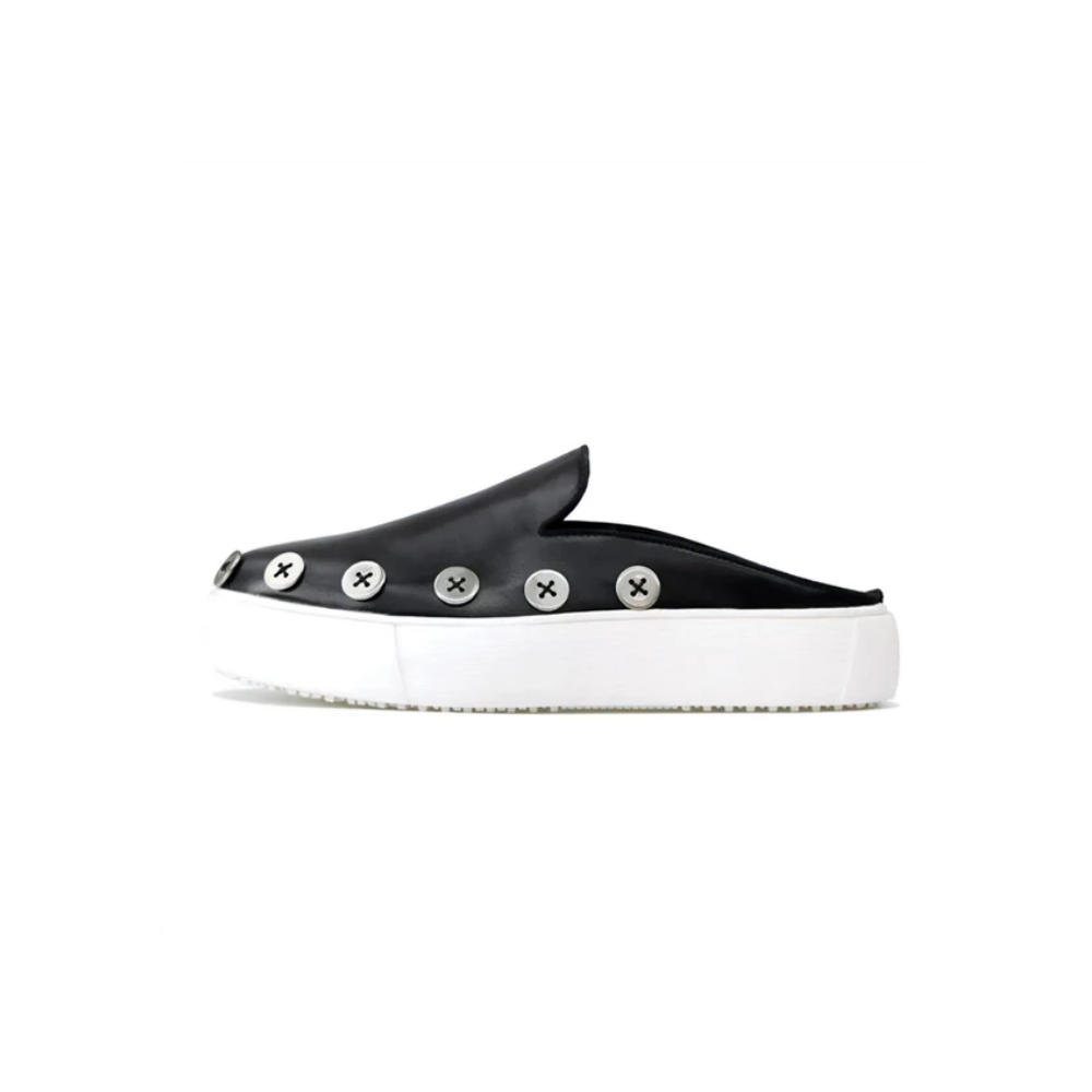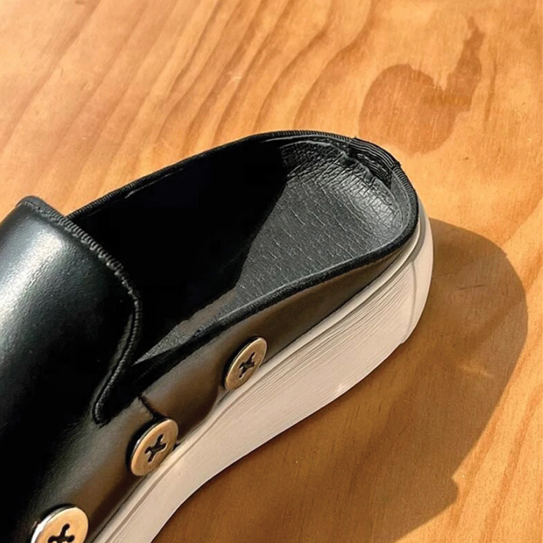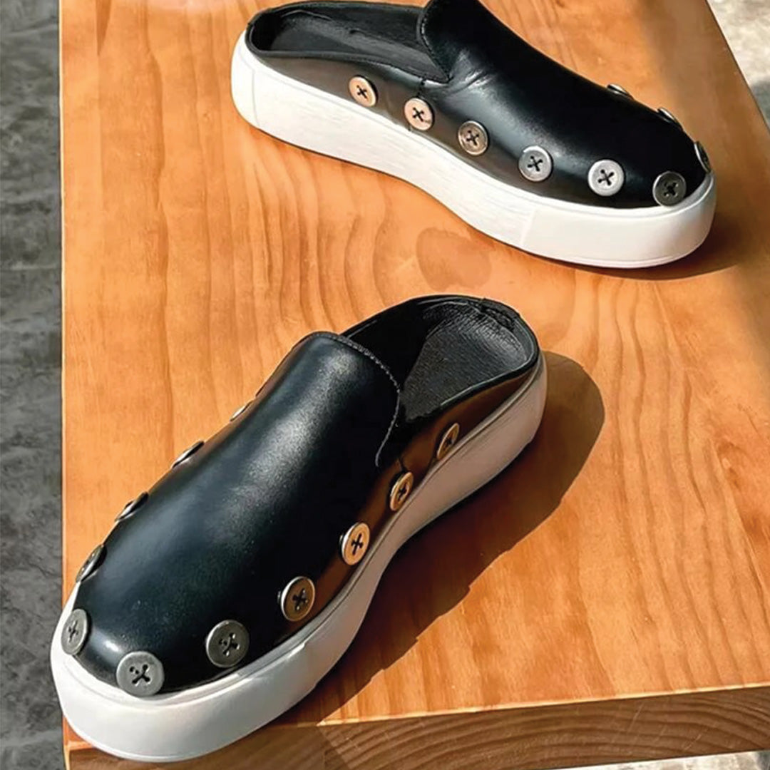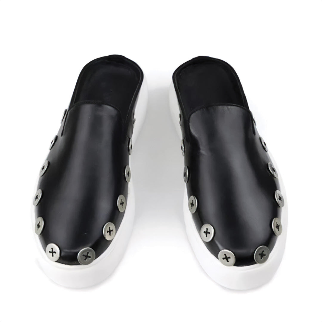 When details define the difference. Premium leather construction meets precision-engineered button hardware across slip-on silhouettes that refuse to compromise. Substantial platform foundations ground architectural upper design while metallic accents create visual rhythm without noise. These aren't mules that fade into backgrounds—they're statements for those who understand that true luxury lies in unexpected details executed flawlessly.
