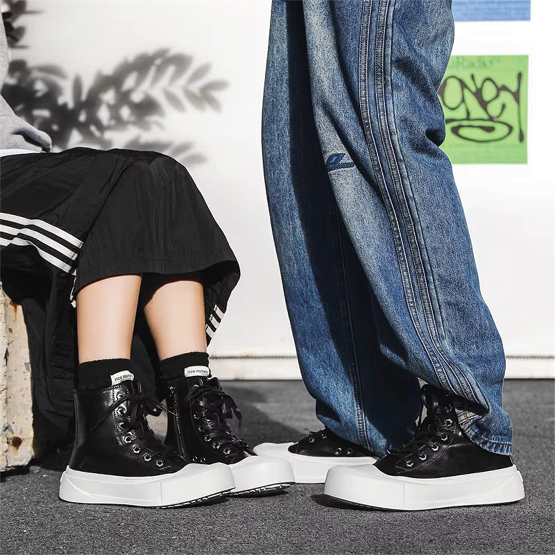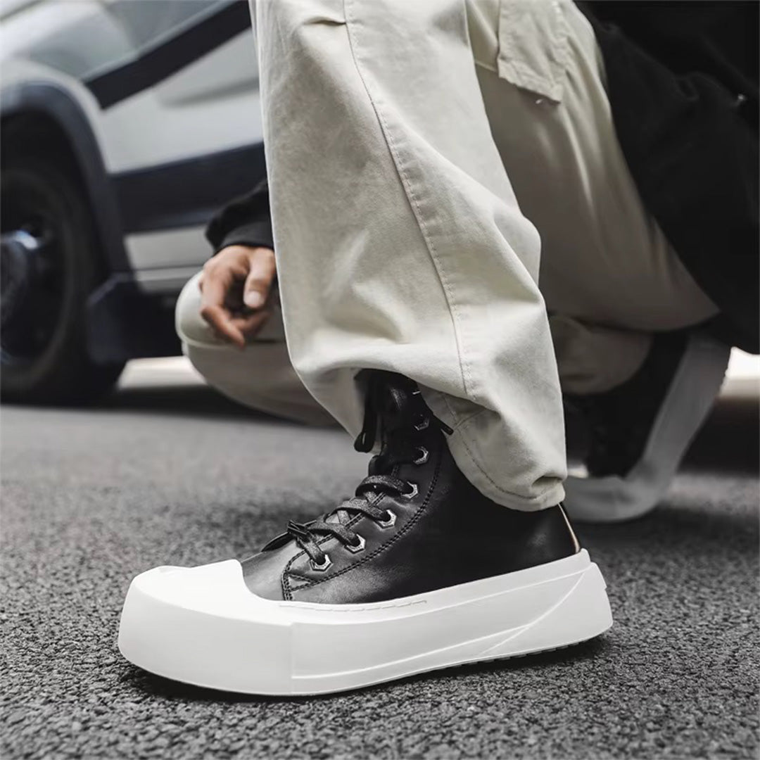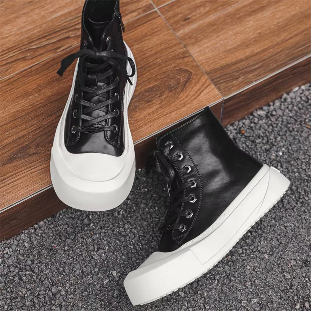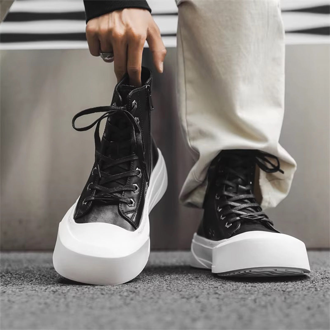 When elevation becomes architecture. Premium leather construction rises above conventional heights on precision-engineered platform foundations that redefine presence. Clean high-top silhouettes meet substantial sole engineering, creating statements that need no introduction. Metal eyelet systems secure more than laces—they anchor confidence. Built for those who understand that standing tall isn't about height, it's about intention.