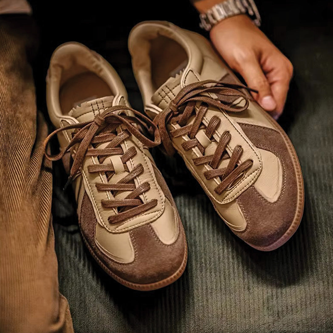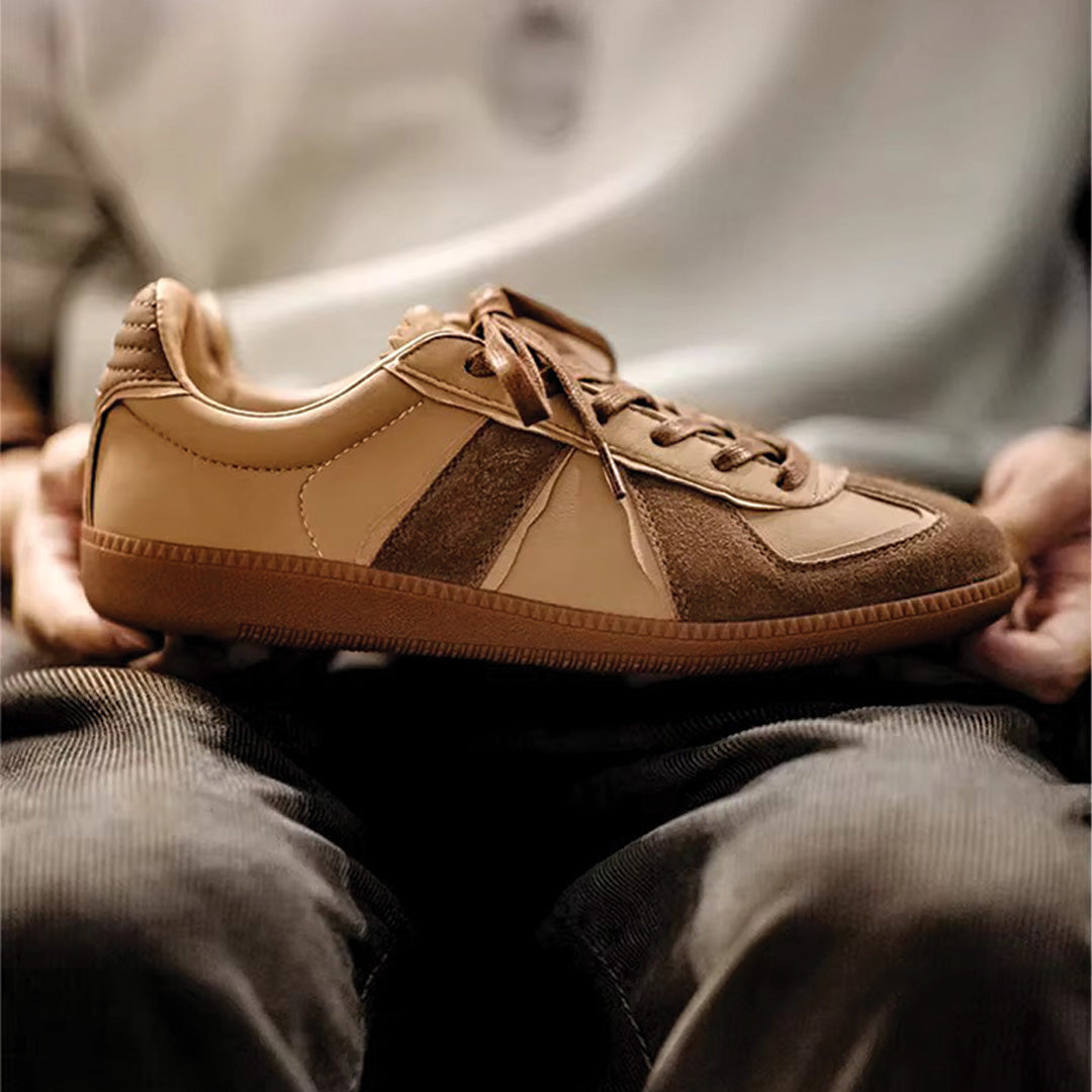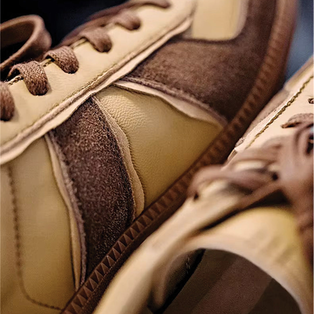 Crafted with meticulous attention to detail, these German Army Trainer style shoes offer a harmonious balance of heritage and modern craftsmanship. Handmade in vegan brown leather, 100% wool, organic detailing, they are the perfect understated choice for those who value both quality and style.