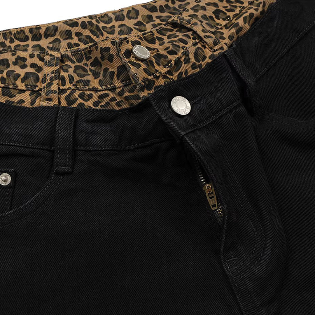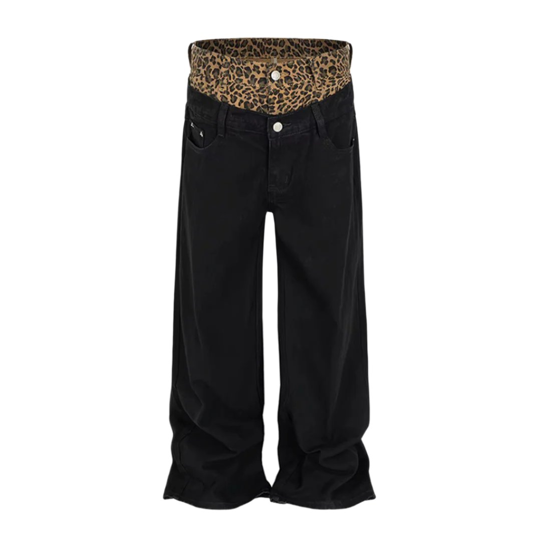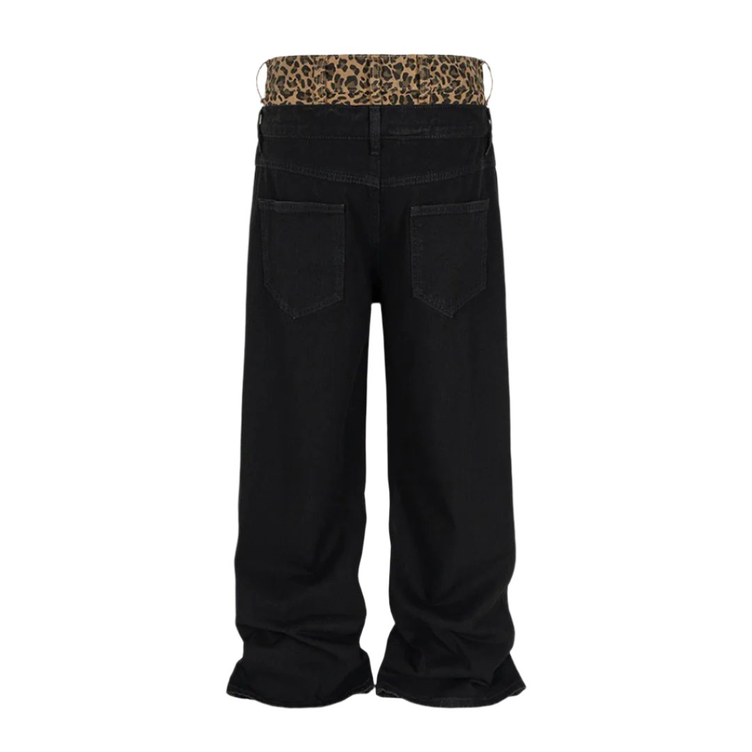 Innovative dual-waist construction combines leopard print contrast panels with premium black cotton denim built for bold daily expression. The extended leopard waistband creates a distinctive stacked silhouette while dual button closure and wide-leg design ensure comfort and adjustability through every statement-making moment.