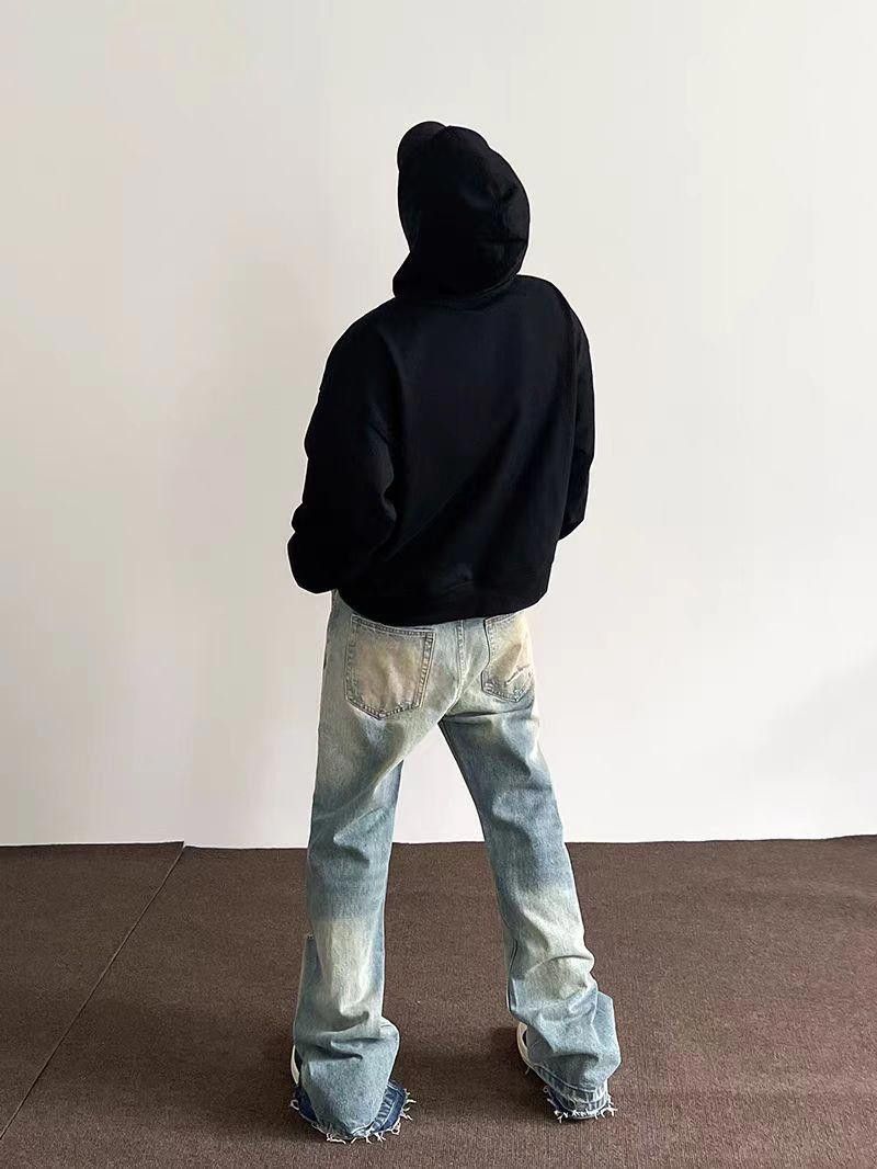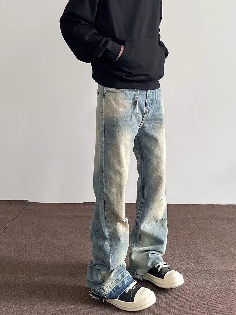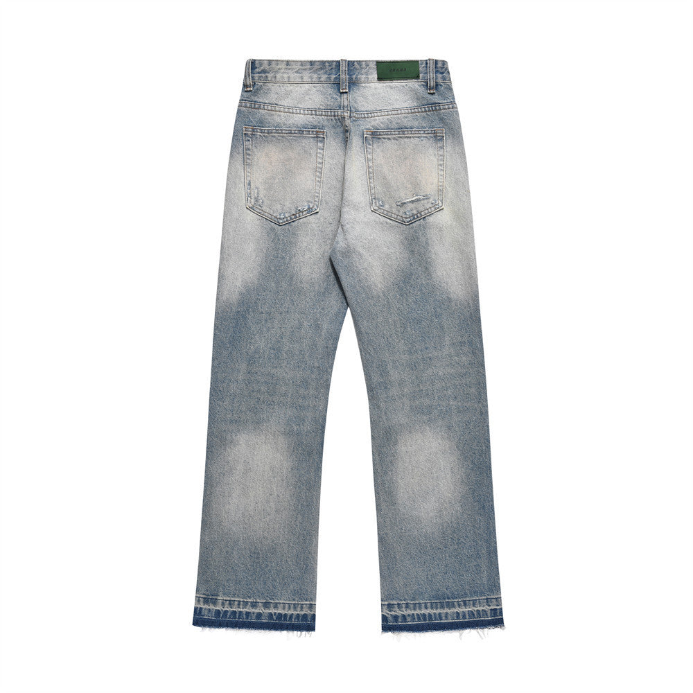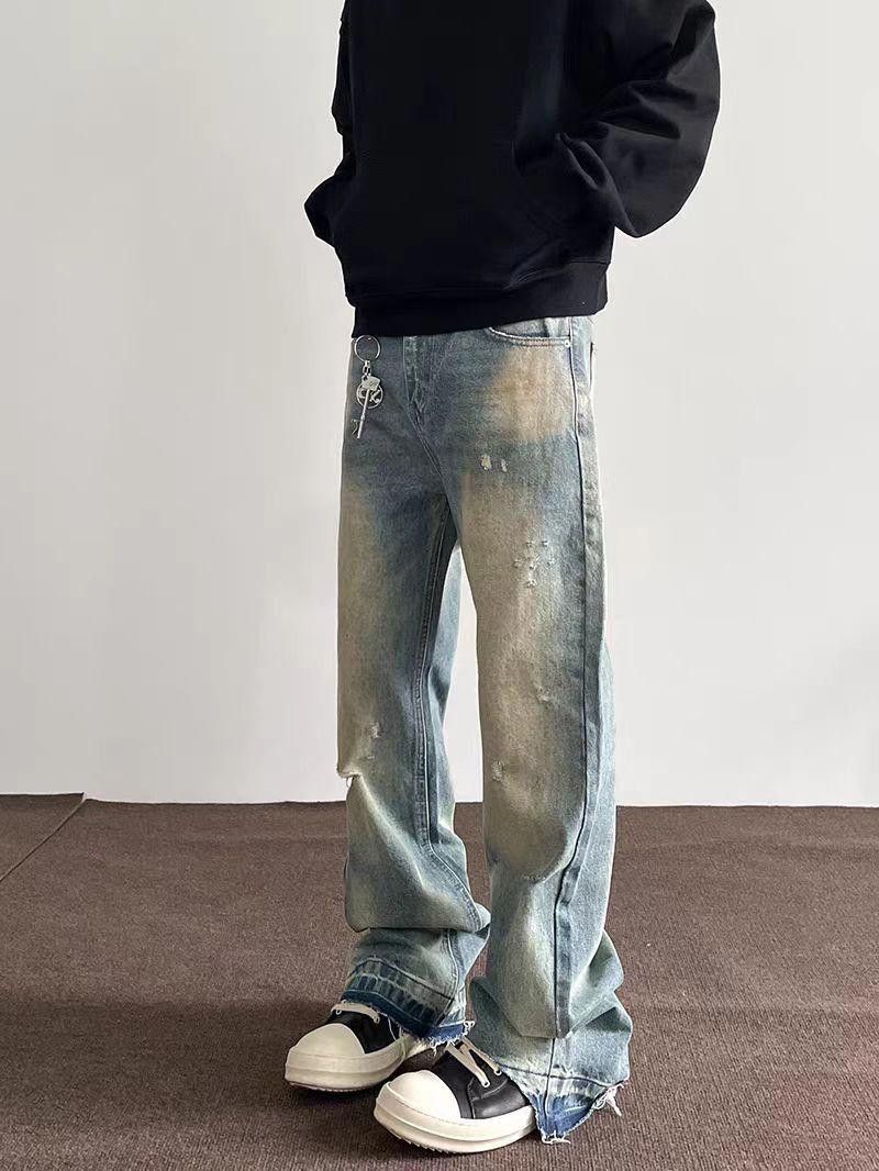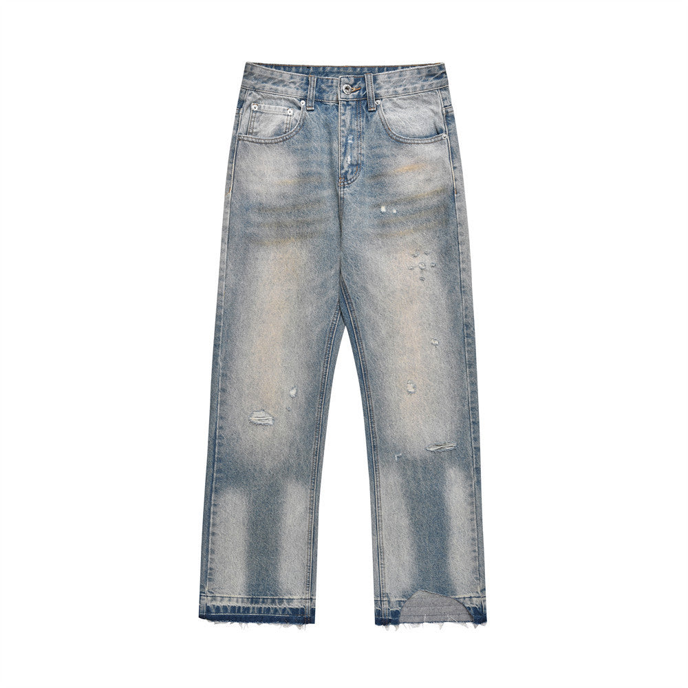 Mud-dyed perfection meets heavy distressing on vintage-washed denim, merging authentic weathered character with street rebellion. The straight-leg silhouette delivers effortless vintage vibes while the unique dyeing process creates one-of-a-kind faded patterns.