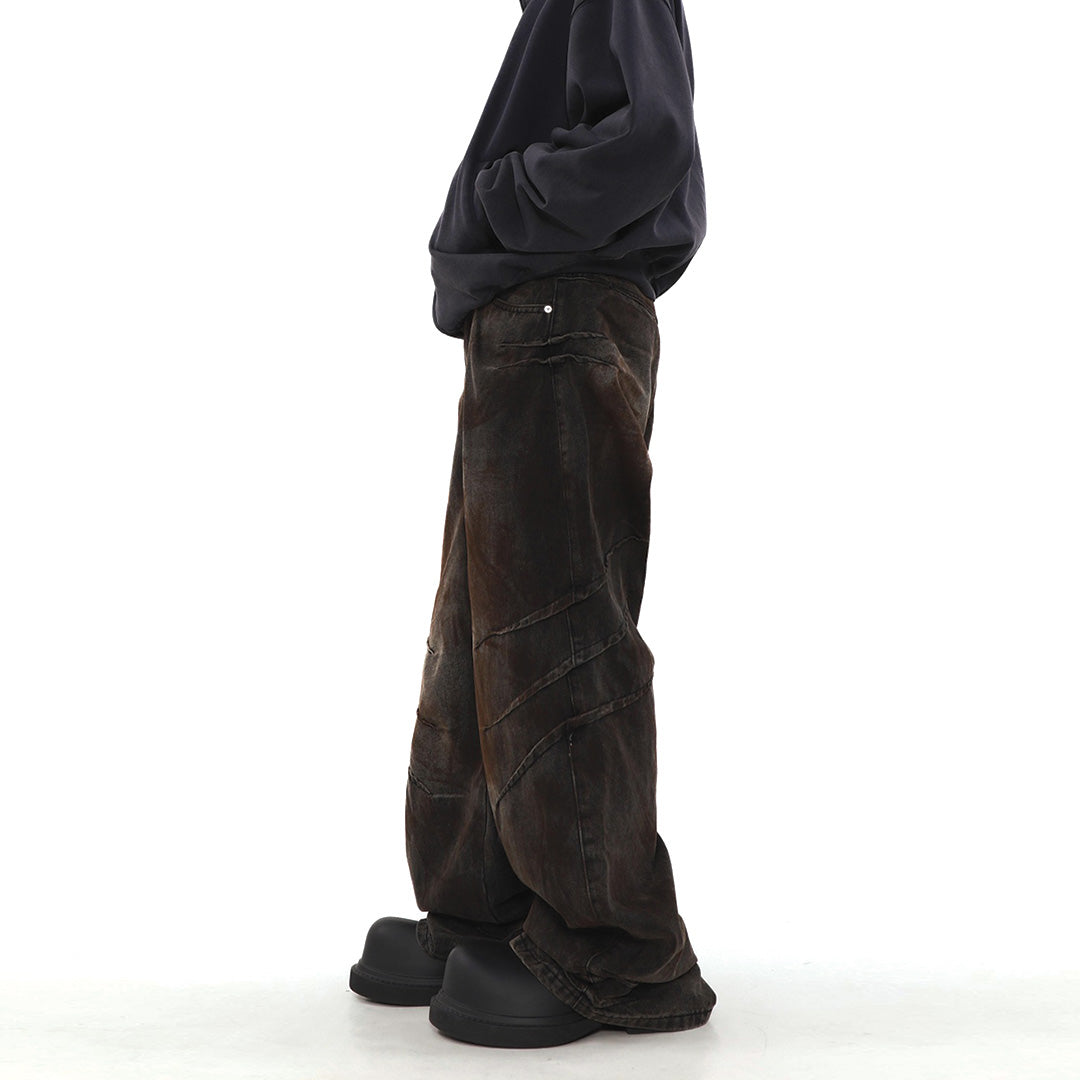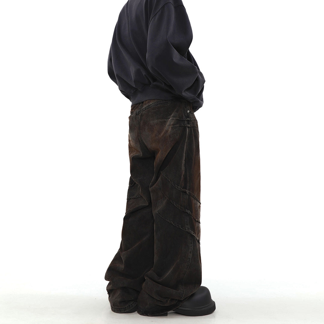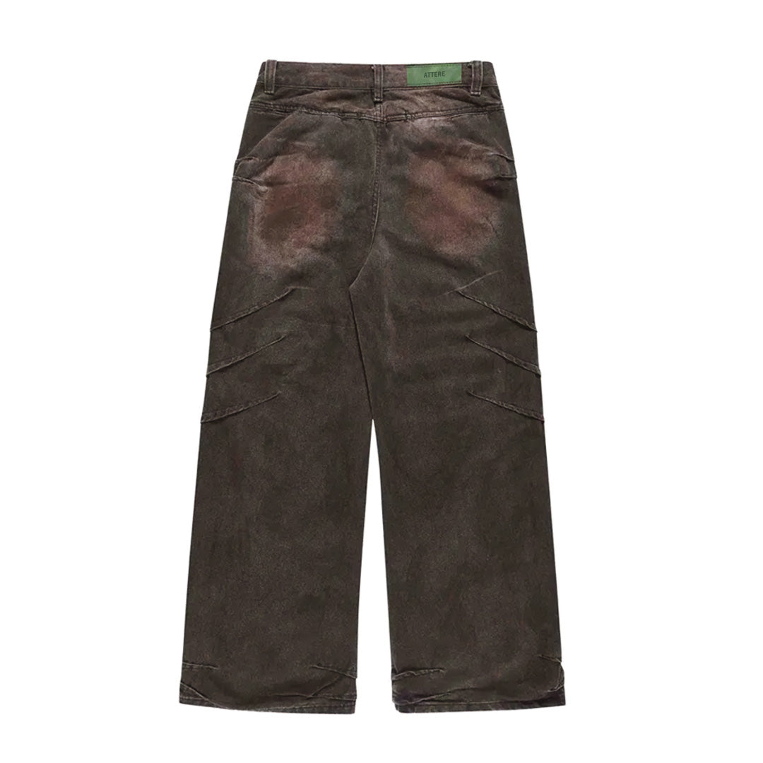 Artisanal mud-gradient wash treatment meets architectural pleated construction in midweight cotton denim built for boundary-pushing daily expression. The earth-tone gradient process creates natural weathered patterns that deepen with wear, while pleated wide-leg panels deliver distinctive movement and visual texture.