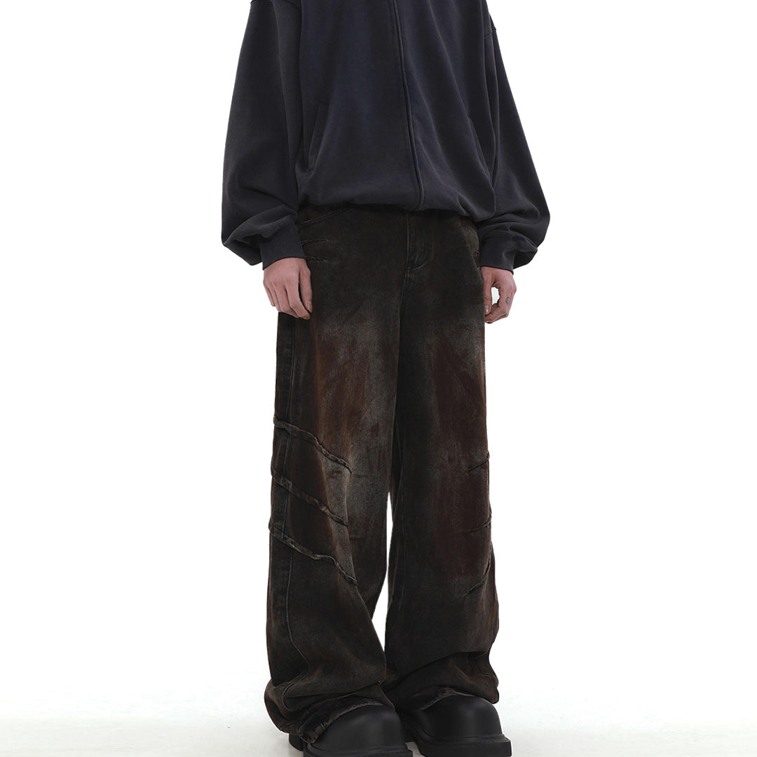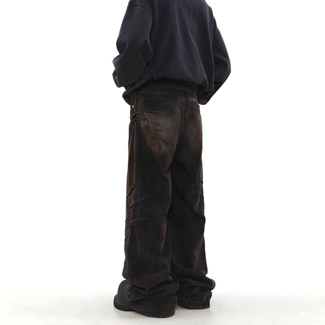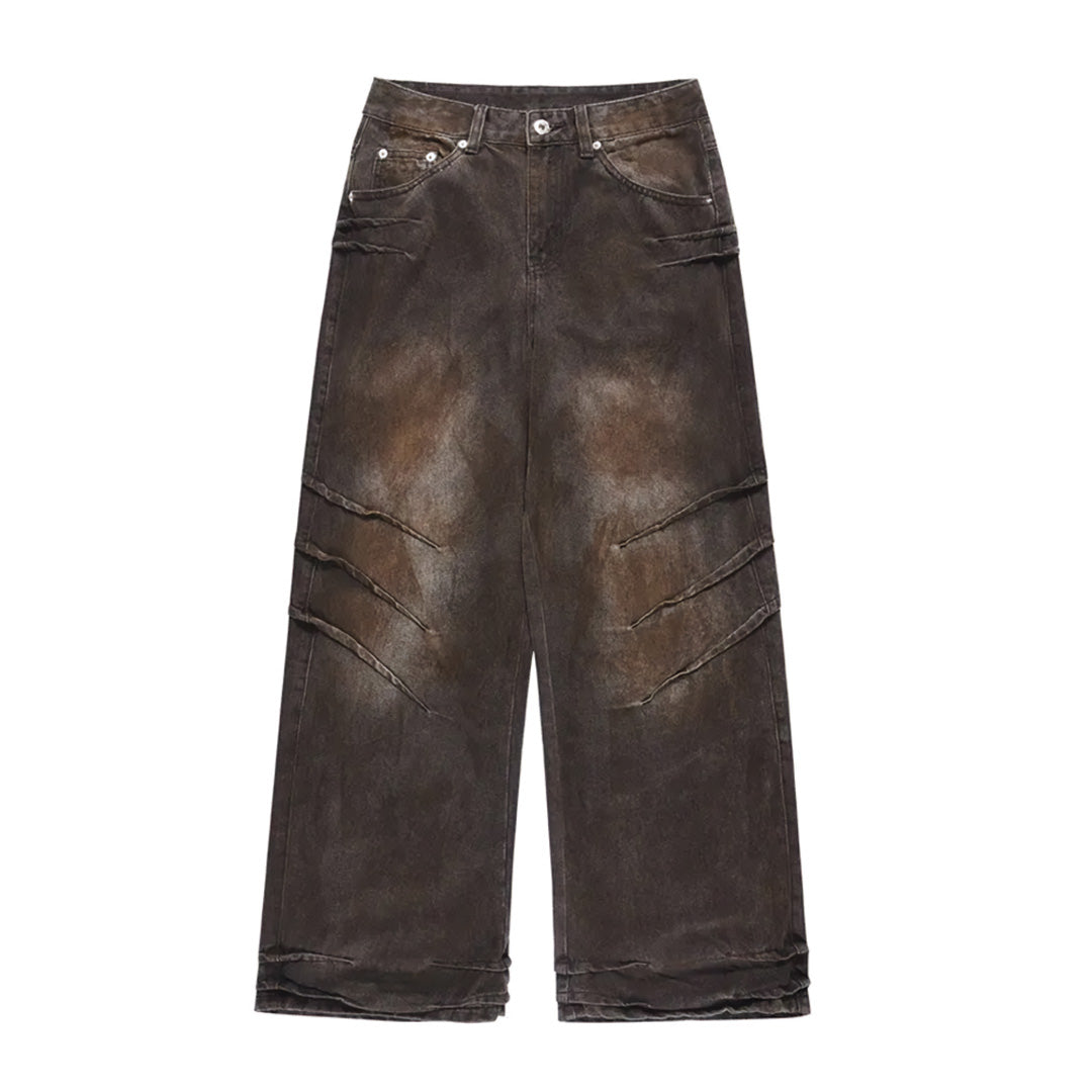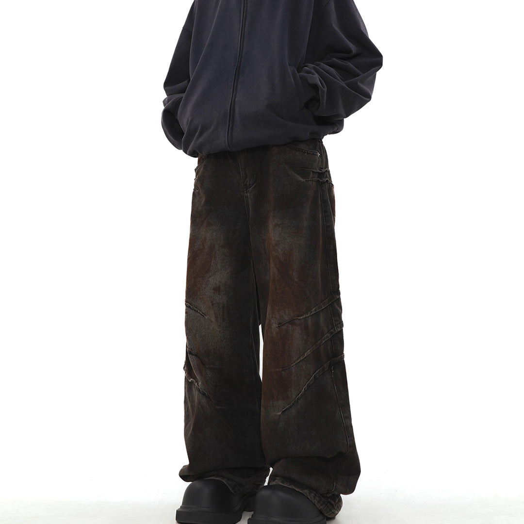 Artisanal mud-gradient wash treatment meets architectural pleated construction in midweight cotton denim built for boundary-pushing daily expression. The earth-tone gradient process creates natural weathered patterns that deepen with wear, while pleated wide-leg panels deliver distinctive movement and visual texture.
