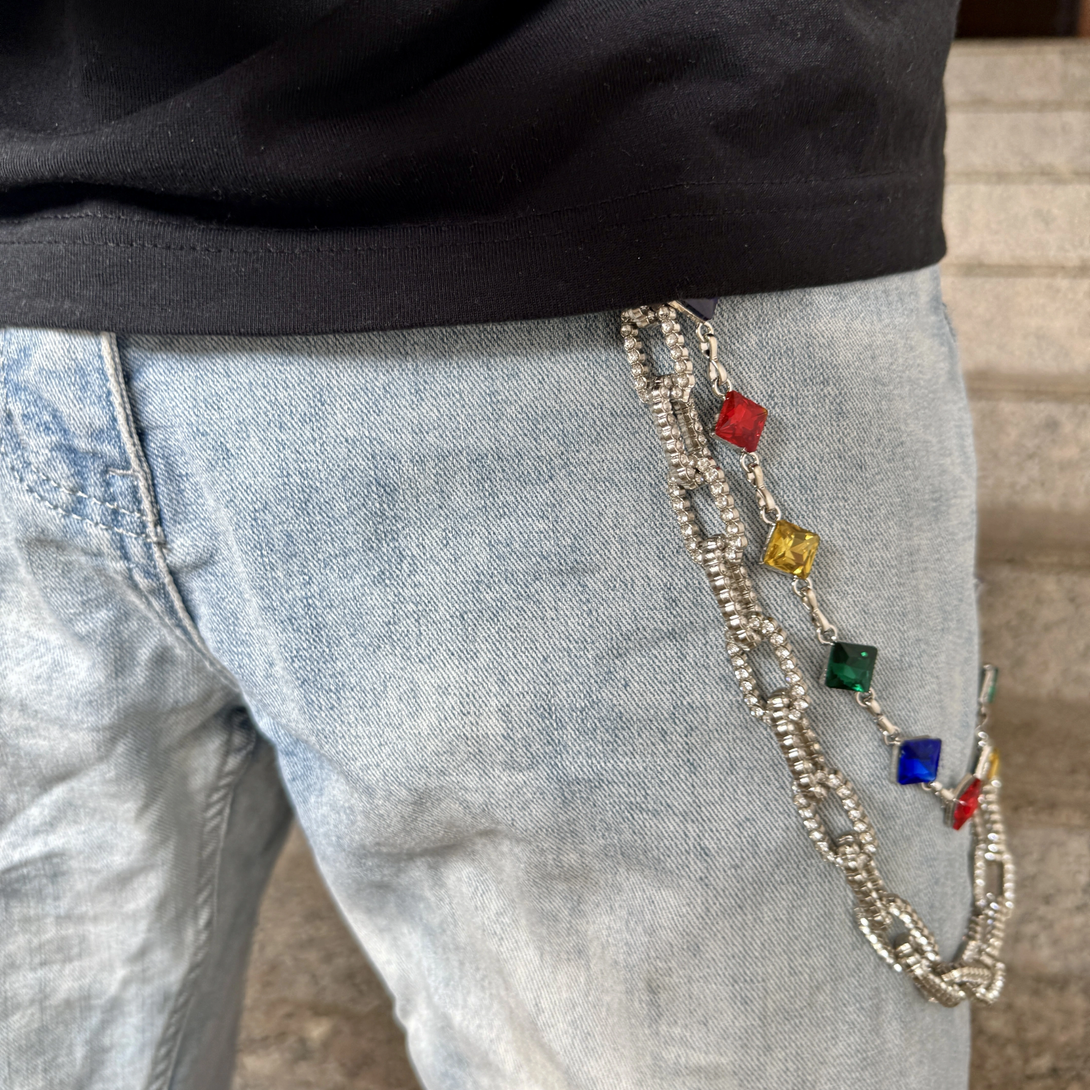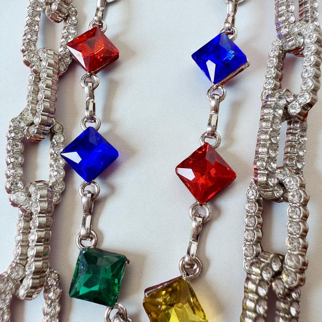 Precision-engineered multi-strand construction featuring strategic cube accents in primary tones. Red, yellow, green, blue—each color positioned with intention across textured metal chains.