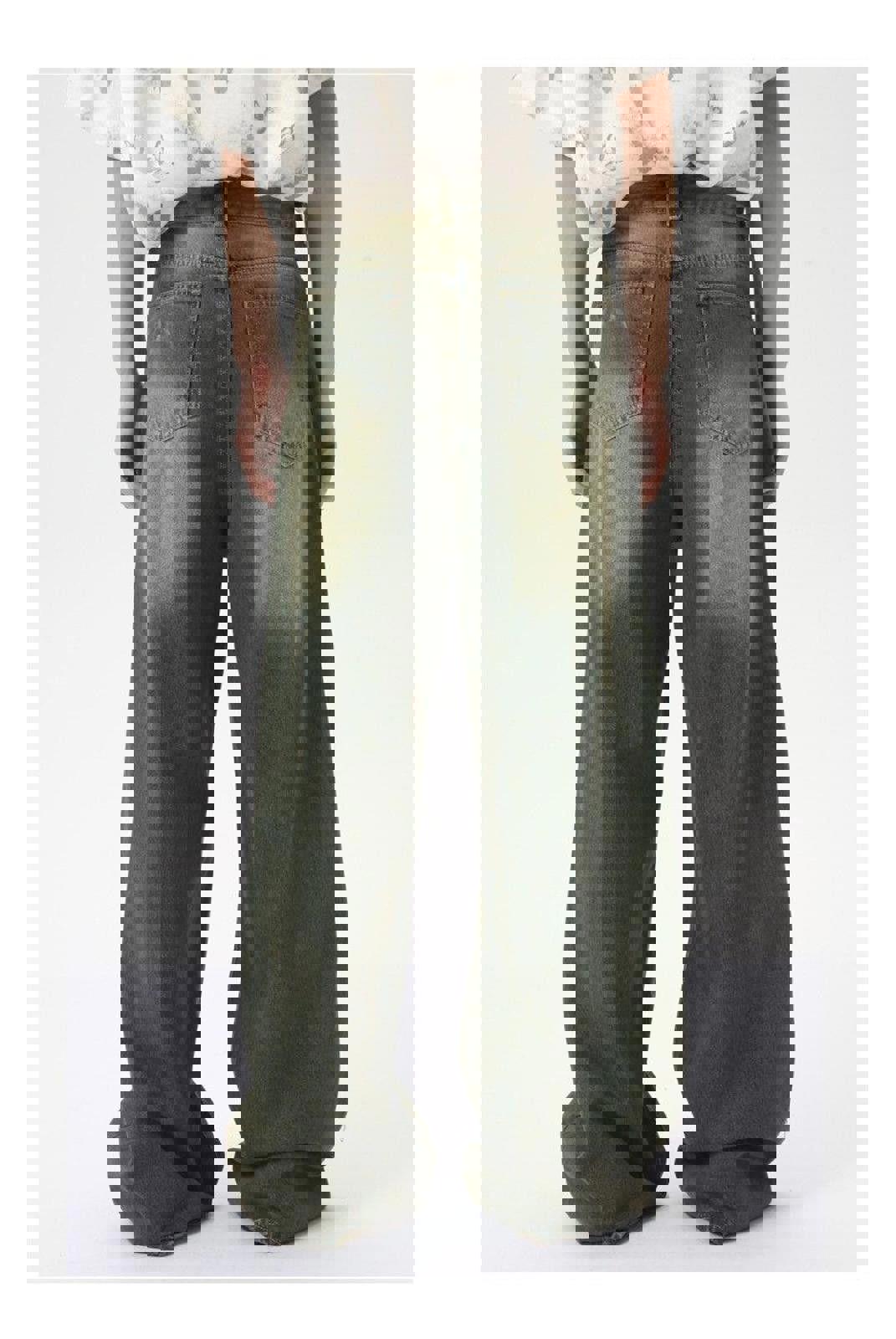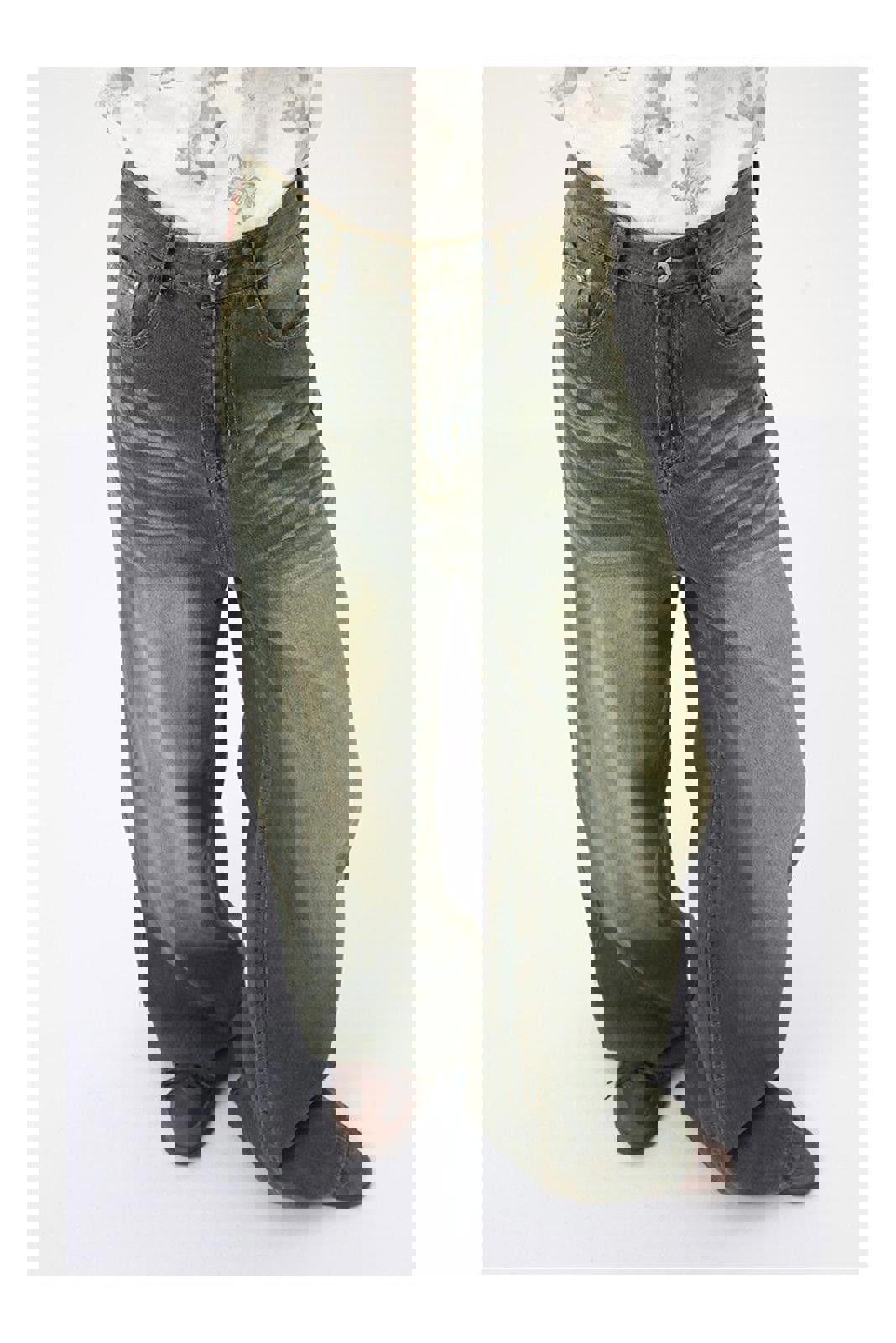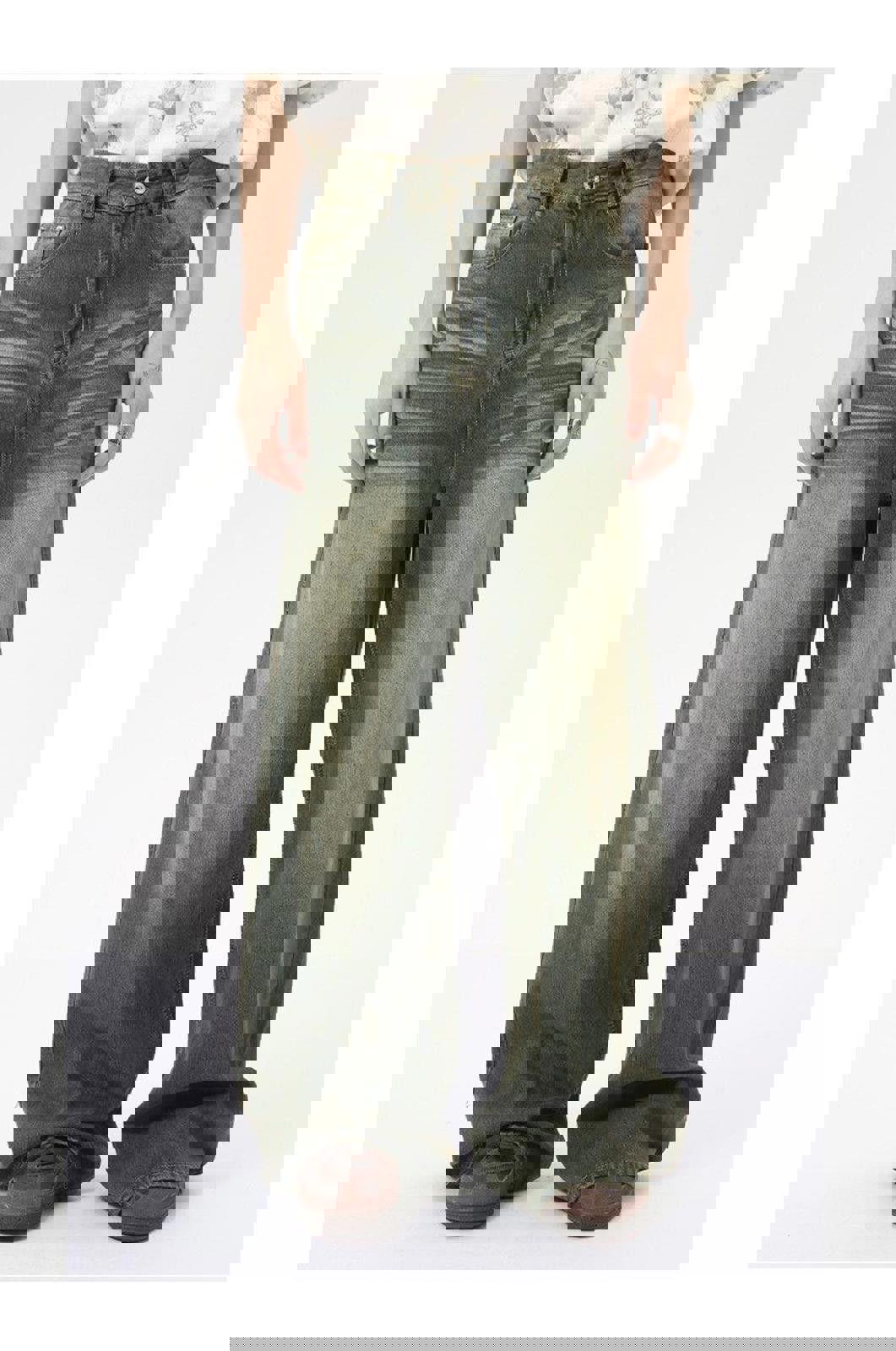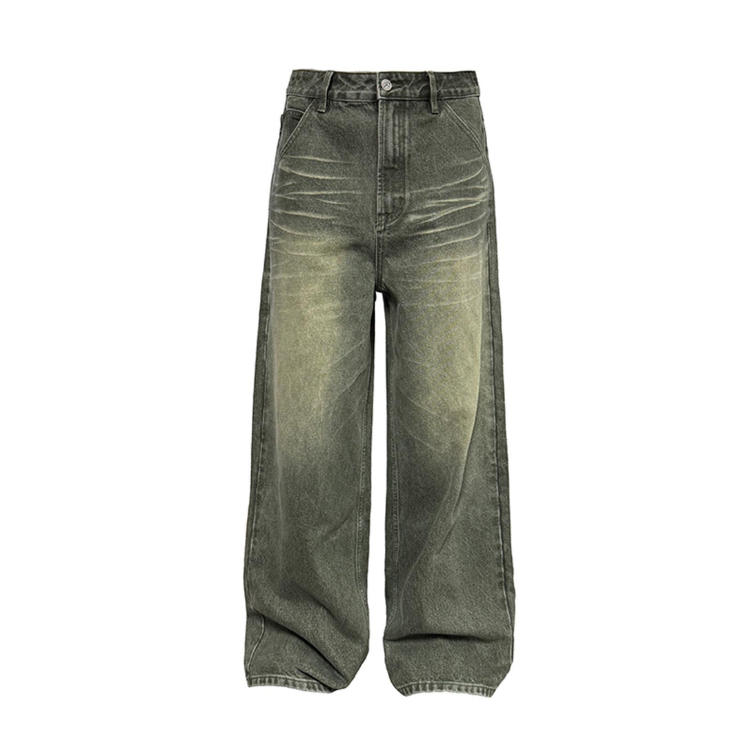 Olive Green Whiskered Baggy Wide Leg Denim Jeans