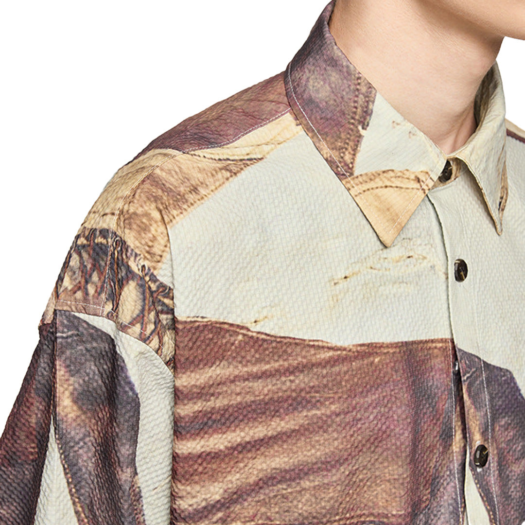Our Patchwork Long Sleeve Shirt is built from lightweight polyester with photorealistic leather patchwork printing designed to honor traditional leatherwork craftsmanship through contemporary textile innovation. The oversized construction and classic turn-down collar create relaxed proportions, while our advanced printing process captures authentic leather textures, grain variations, and natural aging characteristics. Artisanal patchwork aesthetics and earth-tone palette create pieces that merge heritage craft traditions with modern comfort accessibility.