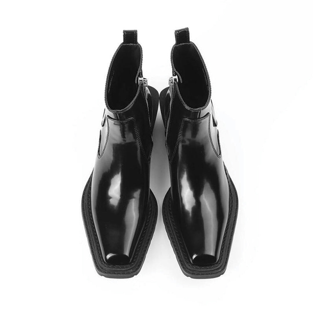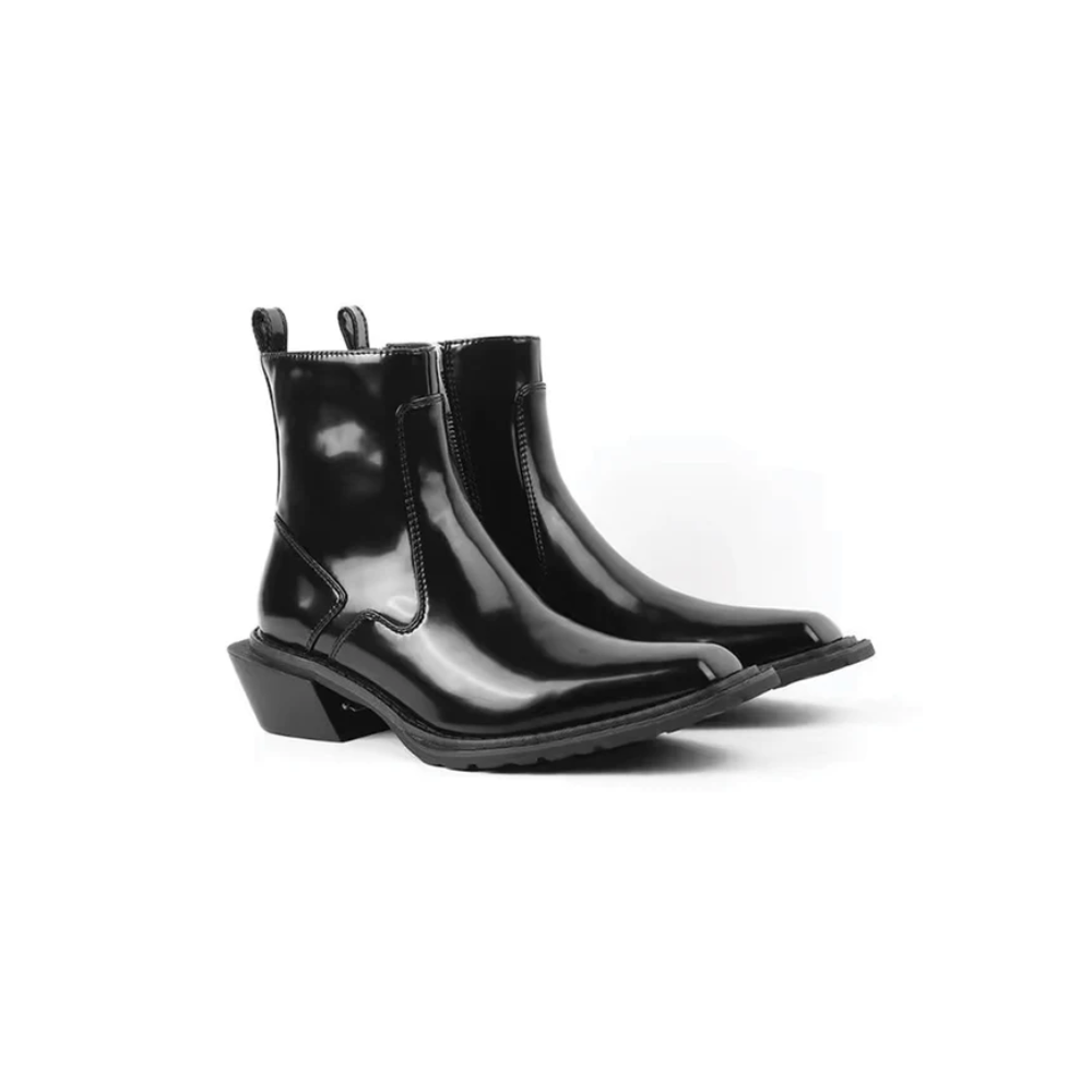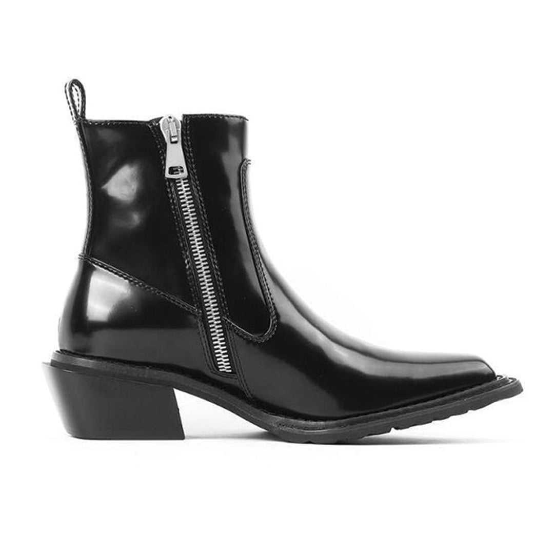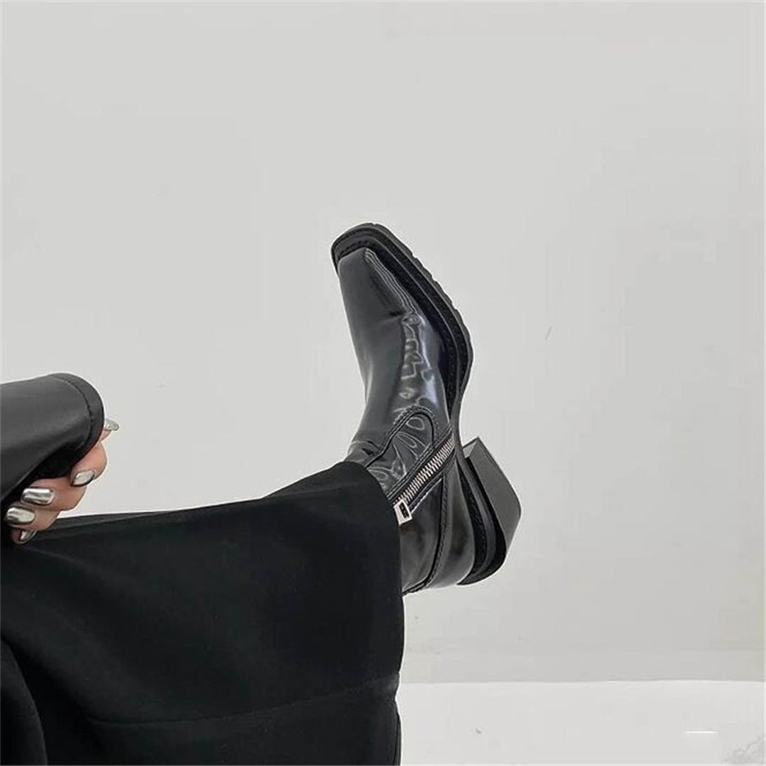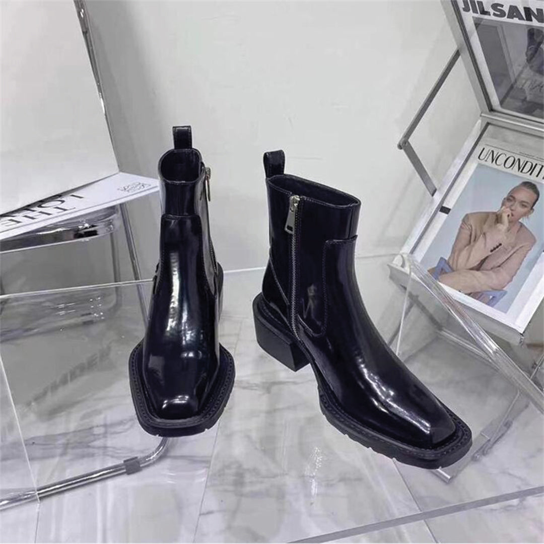 High-gloss patent leather construction meets precision-engineered Chelsea boot architecture across motorcycle-inspired silhouettes, merging rebellious edge with refined daily sophistication. The strategic side zip placement delivers effortless entry while 2-inch block heel engineering and contemporary square toe proportions transform classic moto aesthetics into statement pieces that command attention without compromising all-day comfort.