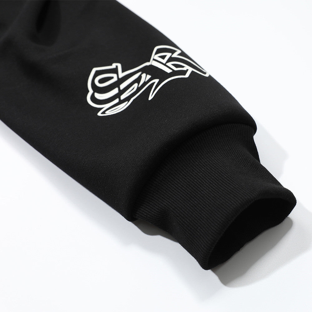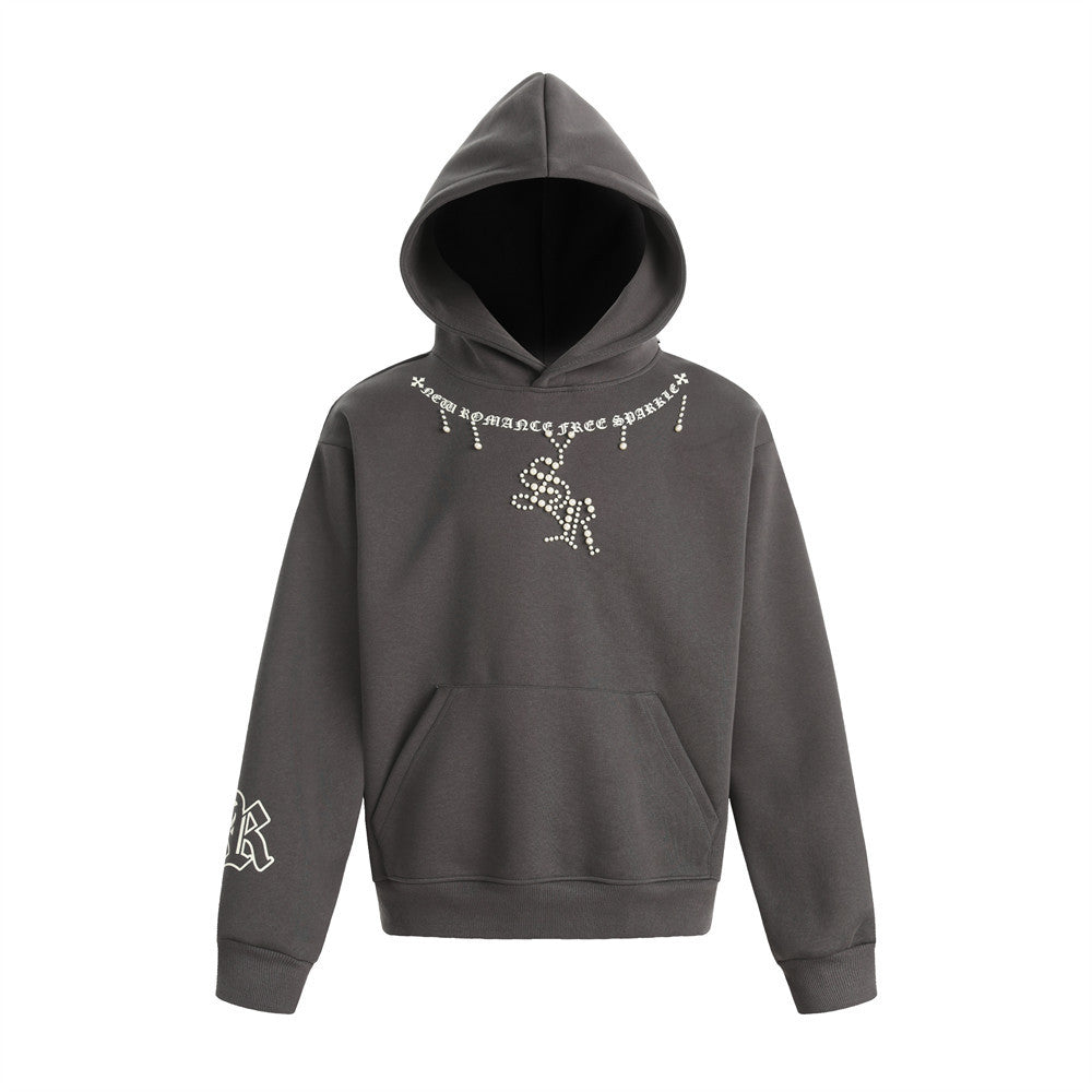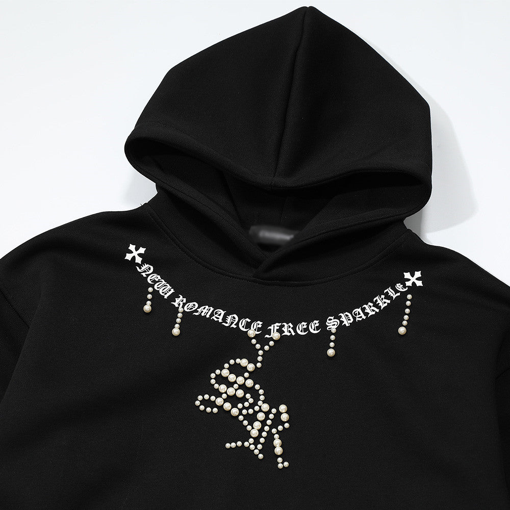 Premium cotton blend construction with hand-applied pearl detailing that transforms sacred symbols into street luxury. "Love Romance Free Spirit" placement speaks to those who understand that devotion and style aren't contradictions. Loose-fit architecture with kangaroo pocket functionality.