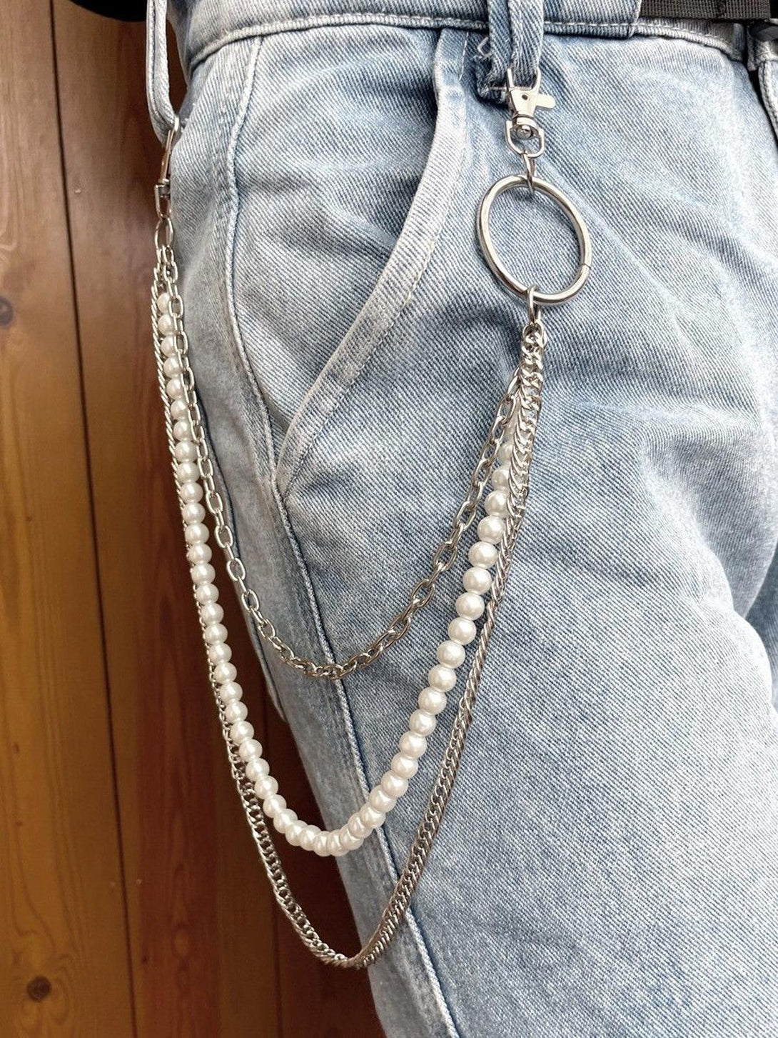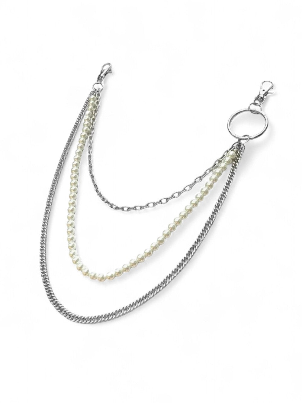 Layered pearl and metal chain construction meets premium alloy hardware in a multi-loop design built for bold daily expression. The combination of smooth pearl beading and curb chain elements creates visual texture that complements any denim silhouette, while dual-clip attachment ensures secure wear through every urban adventure.