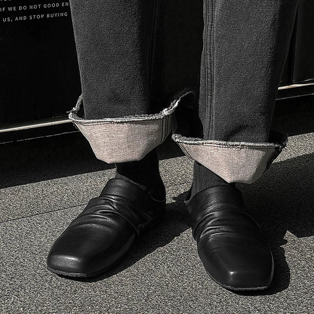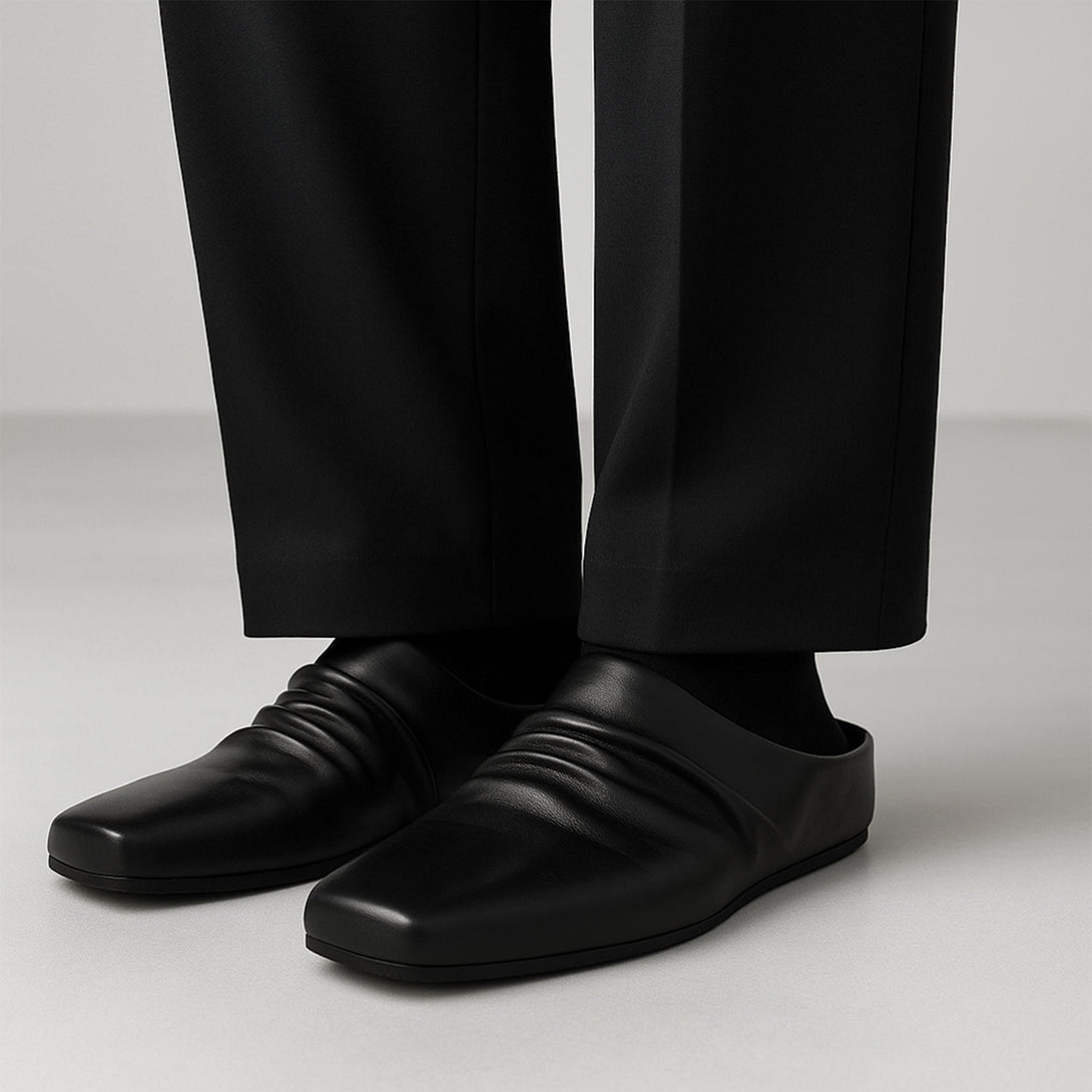 Soft leather pleating meets precision-engineered slip-on construction across genuine leather uppers, merging quiet confidence with effortless daily functionality. The strategic gathered design delivers textural interest while square toe proportions and minimal silhouette transform classic mule aesthetics into versatile essentials that bridge relaxed tailoring with off-duty moments.