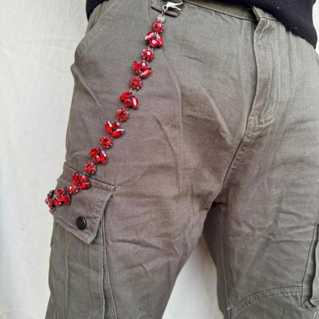 When luxury meets rebellion. Premium crystal construction channels pigeon blood ruby intensity across silver-tone architecture that transforms functional chains into jewelry statements. Each oval stone surrounded by brilliant pavé creates visual rhythm that catches light and commands attention. Built for those who understand that accessories should never apologize for their presence.