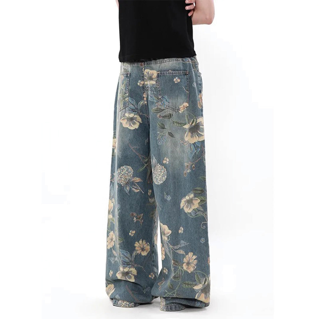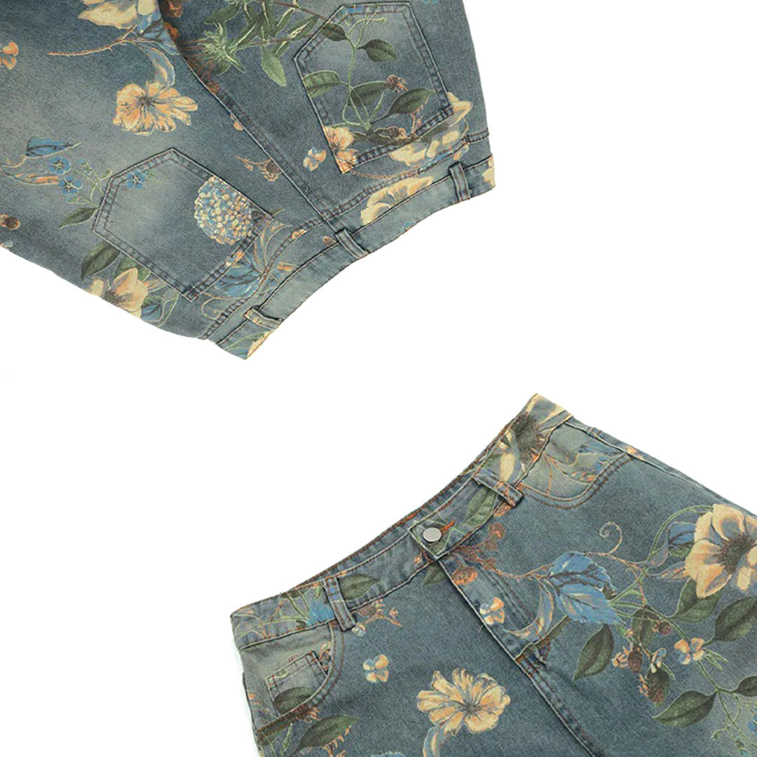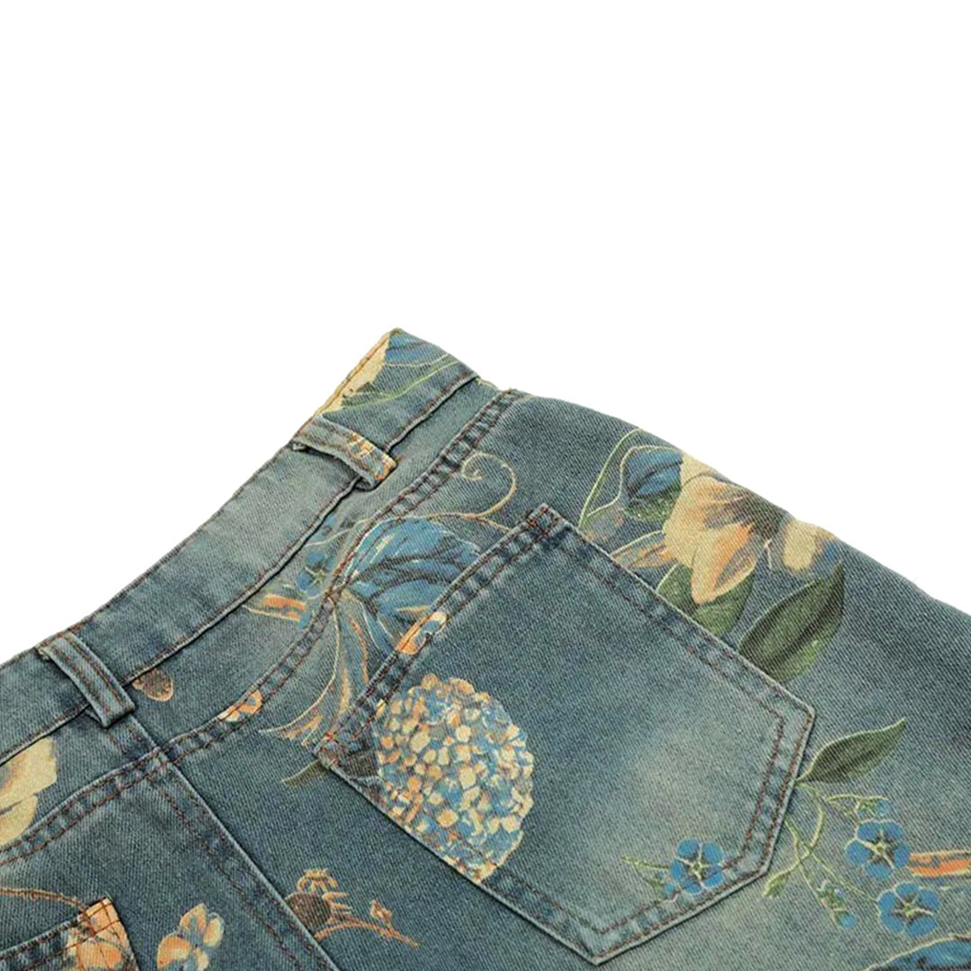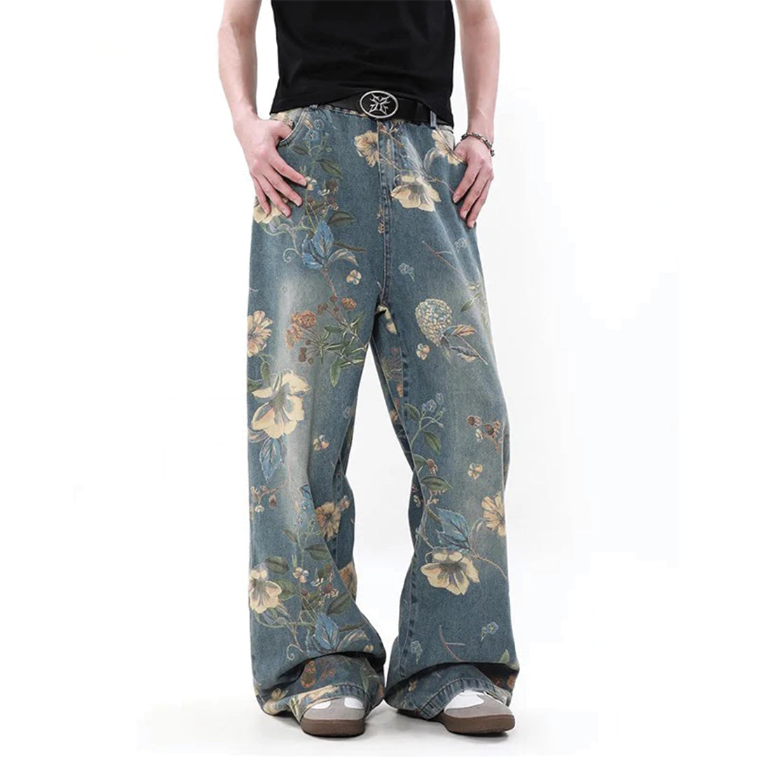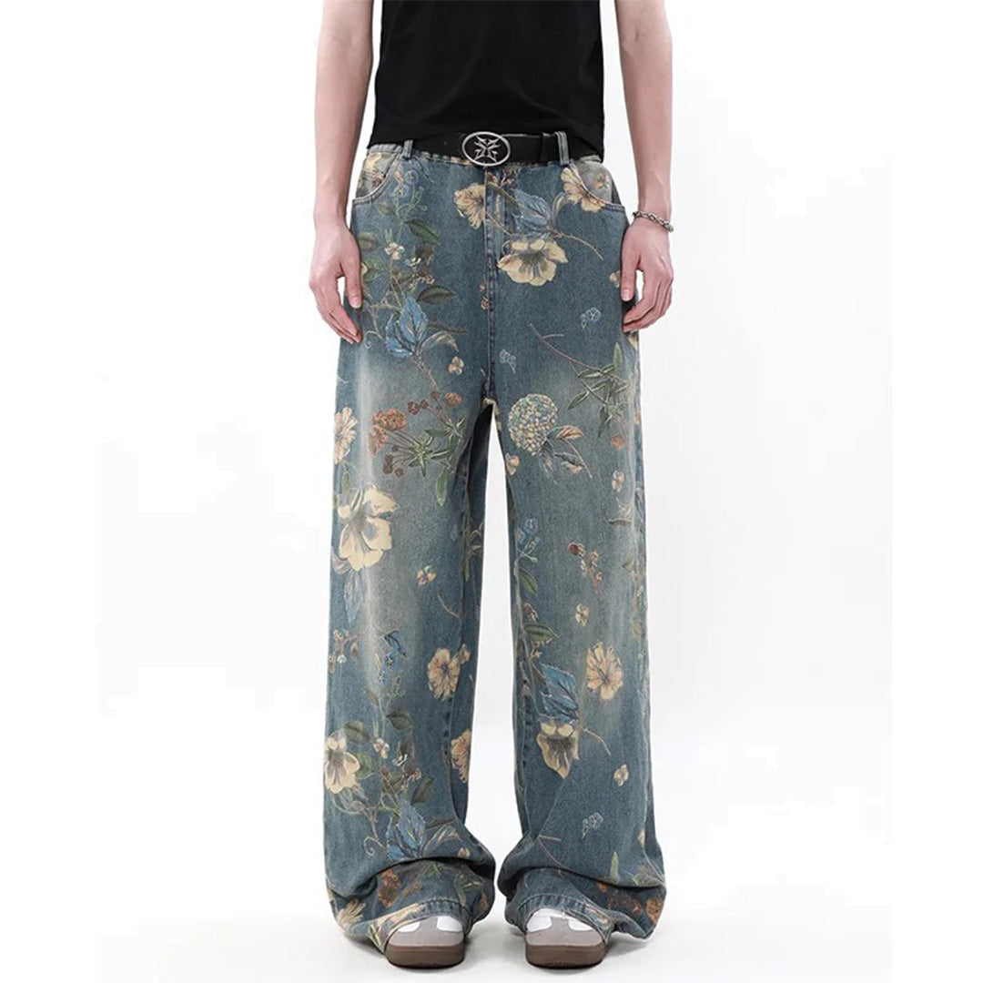 Vintage botanical printing meets expertly washed cotton denim in a relaxed wide-leg construction built for nostalgic daily expression. The all-over floral pattern integration and baggy silhouette create pieces that blend vintage charm with contemporary comfort, developing subtle character through regular wear.