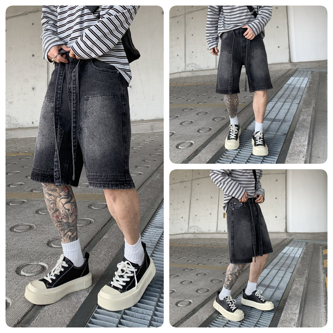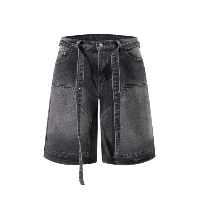 Rhinestone Wide Leg Belt-Tie Jean Shorts