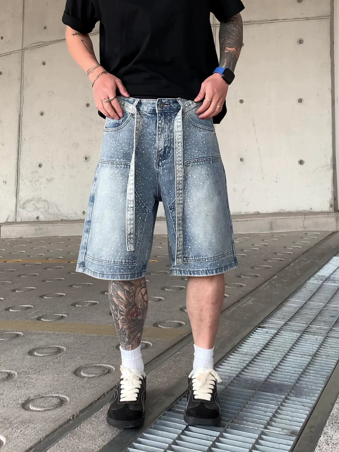 Premium denim construction with all-over rhinestone placement and integrated belt-tie system. Wide-leg architecture with strategic pocket placement for those who understand that function and flash aren't contradictions. Each stone positioned with intention, every tie calculated for impact.