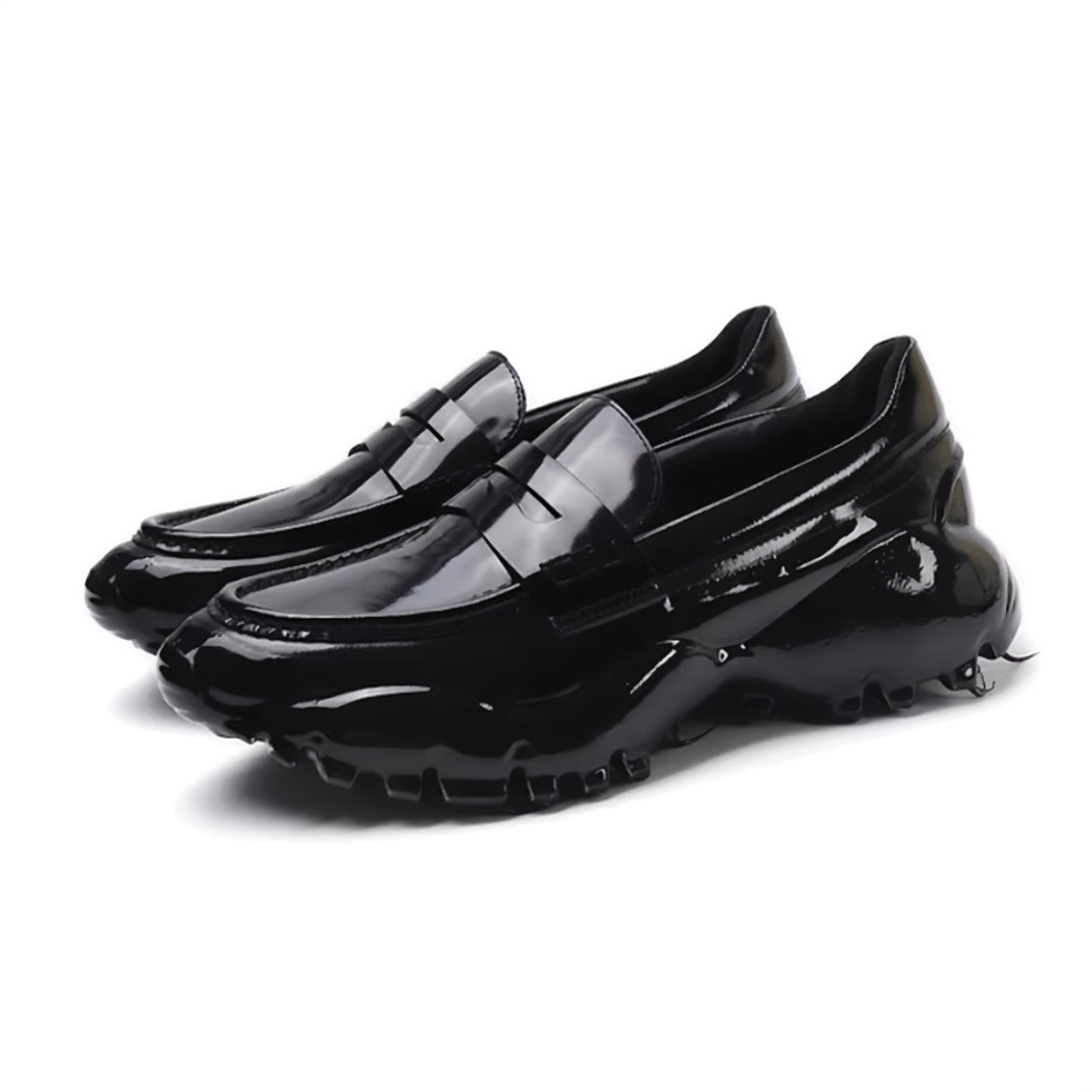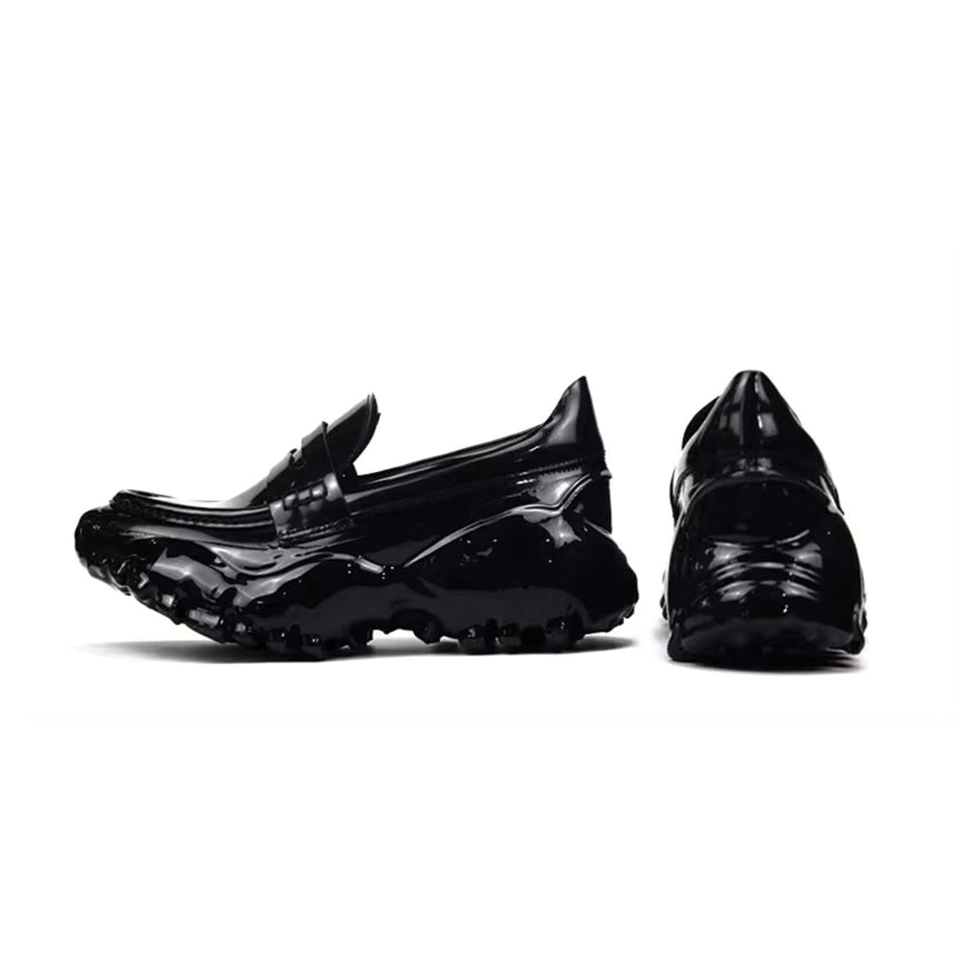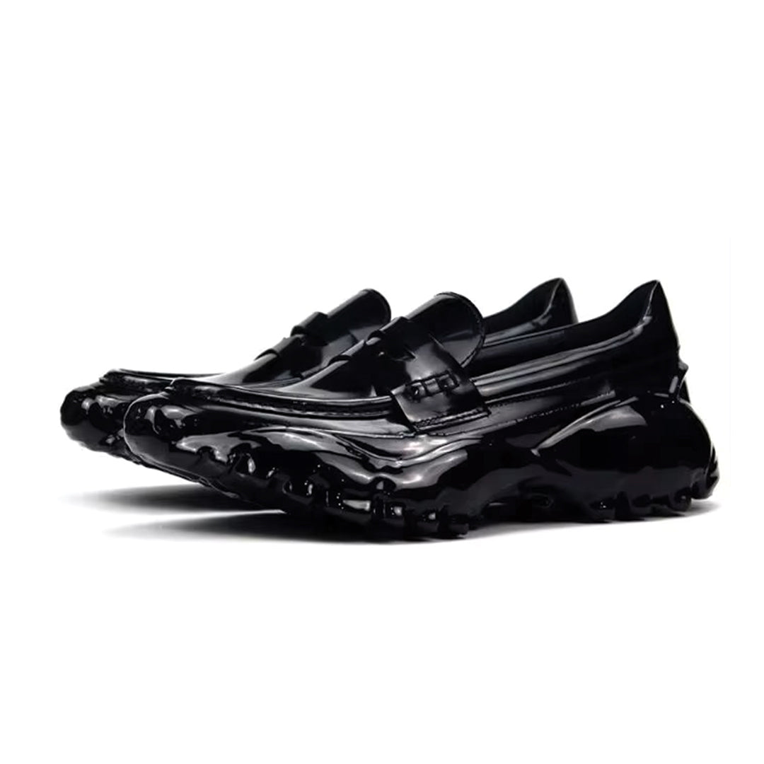 When reality becomes liquid art. Premium leather construction meets gravity-defying sole architecture that appears to defy physics itself. Classic penny loafer silhouettes dissolve into sculptural masterpieces where traditional footwear rules simply don't apply. Molten sole design creates visual drama that stops conversations, built for those who understand that true innovation requires the courage to be completely misunderstood.