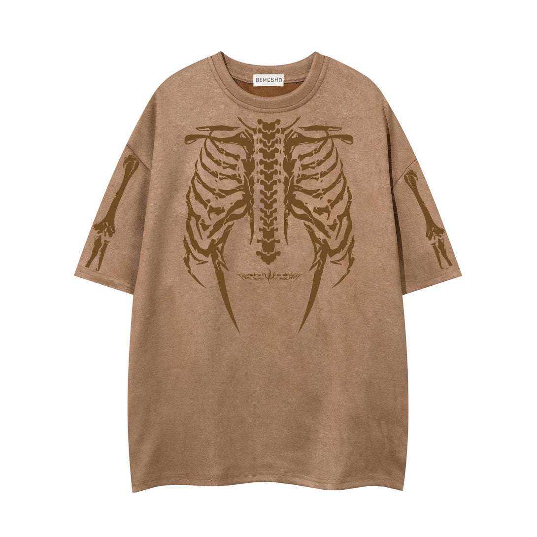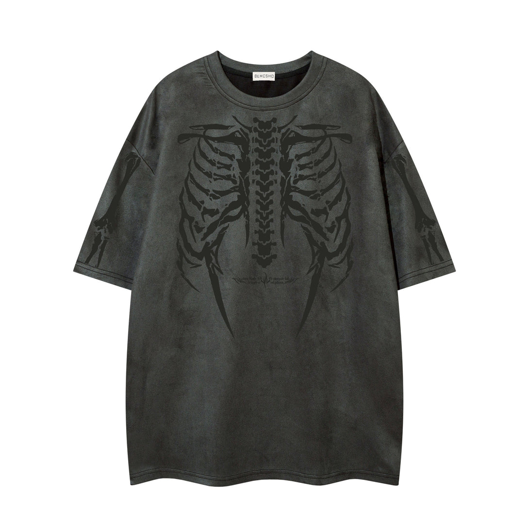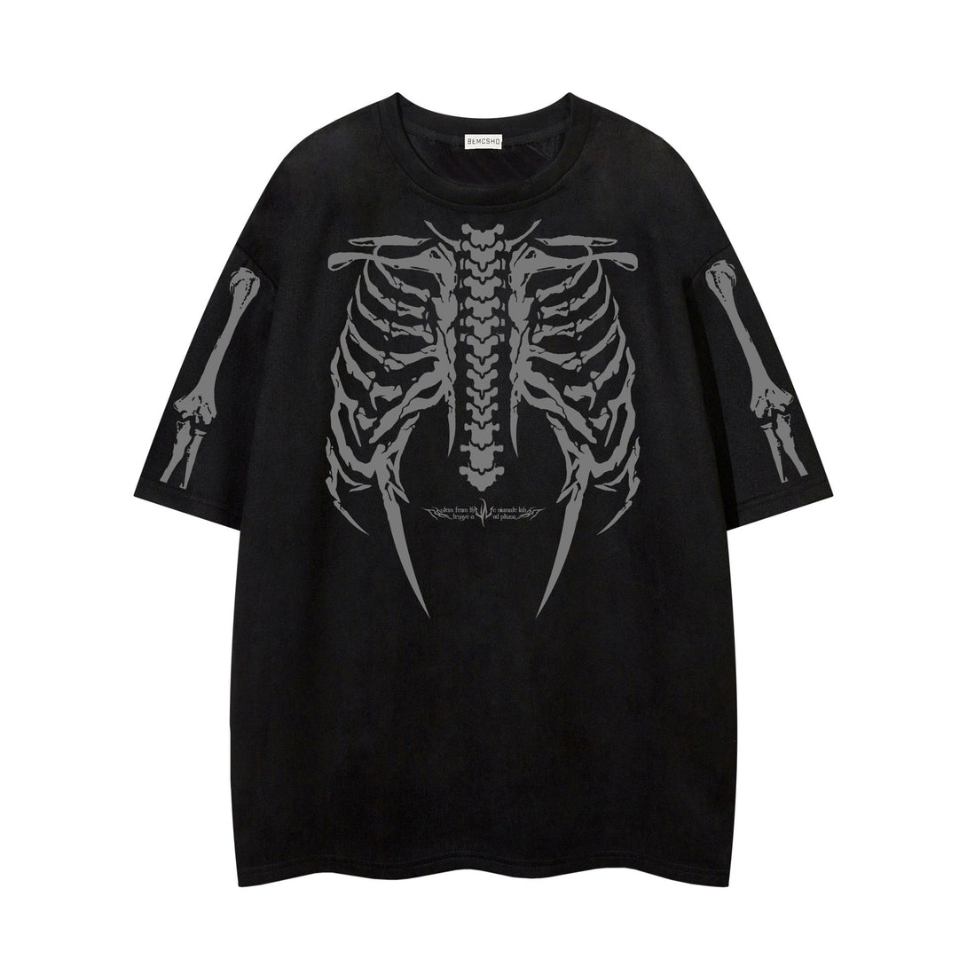 Anatomical rebellion meets dark streetwear in detailed skeleton graphics, merging gothic imagery with everyday comfort. The oversized silhouette delivers effortless edge while rib cage and bone sleeve details create authentic macabre character.