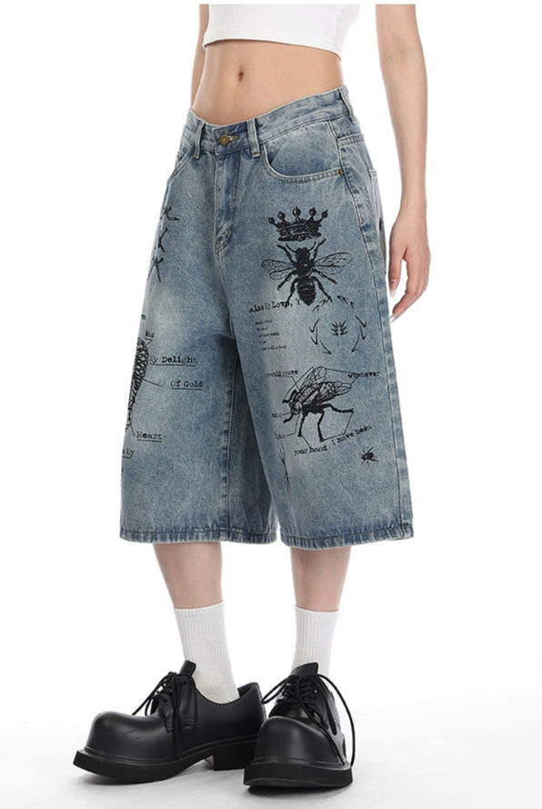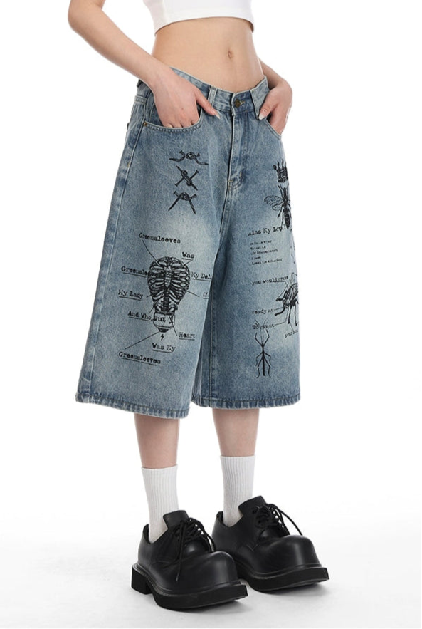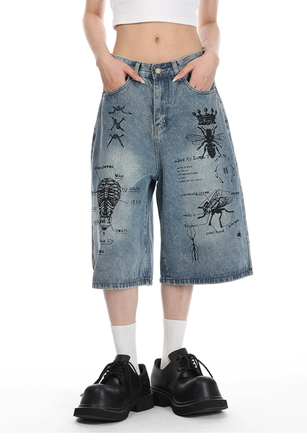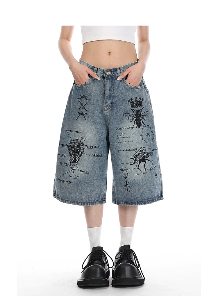 Product information: Spider Graphic Print Wide Leg Cropped Jeans - Cotton Denim