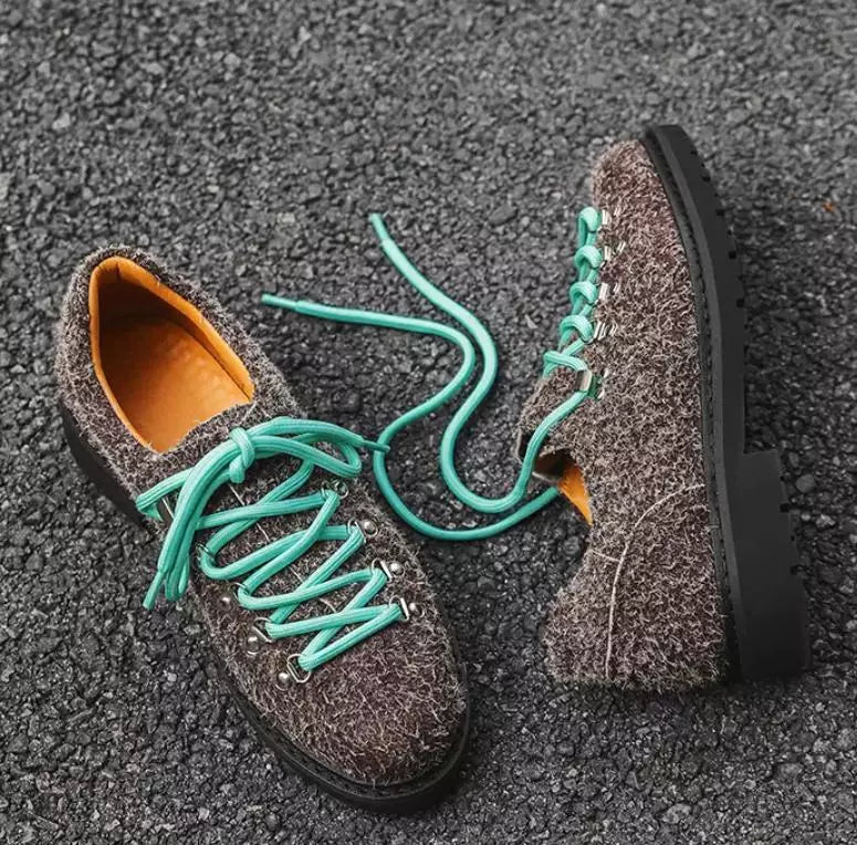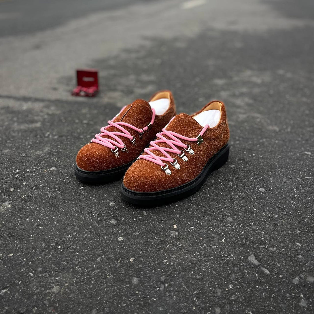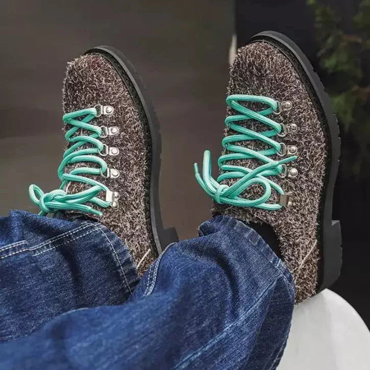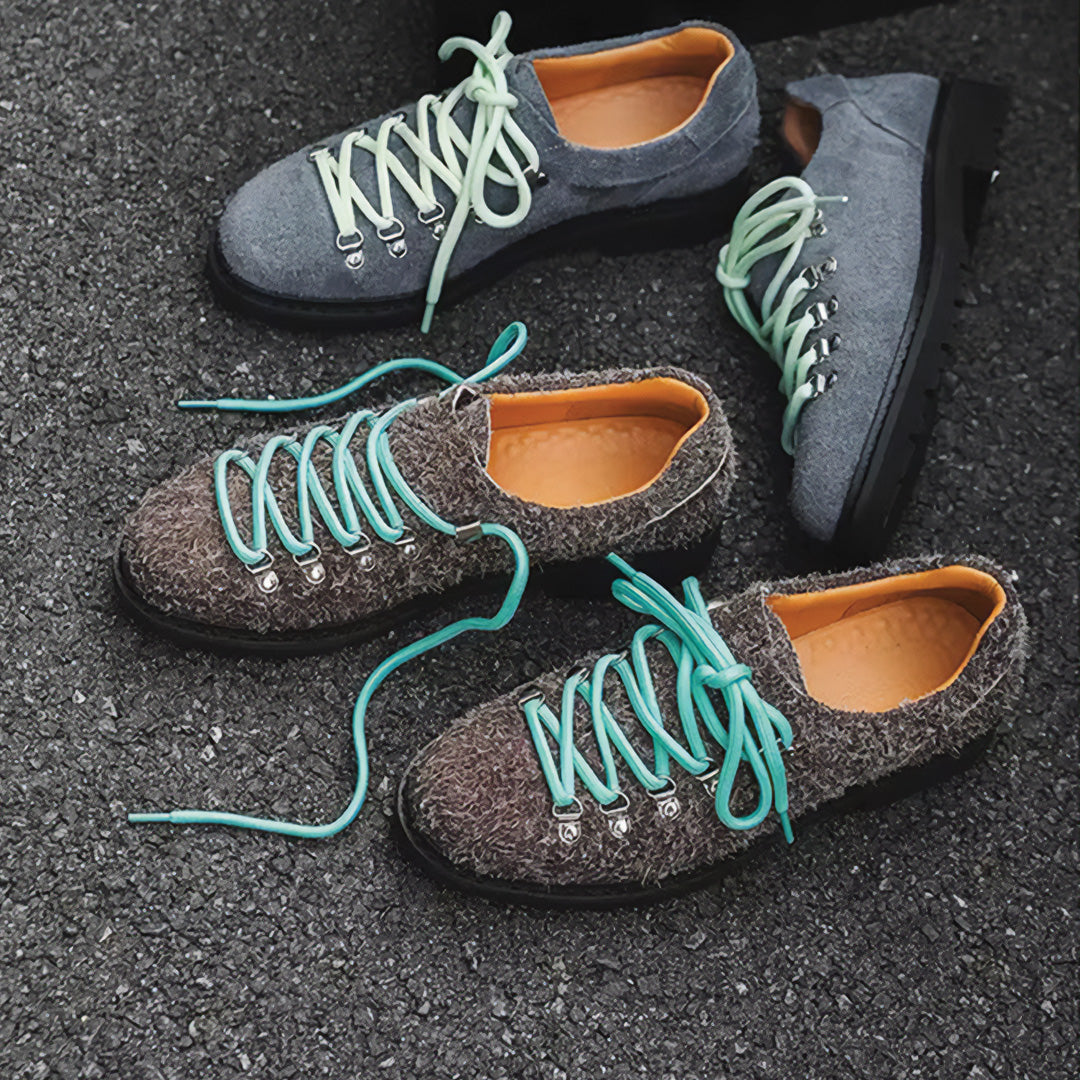 When texture becomes statement. Premium shag-textured uppers meet alpine-inspired hardware across bold color contrasts that refuse to whisper. Mountaineering-grade eyelet systems anchor vibrant lacing while aggressive lug soles ground each step in unwavering traction. These aren't shoes that blend—they're conversations starters built for those who understand that authentic style demands authentic materials.
