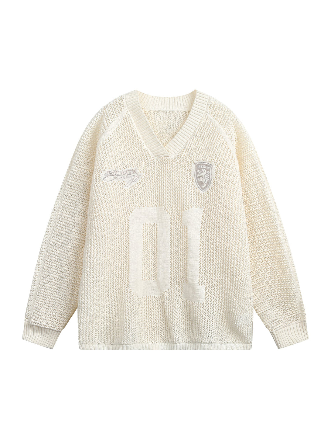 Our oversized varsity sweater is built from chunky cotton knit with precision-perforated construction designed for athletic-inspired styling and enhanced breathability. The deep V-neck and loose-fit proportions create comfortable layering potential while maintaining structured texture, while the contrast numbering and logo patches develop authentic varsity character that celebrates classic athletic heritage. Pullover styling, wrinkle-resistant finishing, and strategic perforation zones ensure functional performance that transitions seamlessly from casual comfort to statement streetwear.