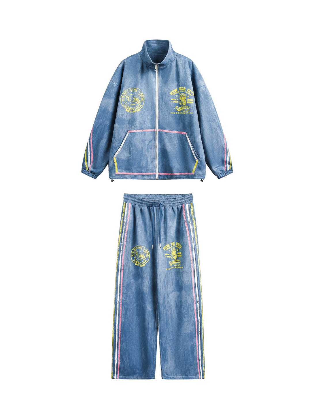 Our Vintage Athletic Tracksuit Set is built from performance polyester blend with vintage wash treatment designed for athletic comfort and retro streetwear authenticity. The two-piece coordinated set features rainbow stripe detailing and collegiate graphics that celebrate vintage athletic culture, while the polyester-spandex construction ensures shape retention and moisture management for active wear. Stand-up collar and elastic waistband provide comfortable fit, while wrinkle-resistant treatment ensures low-maintenance care for busy lifestyles.