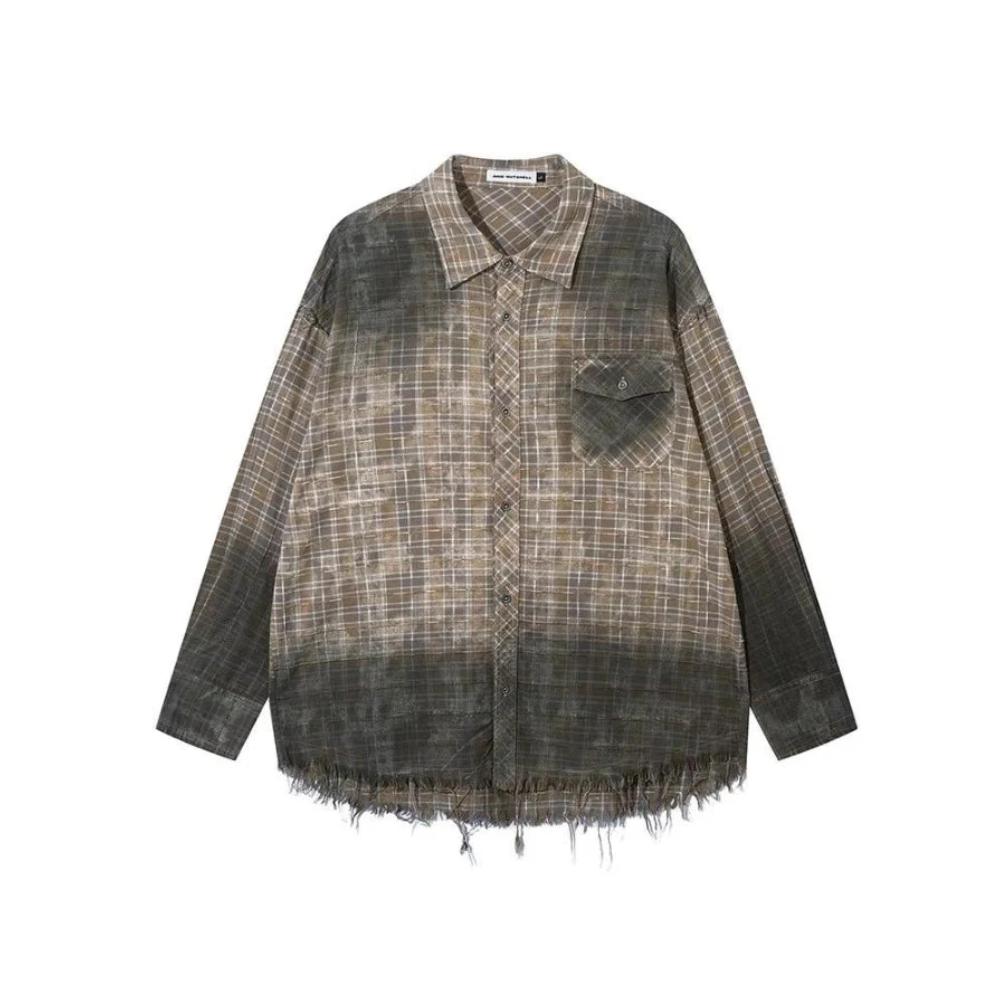 Our Washed Distressed Plaid Utility Shirt is a relaxed-fit top piece, crafted from 100% cotton with controlled distressing that includes gradient wash processing and frayed hem construction for enhanced vintage authenticity. It's cut with a loose silhouette through the body with structured collar construction and button closure system, and features strategic distressed treatment with controlled fade distribution applied through precision aging techniques. Custom Vapor hardware and bartacked stress points lend signature durability finishes.