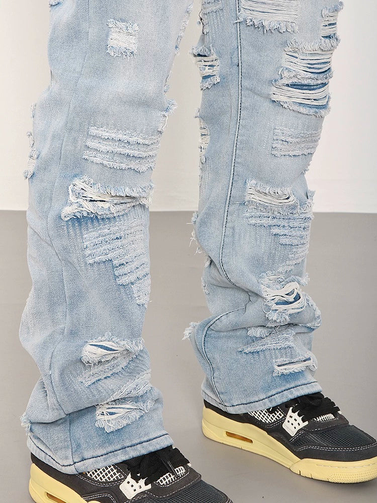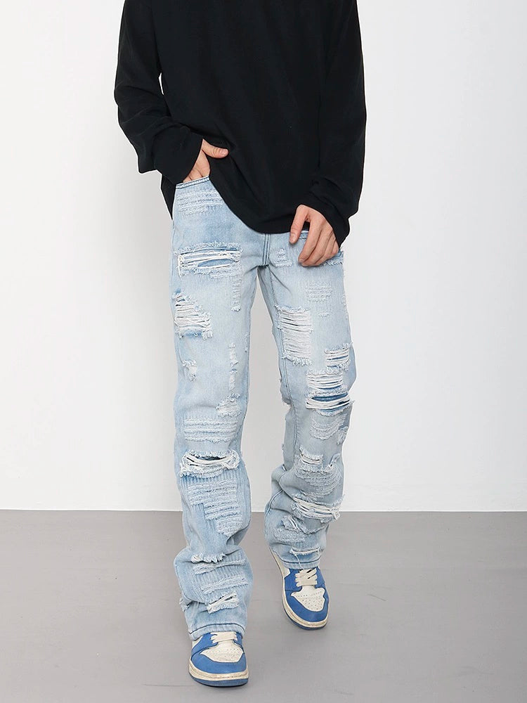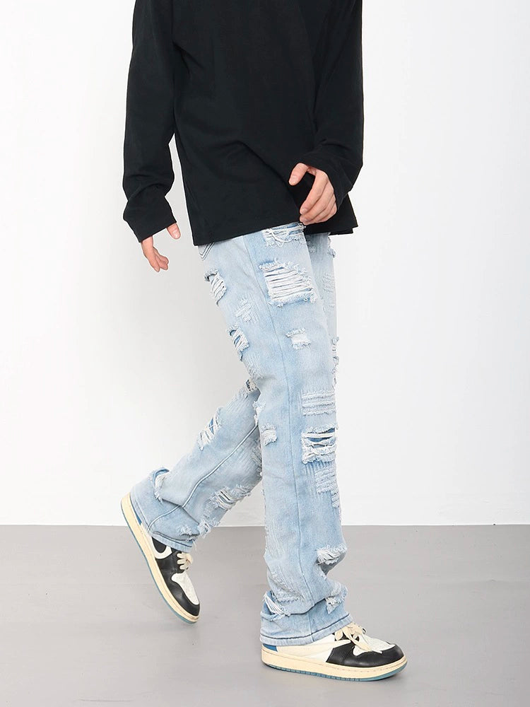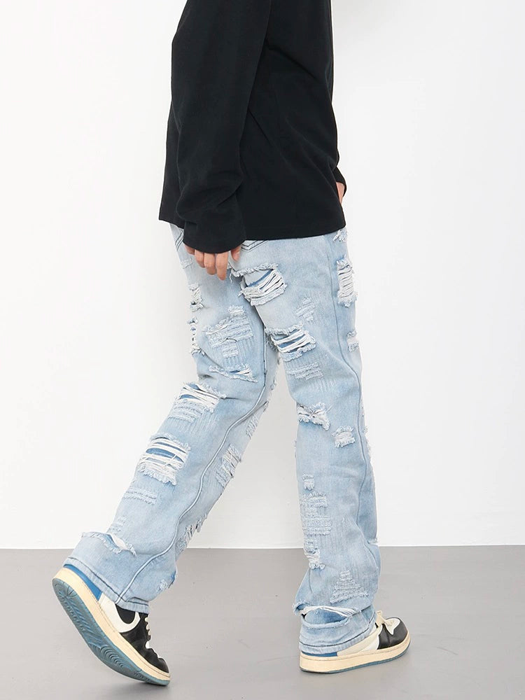 - Bold distressed and patchwork detailing makes each pair visually unique